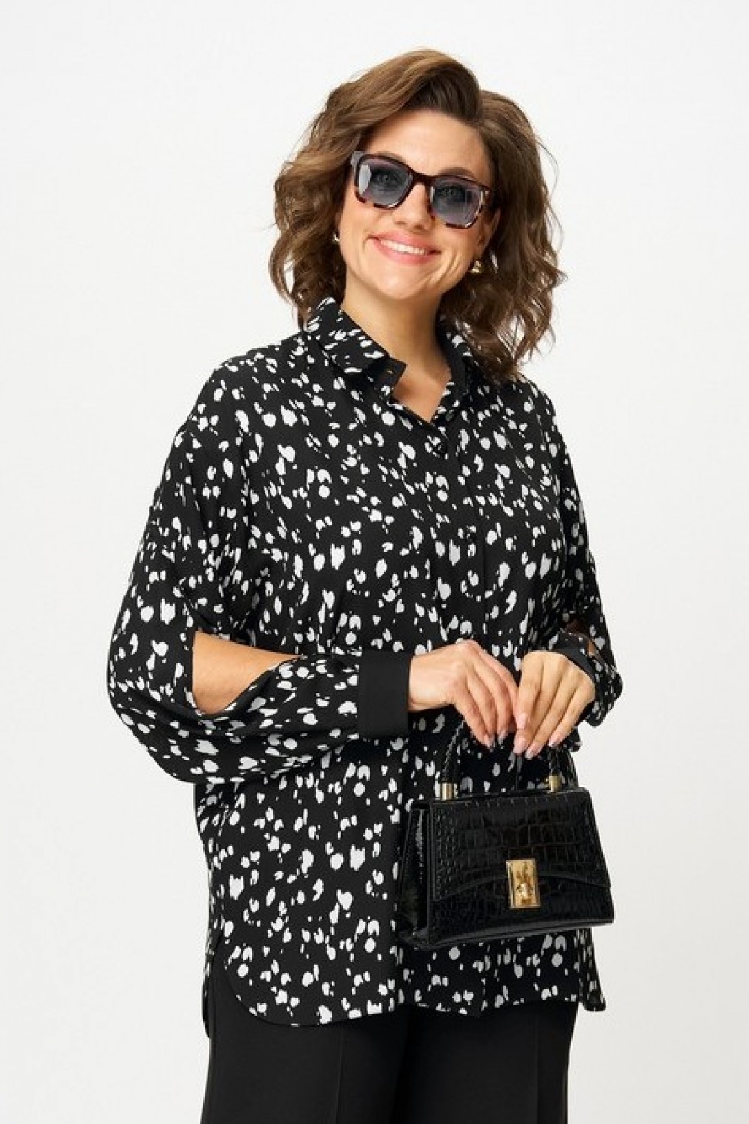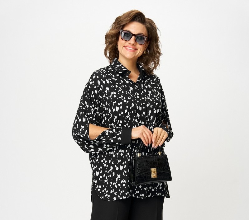 Блузка женская прямого силуэта со спущенным плечом. По бокам закругленные разрезы. Рукав с запахом и разрезом, на манжете. Застежка – планка на петли и пуговицы. Воротник на отрезной стойке. Стойка и манжета из отделочной ткани. По спинке идет отрезная кокетка. Такой женский офисный стиль можно носить, сочетая с другими вещами гардероба, создавая новые образы. Ткань атласная качественная и очень комфортная. Этот универсальная стильная блузка есть в больших размерах. Она отлично подойдет зимой и летом для офиса, для праздника, на каждый день, для вечеринки и корпоративы, для прогулок, для отдыха, для работы, на выпускной, на день рождения для высоких и для невысоких девушек и женщин. Блузка станет любимой вещью в гардеробе и сделает Ваш образ незабываемым! В «Анастасия» Вы всегда найдете богатый выбор качественной одежды для женщин больших размеров.