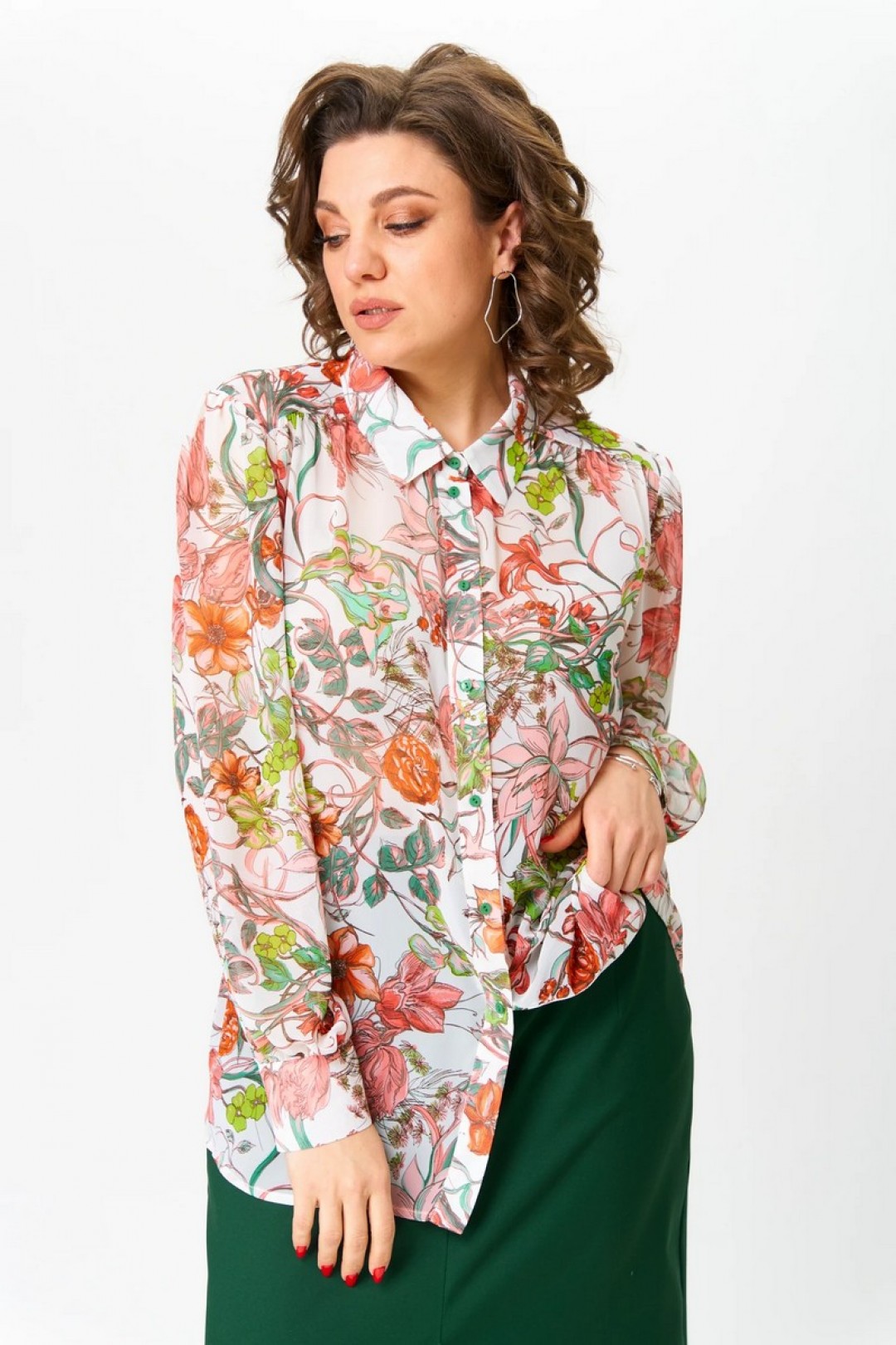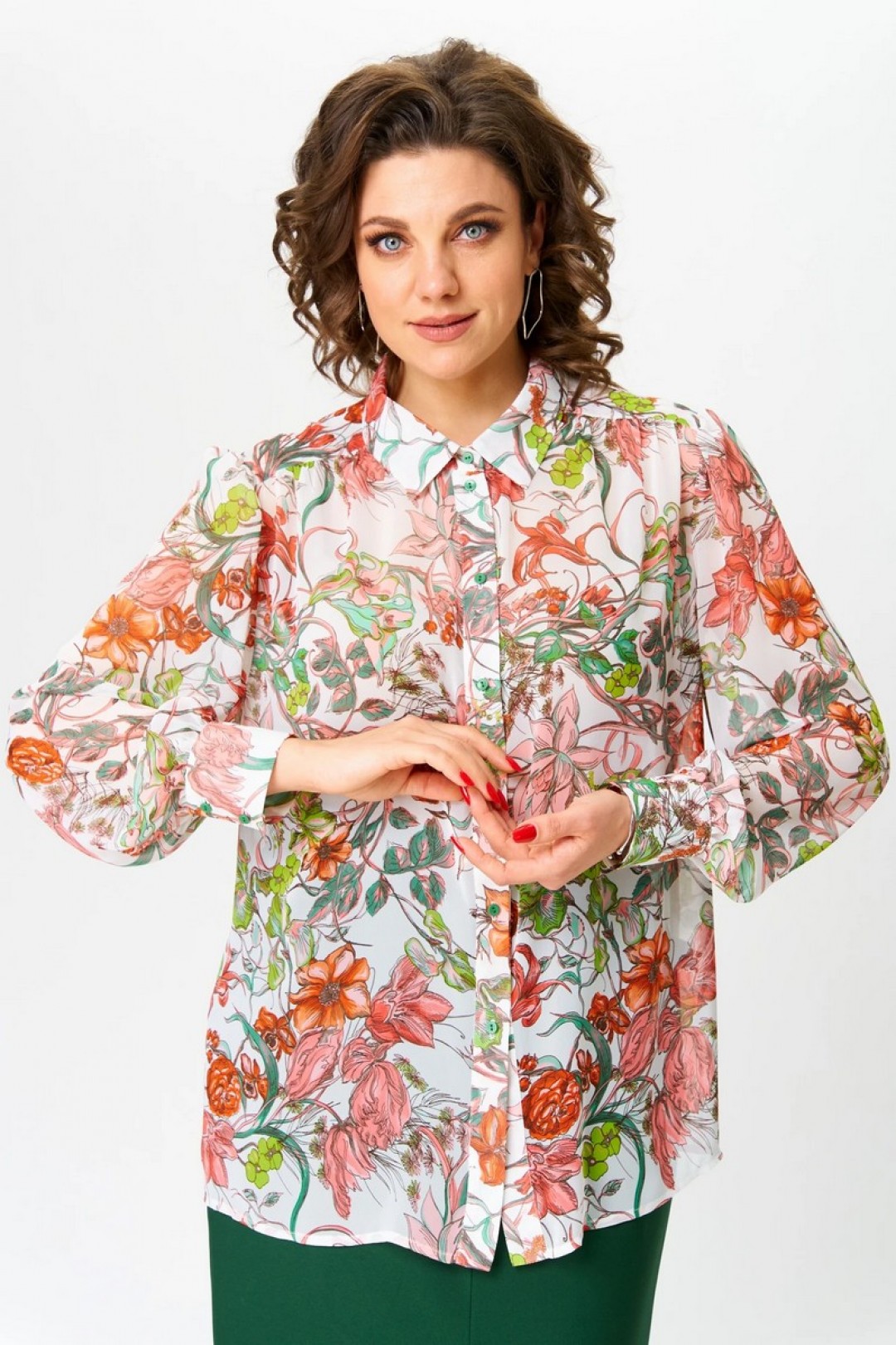 Прозрачность - тренд 2025 года. Блузка с салатовыми и красными цветами, с объемными рукавами на манжетах прекрасно впишется в любой гардероб. Шифоновая блузка с планкой на пуговицах прекрасно сидит на фигуре, прямой крой вещи вытягивает силуэт, скрывает несовершенства и подчёркивает достоинства. Полупрозрачная прямая модель подойдет на лето для носки в теплую погоду, зимой под жакет, жилет, кардиган, прекрасно сочетается как с классическими брюками и юбками, так и с джинсами.