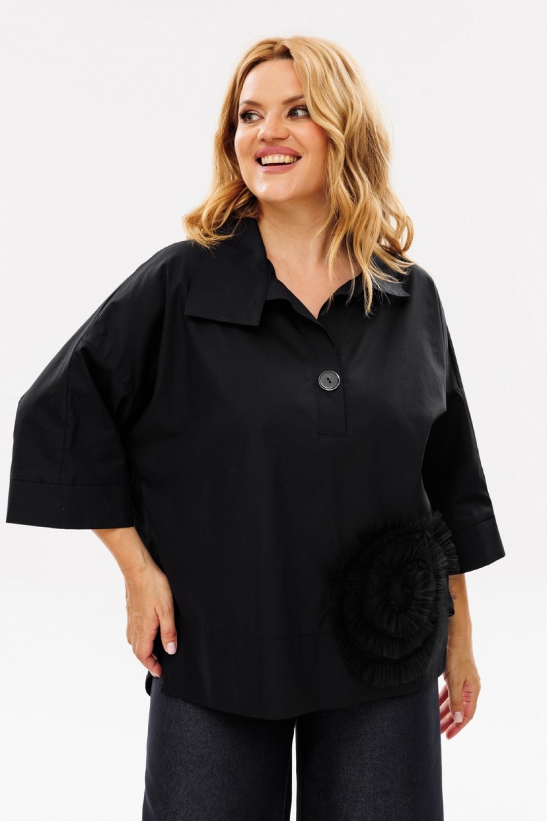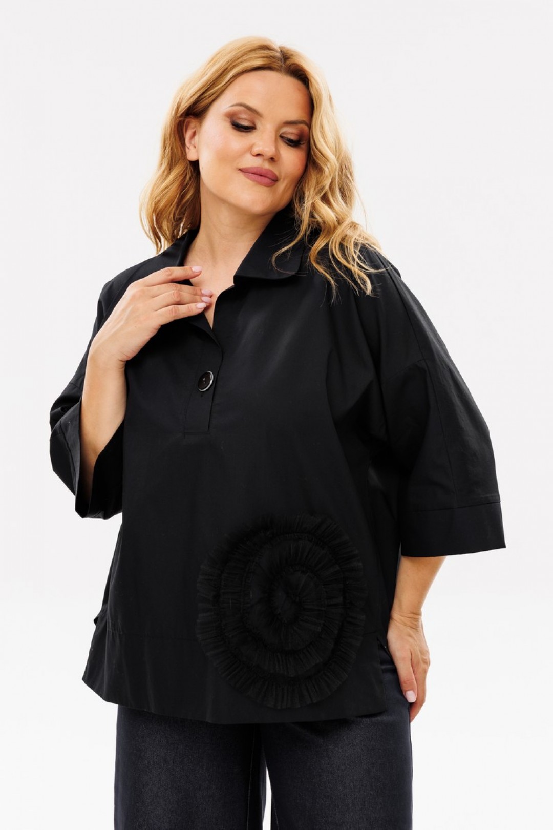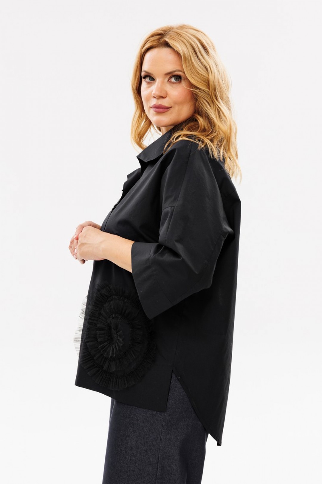 Женская хлопковая блуза в стиле «бохо» прекрасно вольется в повседневную жизнь и станет одной из любимых базовых вещей в Вашем гардеробе. Блуза свободного кроя. Перед цельный с планкой-застежкой до груди. Спинка с плечевой кокеткой, переходящей в рукав. Рукав 3/4 с притачной манжетой по низу. Из-под кокетки спинки — запах из двух нижних деталей блузы, фигурный низ, по бокам изделия разрезы. По низу переда широкая подгибка. Декорирована блуза настрочным цветком из сетки. Изделие хорошо сочетается как с брюками, так и с юбками, с классической и спортивной обувью.
