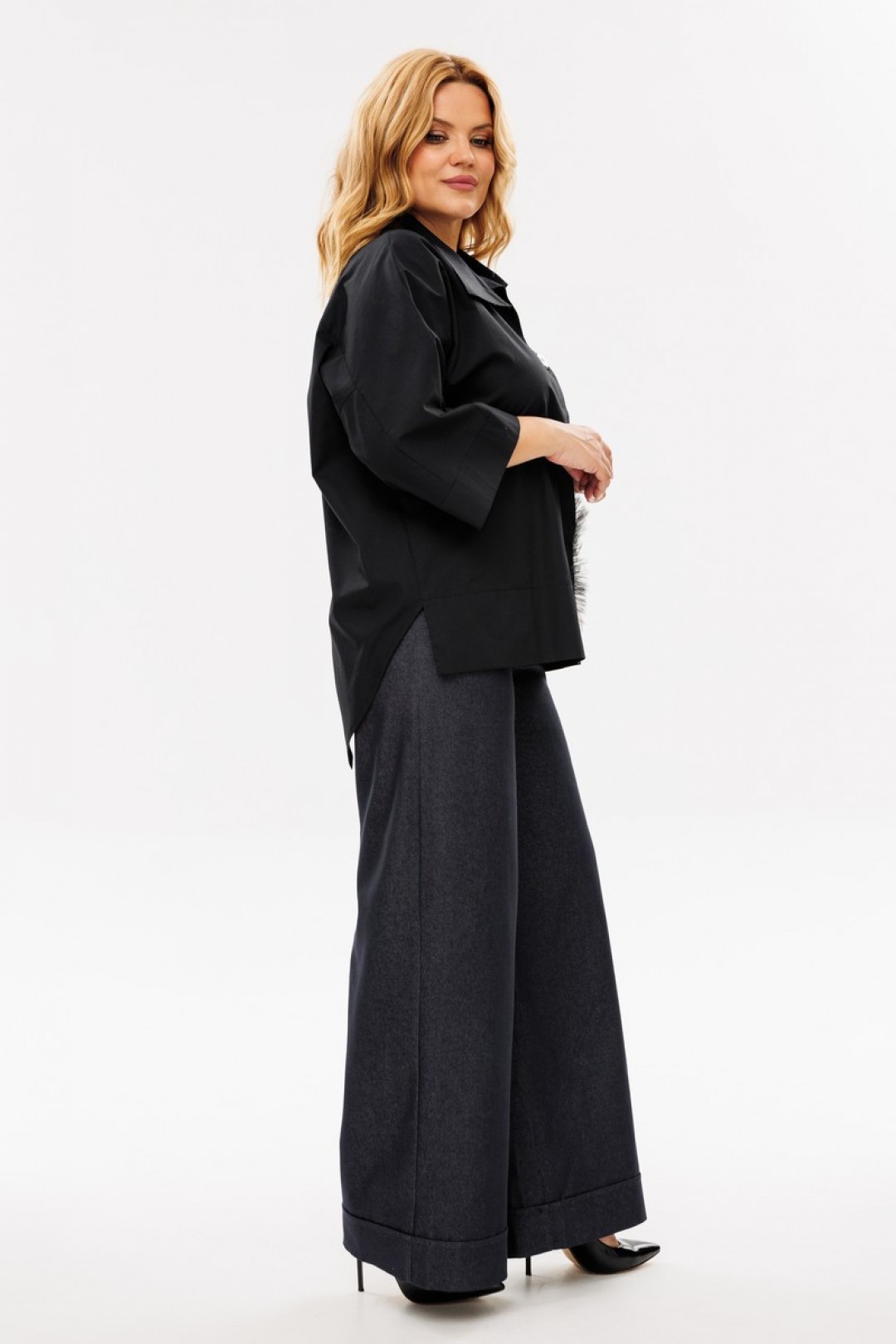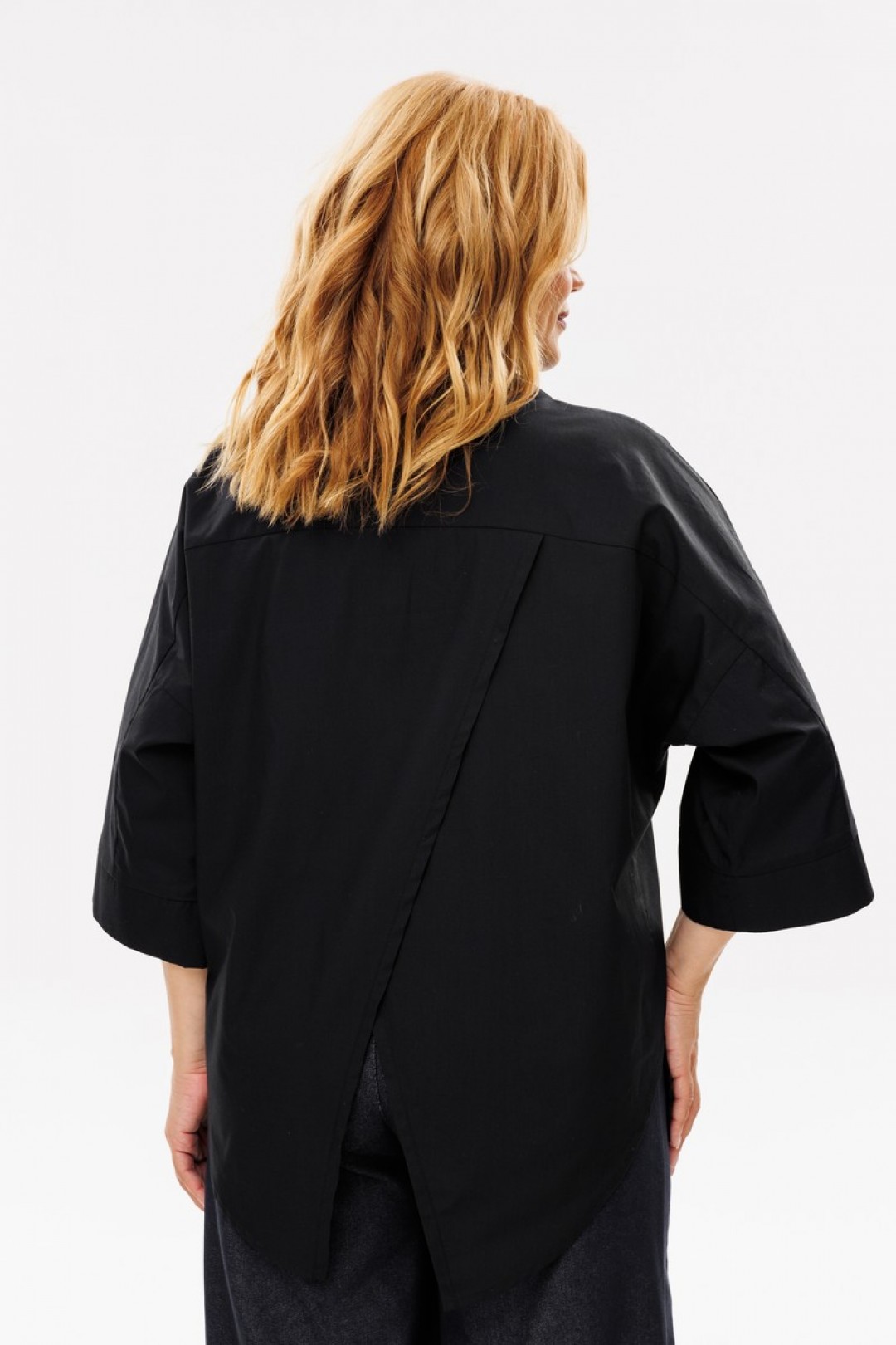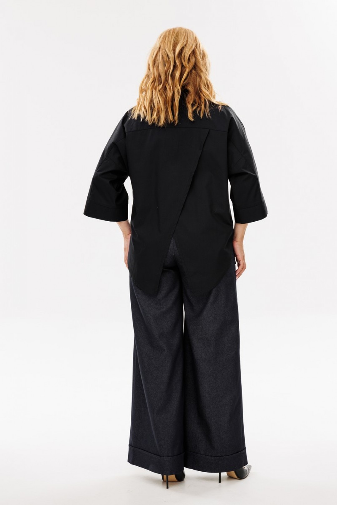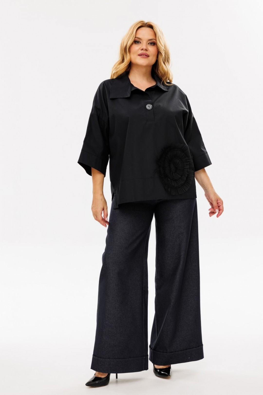 Женская хлопковая блуза в стиле «бохо» прекрасно вольется в повседневную жизнь и станет одной из любимых базовых вещей в Вашем гардеробе. Блуза свободного кроя. Перед цельный с планкой-застежкой до груди. Спинка с плечевой кокеткой, переходящей в рукав. Рукав 3/4 с притачной манжетой по низу. Из-под кокетки спинки — запах из двух нижних деталей блузы, фигурный низ, по бокам изделия разрезы. По низу переда широкая подгибка. Декорирована блуза настрочным цветком из сетки. Изделие хорошо сочетается как с брюками, так и с юбками, с классической и спортивной обувью.
