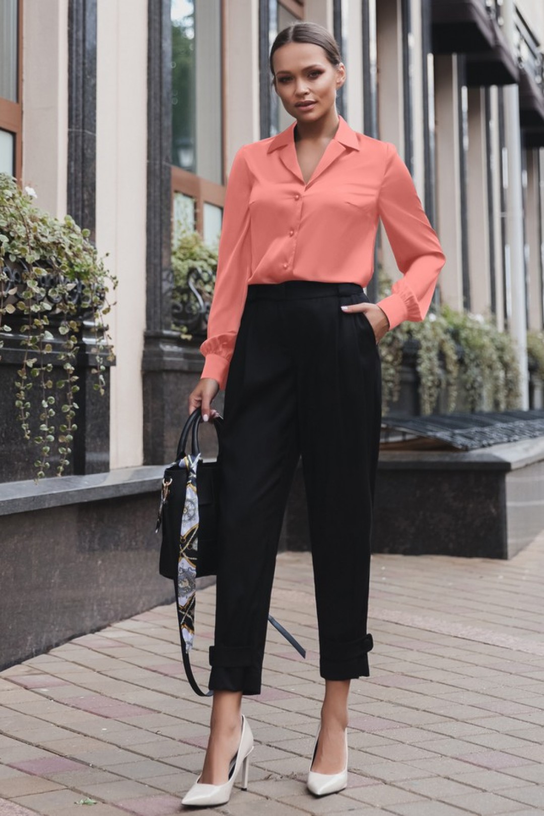Блуза прямого, свободного силуэта с воротником пиджачного типа и застежкой на пуговицы. На полочке нагрудные вытачки. Рукав втачной, длинный, на манжете, одношовный.