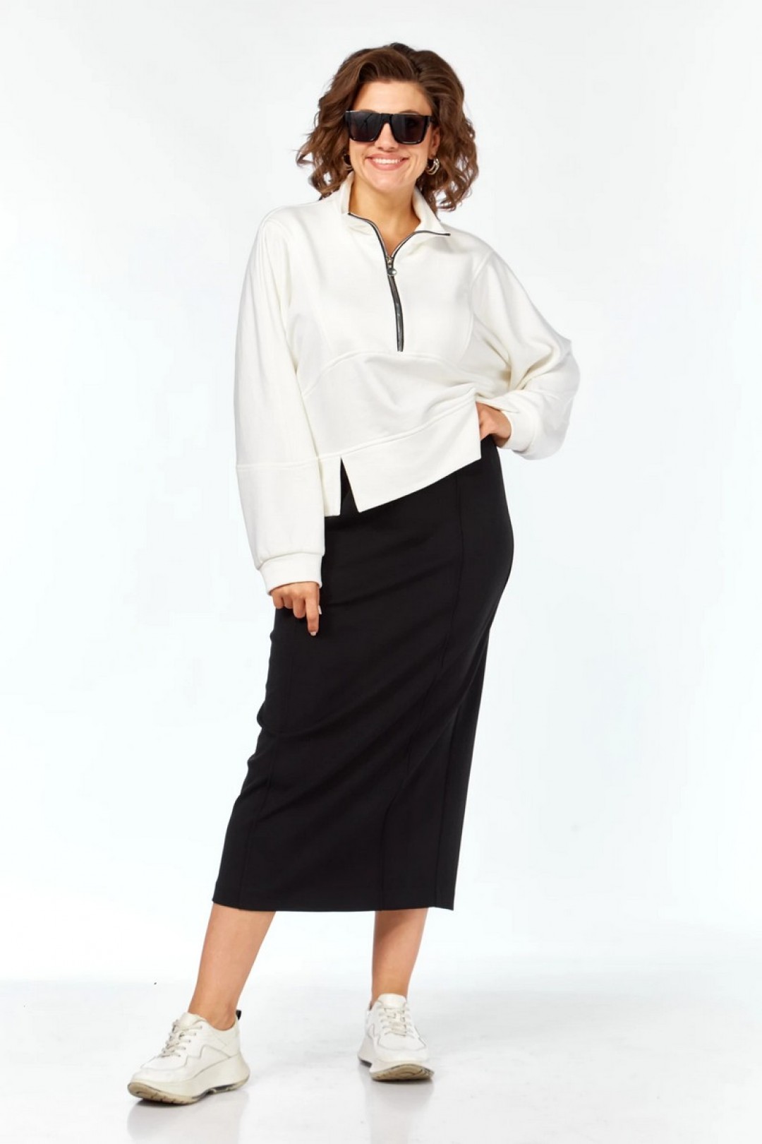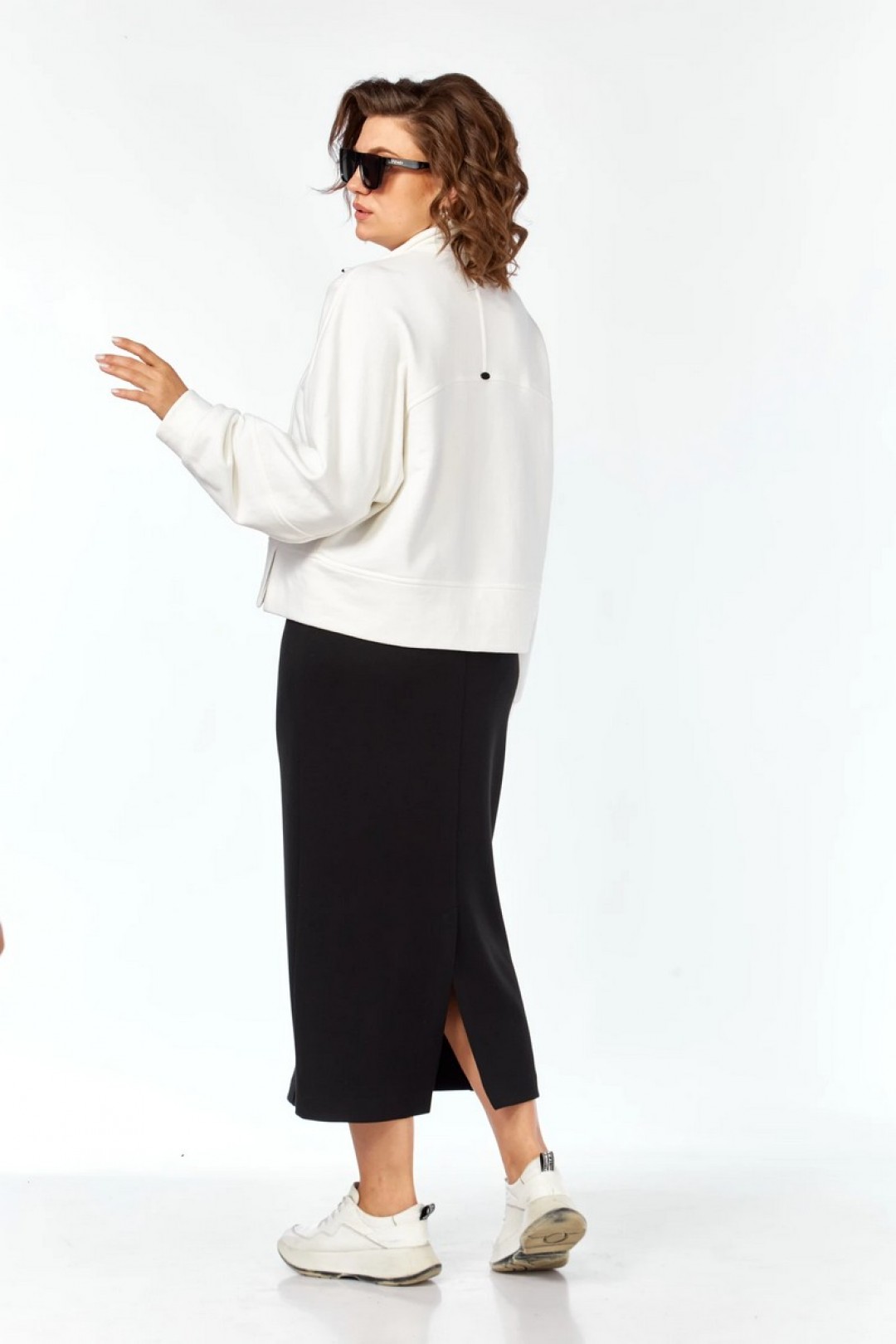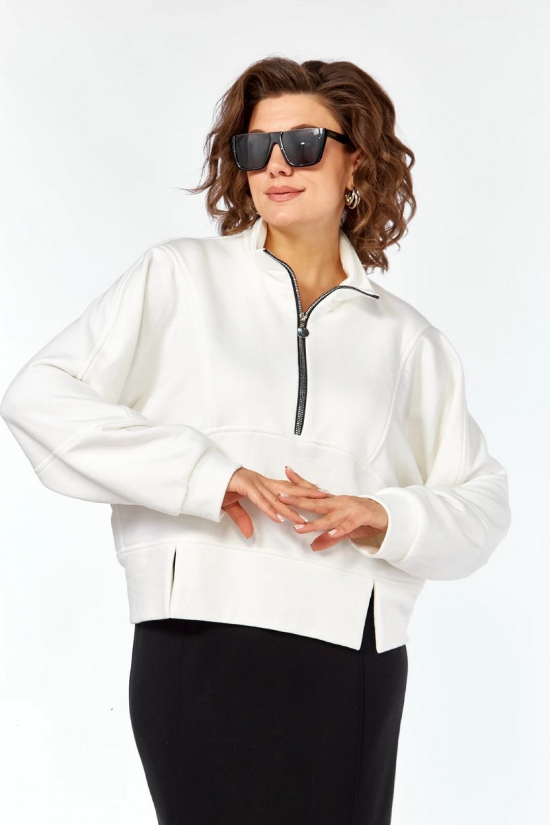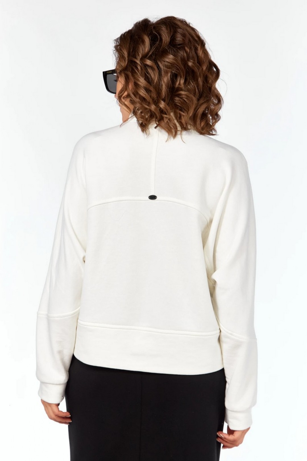 Джемпер: свободного кроя,линия плеча спущена. Воротник мягкий стойка, застёжка на металлическую тесьму молнию. Низ джемпера обработан широкой бейкой с разрезами. Спинка с декоративными подрезами и металлической нашивкой.