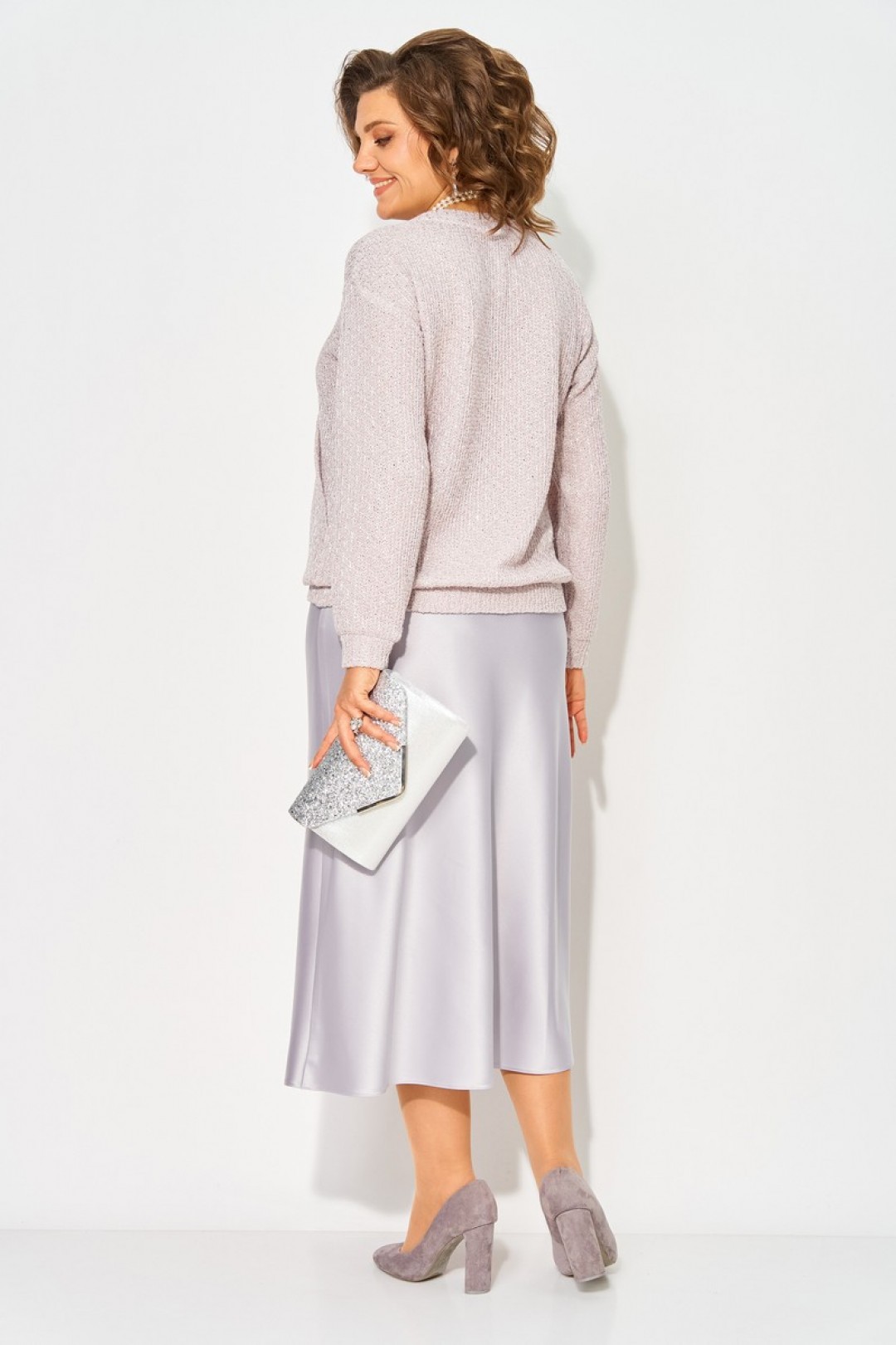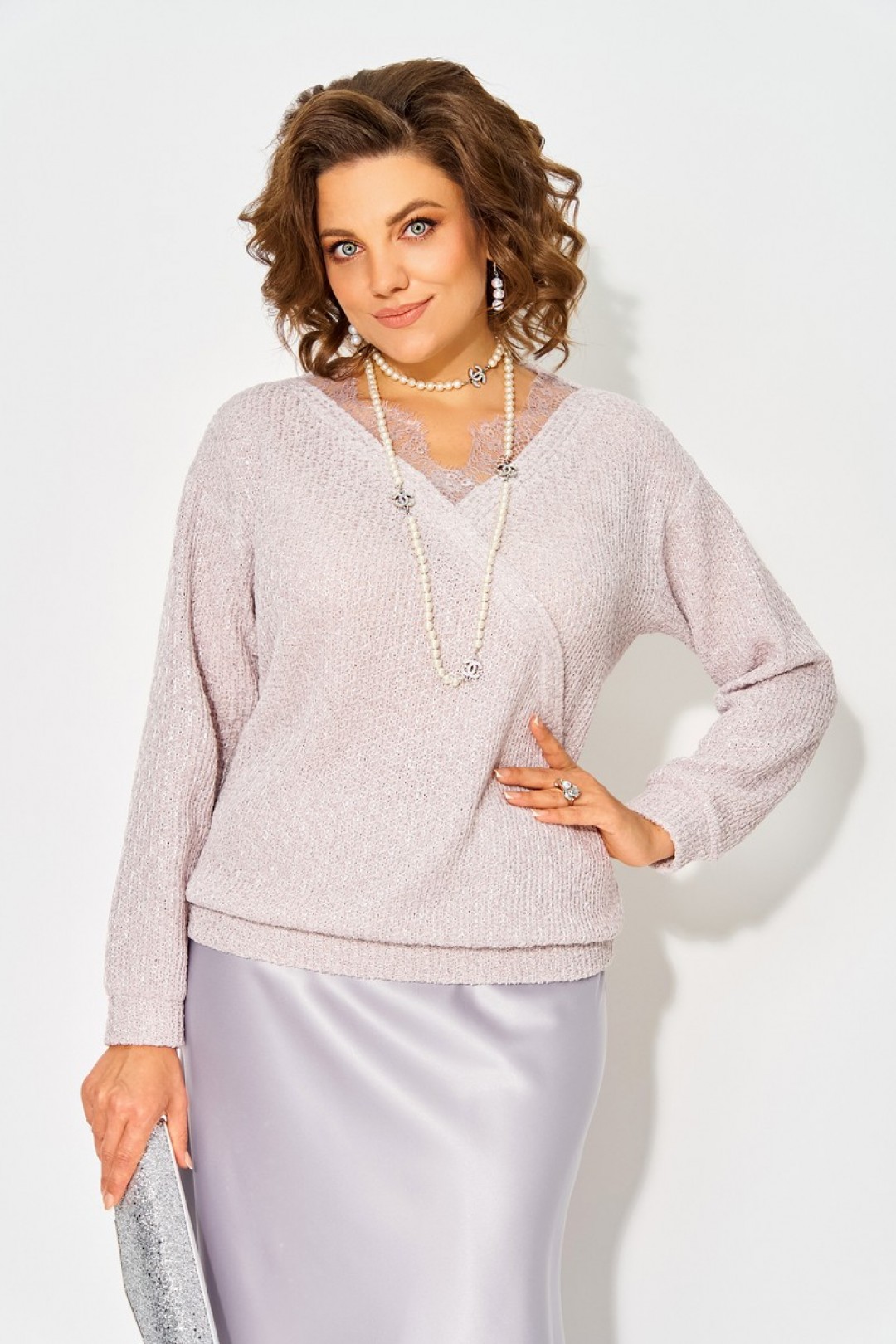 Вязанный жемчужно-лиловый джемпер с ажуром по вороту - это идеальный вариант для создания стильного и привлекательного романтического образа! Мягкий и нежный материал этого джемпера делает его очень приятным на ощупь, теплым и уютным, а легкое мерцание придает свою изюминку. Горловина v-образной формы приковывает взгляды к линии декольте. Рукав длинный, на спущенной линии плеча. Низ рукава, а также низ изделия оформлен мягкой трикотажной манжетой. Особенно актуальна данная кофточка на осенний и зимний период, за счет качественного состава, не пропускает холод обеспечивает тепло и комфорт!