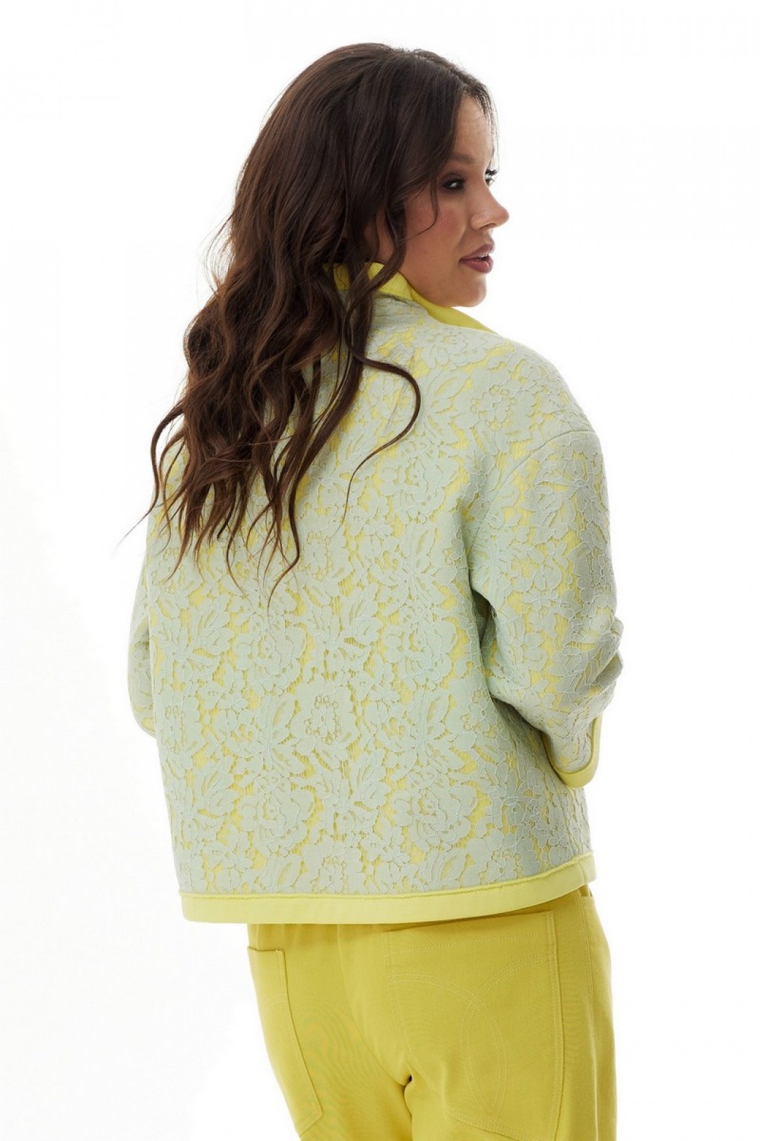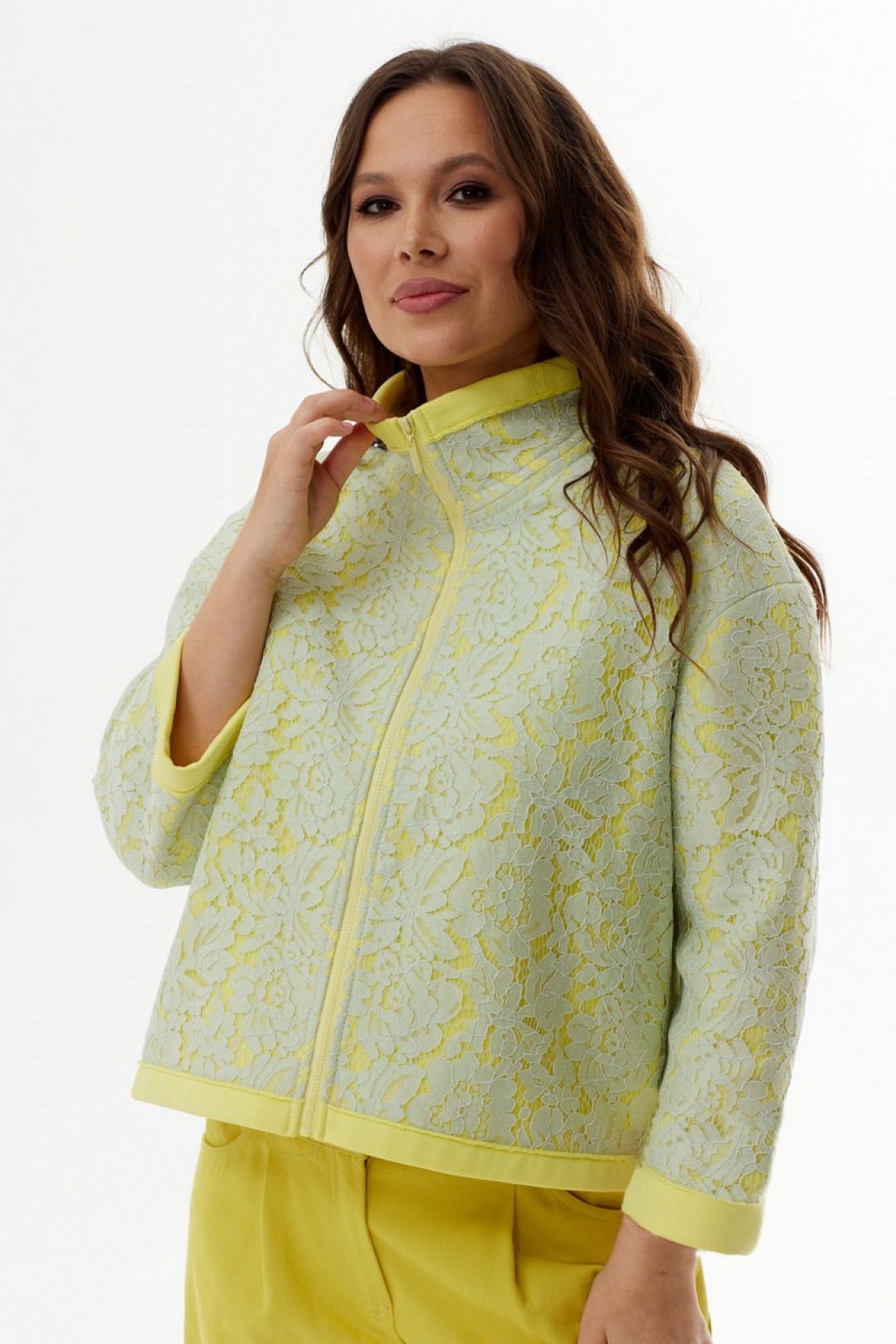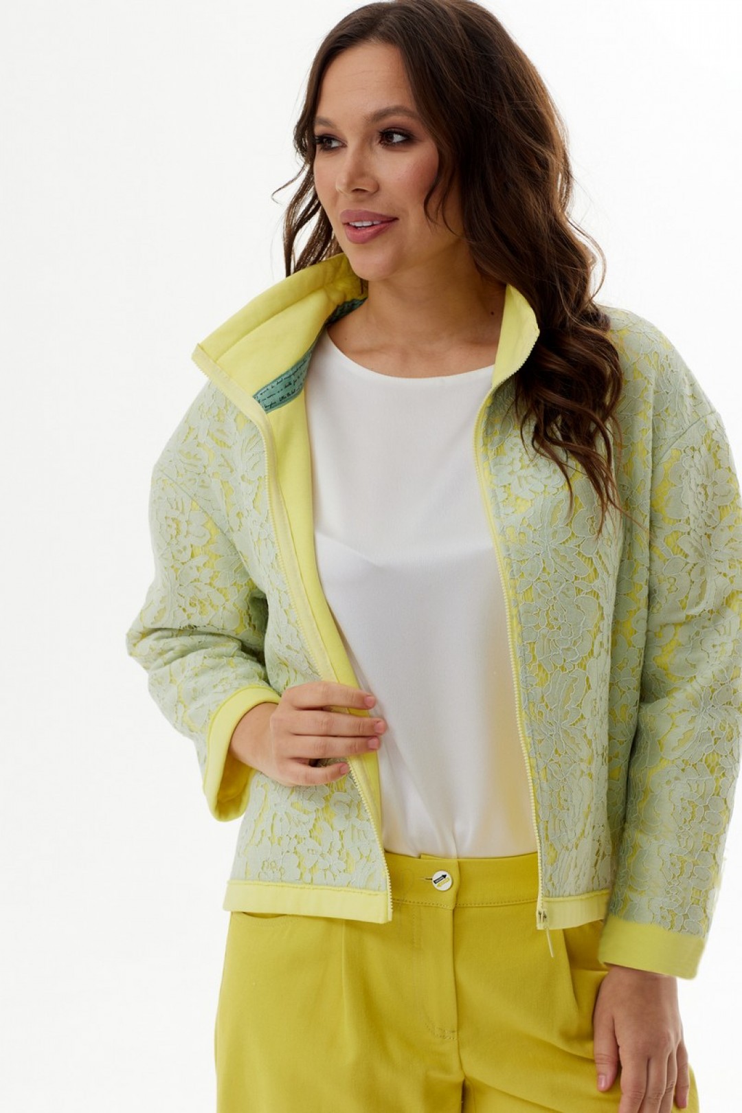 Стильный и невероятно красивый бомбер свободного кроя с центральной застежкой на молнию. Выполнен из однотонного качественного плотного трикотажного полотна(футер) с наложенным на него кружевом. За счет наложения разных фактур ткани и цветов создается необычный 3D эффект. Рукав длинный, втачной, слегка спущен. Горловина обработана стойкой.