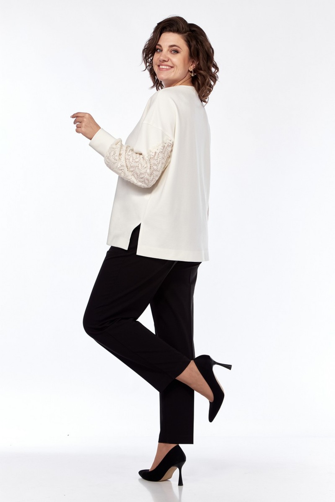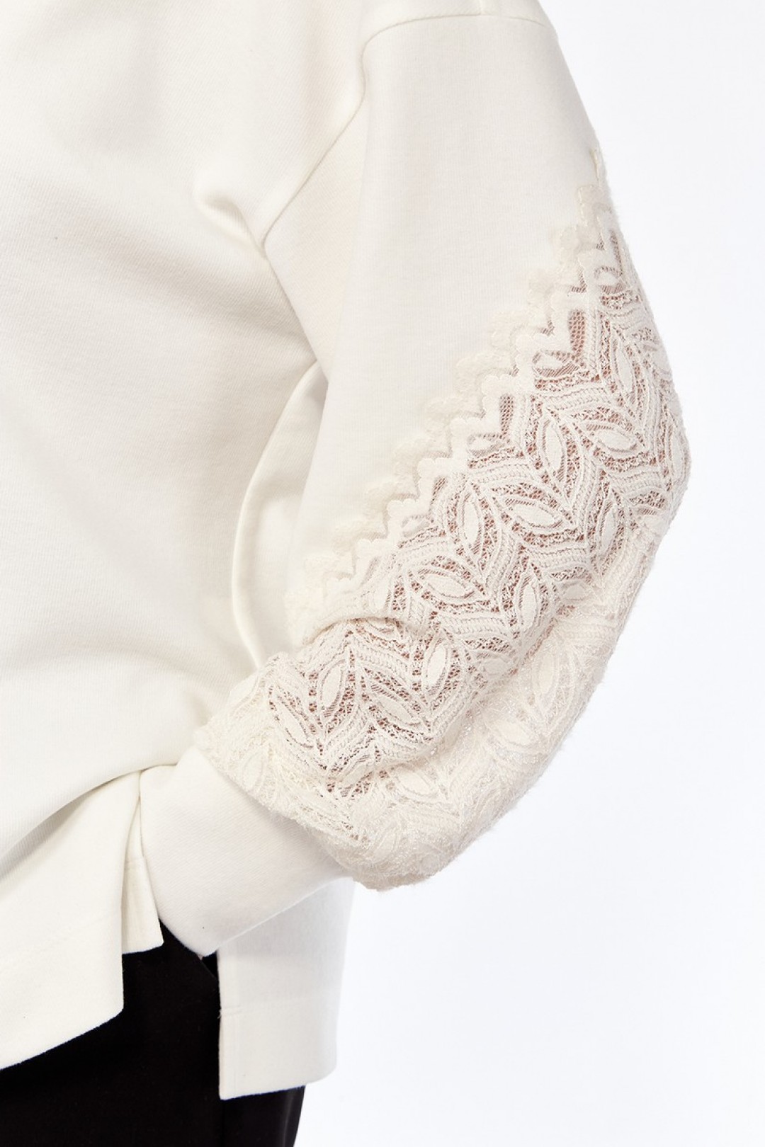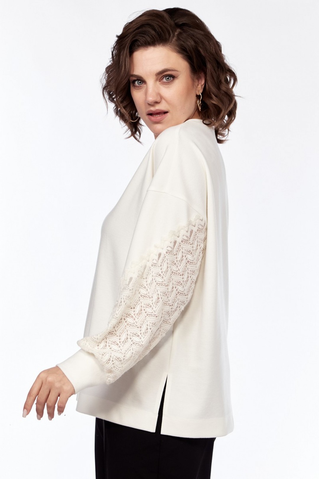 Джемпер женский, свободного силуэта, выполнен из трикотажного полотна в комбинации с трикотажным кружевом. Горловина округлой формы обработана планкой. Перед с асимметричной кокеткой из кружева. Рукава спущенные на манжете. Правый рукав из кружевного полотна, левый с кружевной вставкой. Спинка цельнокроенная. По боковым швам обработаны разрезы.