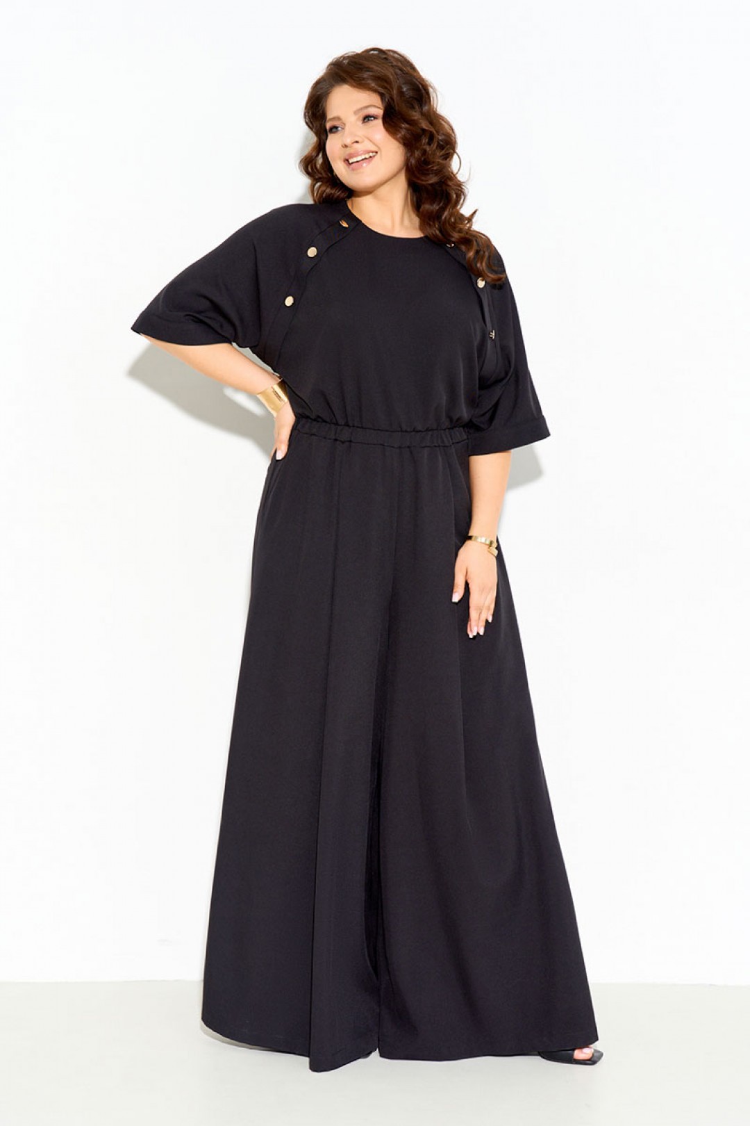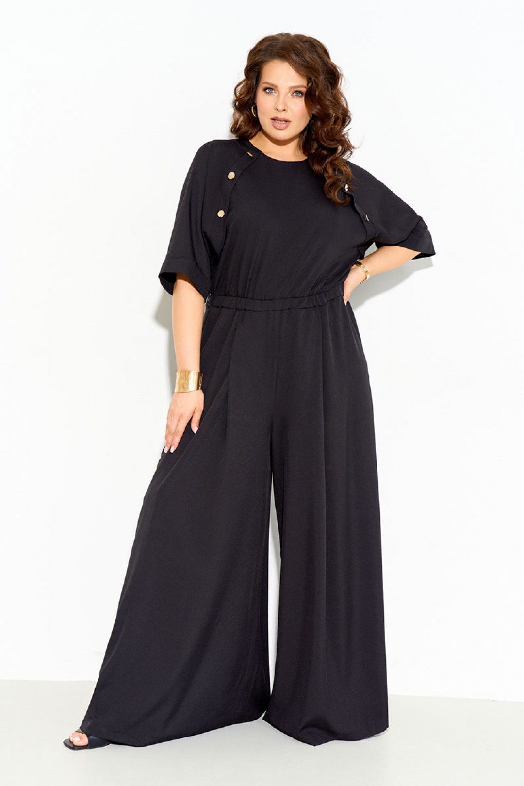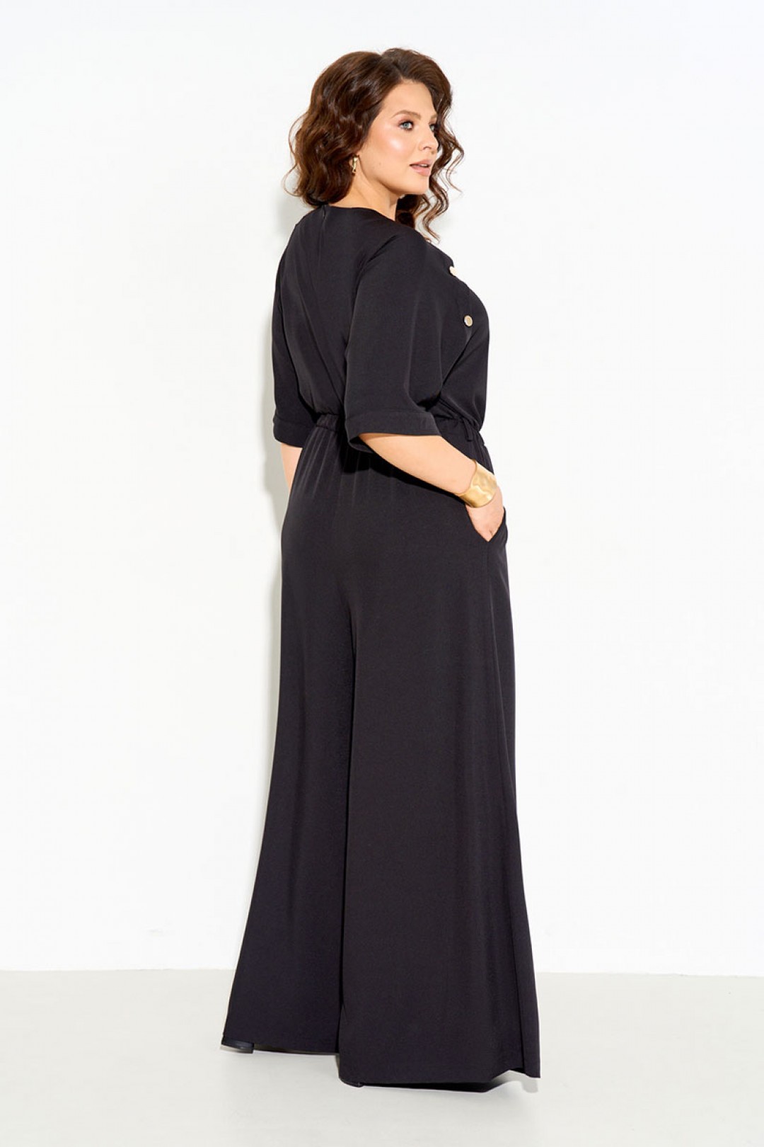 Комбинезон женский полуприлегающего силуэта выполнен из легкой натуральной ткани с добавлением вискозы 70%. Рукава реглан, по переду декоративная планка с пуговицами, по линии талии вставлена резинка, нижняя часть комбинезона расширена к низу, по спинке молния. Комбинезон полностью соответсвует заявленному размеру. Пользуйтесь таблицей замеров готового изделия.