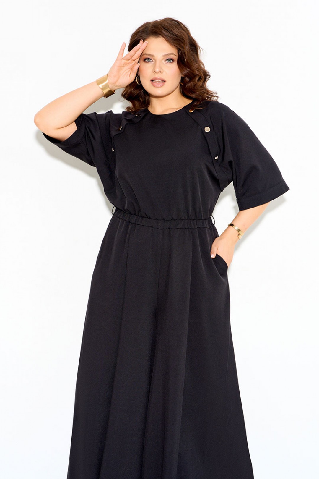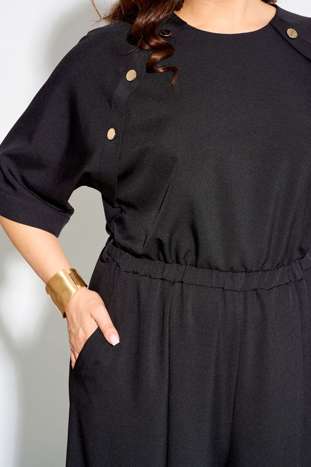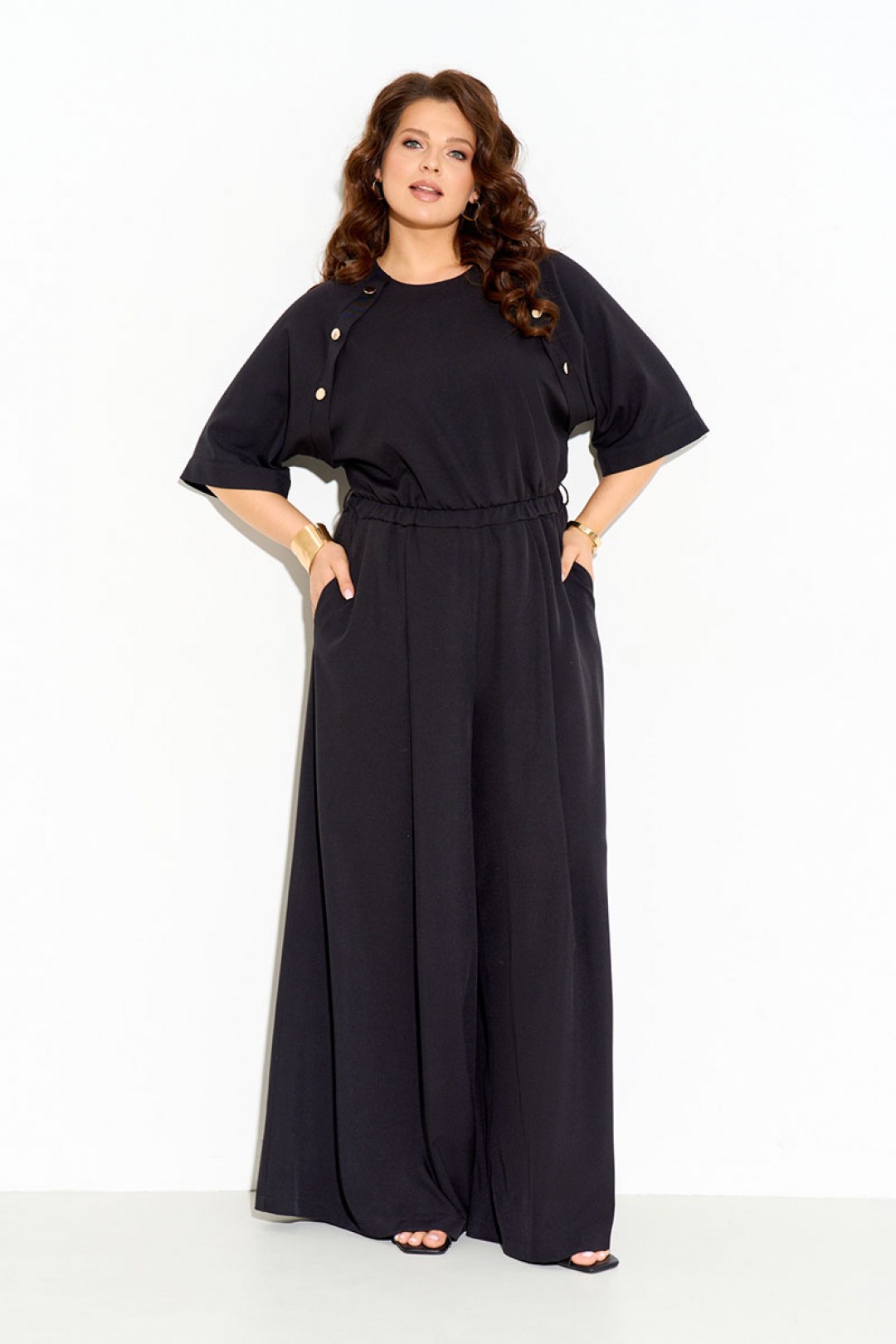 Комбинезон женский полуприлегающего силуэта выполнен из легкой натуральной ткани с добавлением вискозы 70%. Рукава реглан, по переду декоративная планка с пуговицами, по линии талии вставлена резинка, нижняя часть комбинезона расширена к низу, по спинке молния. Комбинезон полностью соответсвует заявленному размеру. Пользуйтесь таблицей замеров готового изделия.