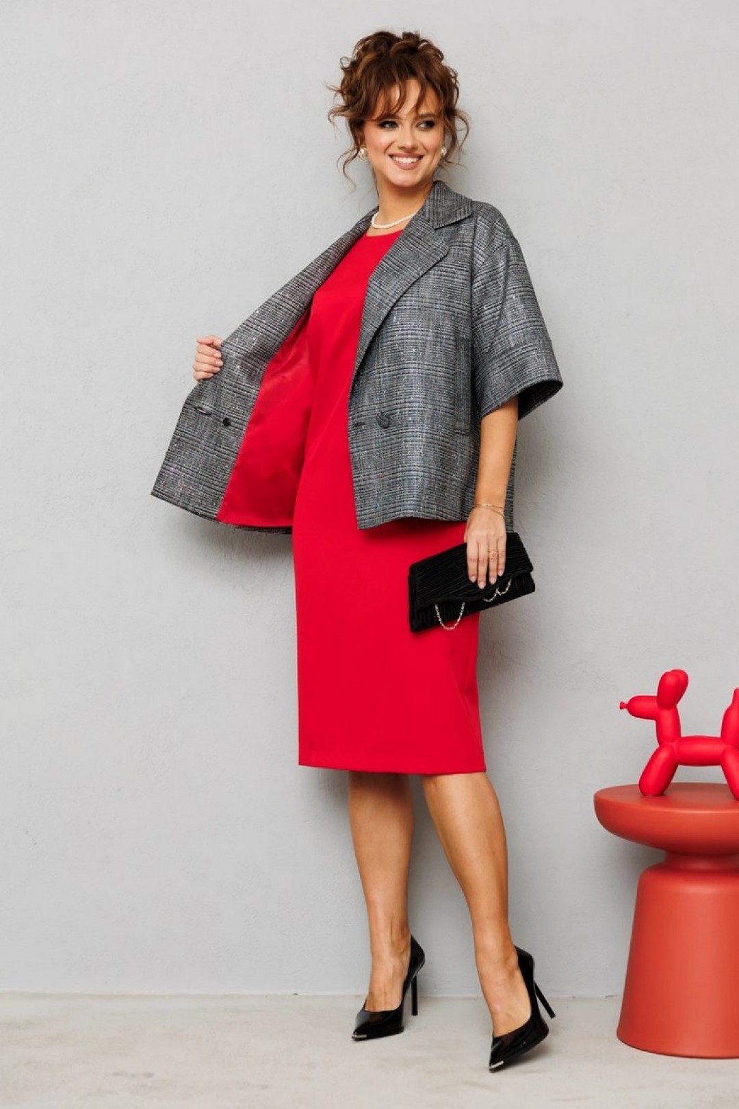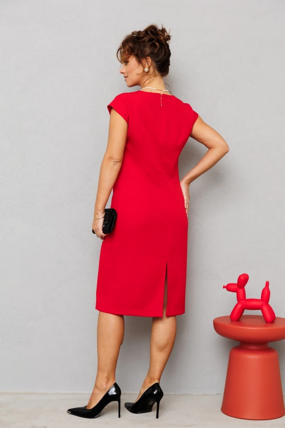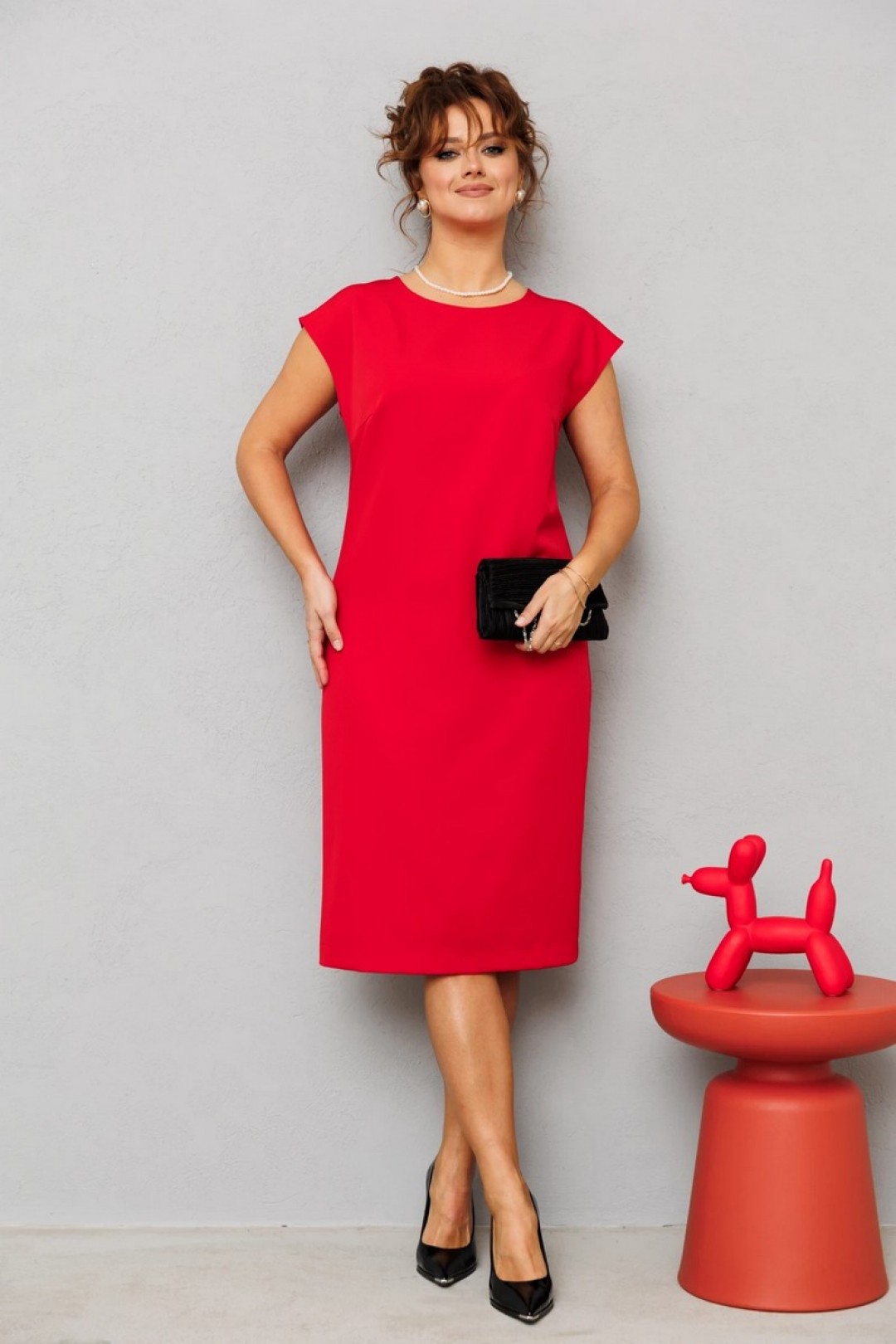 Платье полуприлегающего силуэта со спущенной линией плеча, выполненное из плательной ткани (тянется) без подкладки. По переду нагрудные вытачки. Спинка со средним швом, талиевыми вытачками и разрезом по низу. Застежка на потайную тесьму-молнию в среднем шве спинки. Горловина округлой формы, обработана окантовкой.