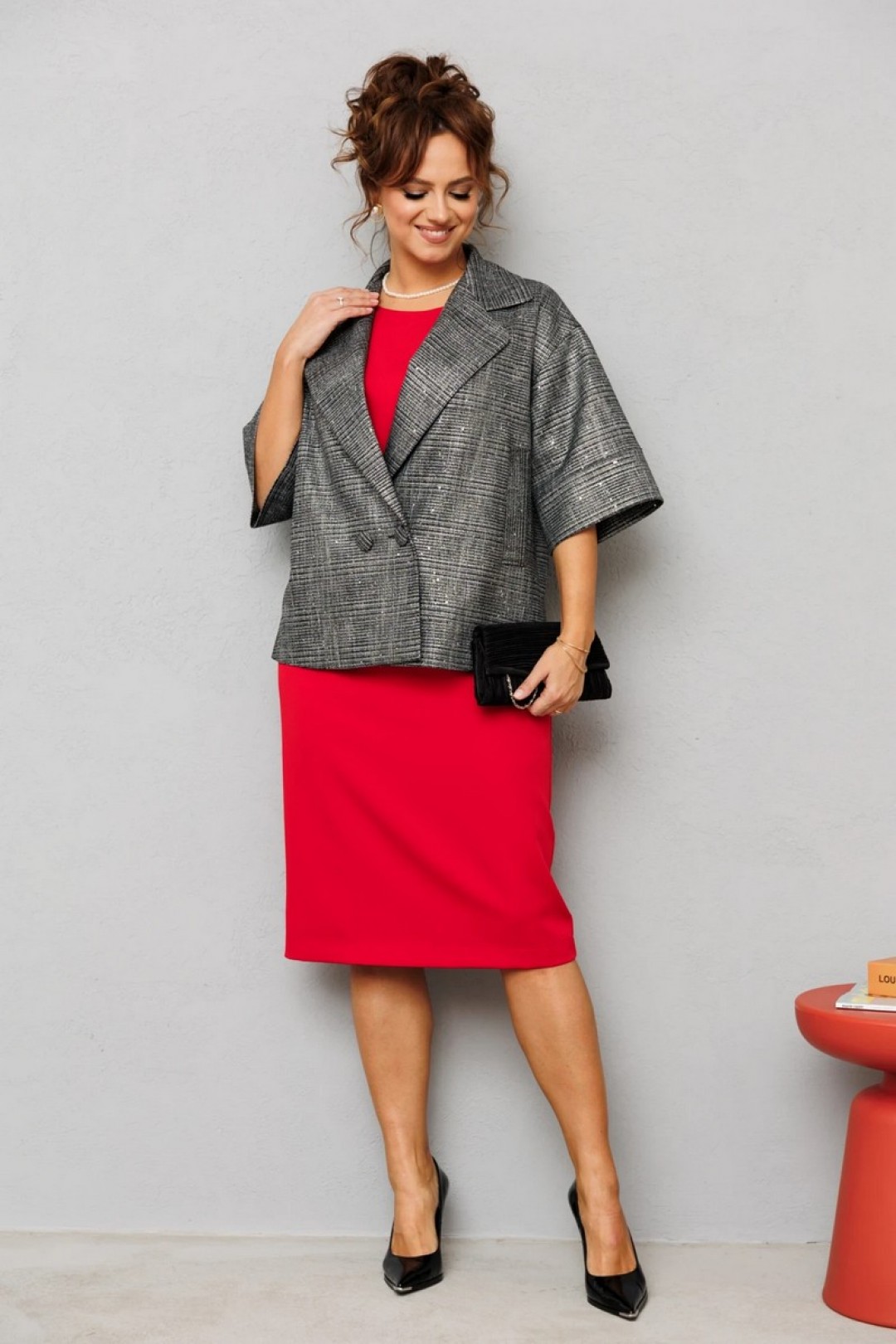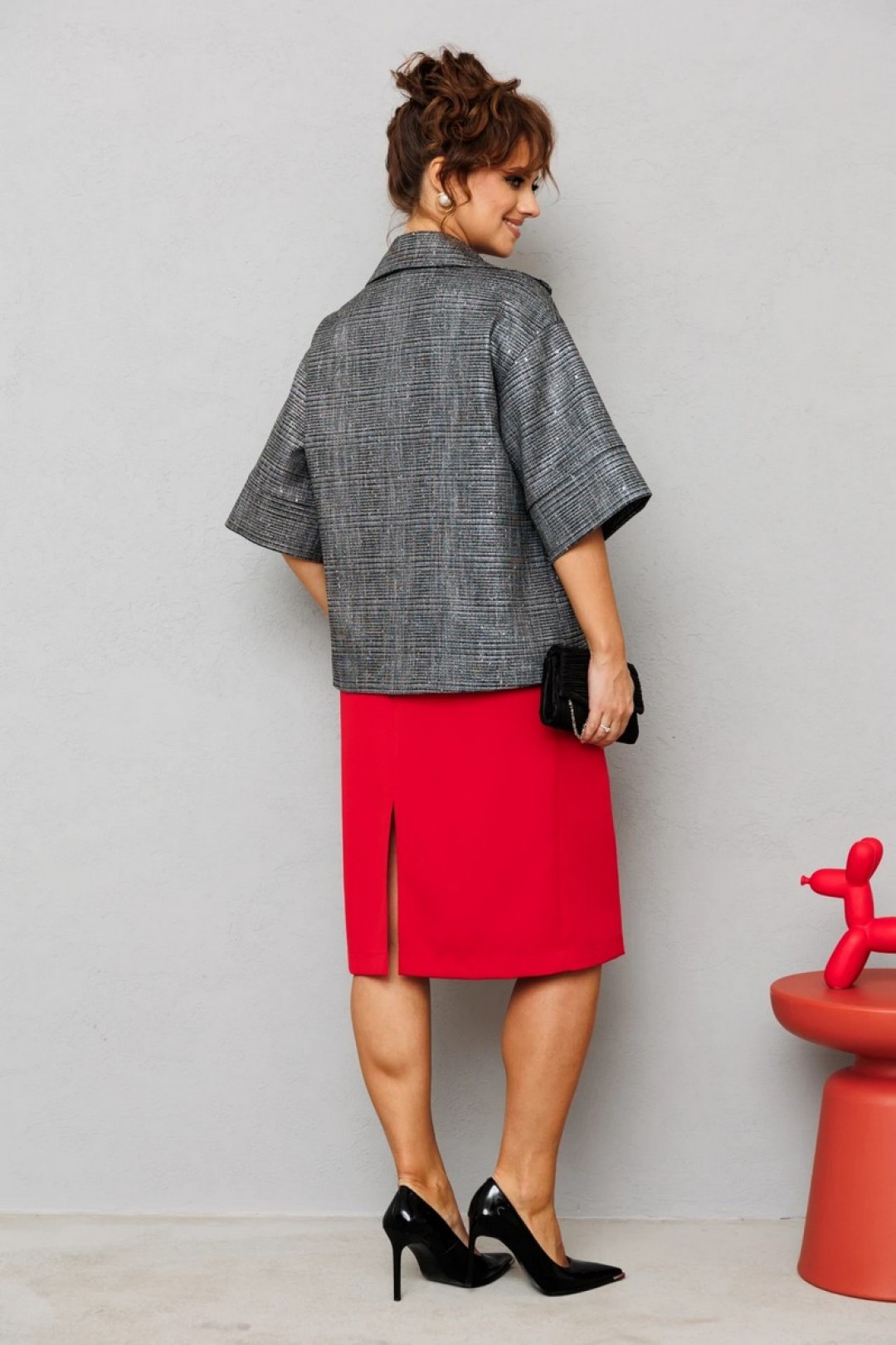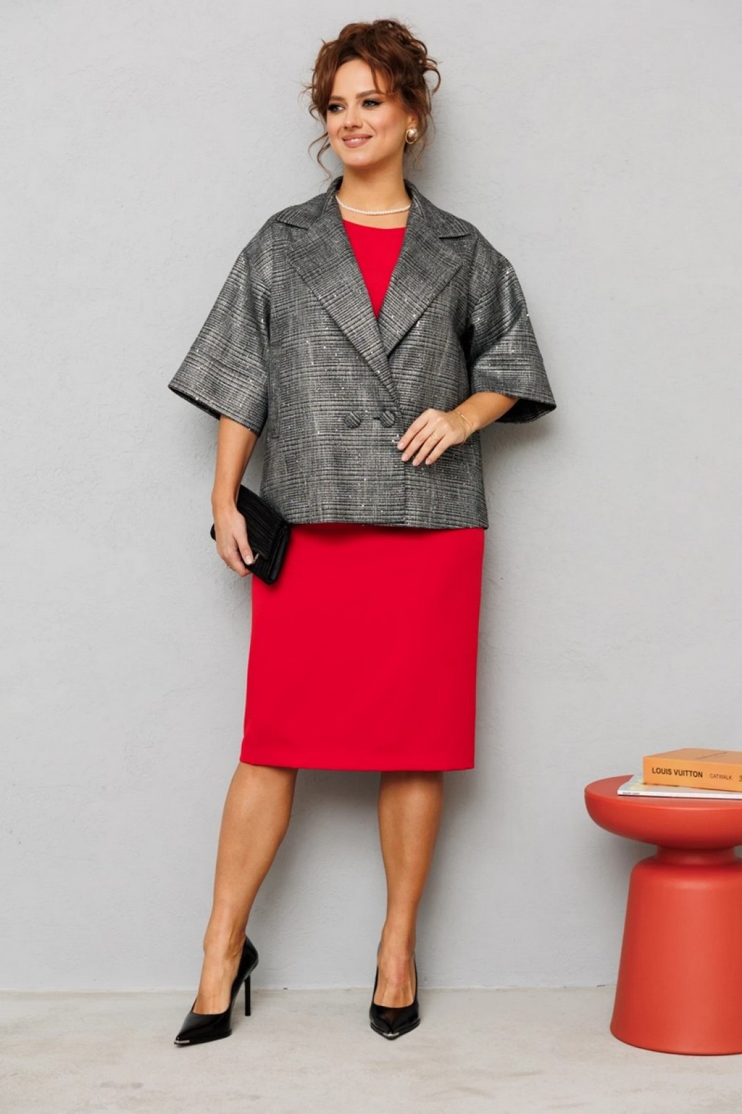 Жакет прямого силуэта на подкладке со спущенной линией плеча, выполнен из костюмной ткани, расшитой пайетками (тянется). По переду функциональные прорезные карманы с листочкой, центральная двубортная застежка на петли-пуговицы. Горловина оформлена вортником пиджачного типа с лацканом. Спинка цельная. Рукава одношовные с притачной манжетой.