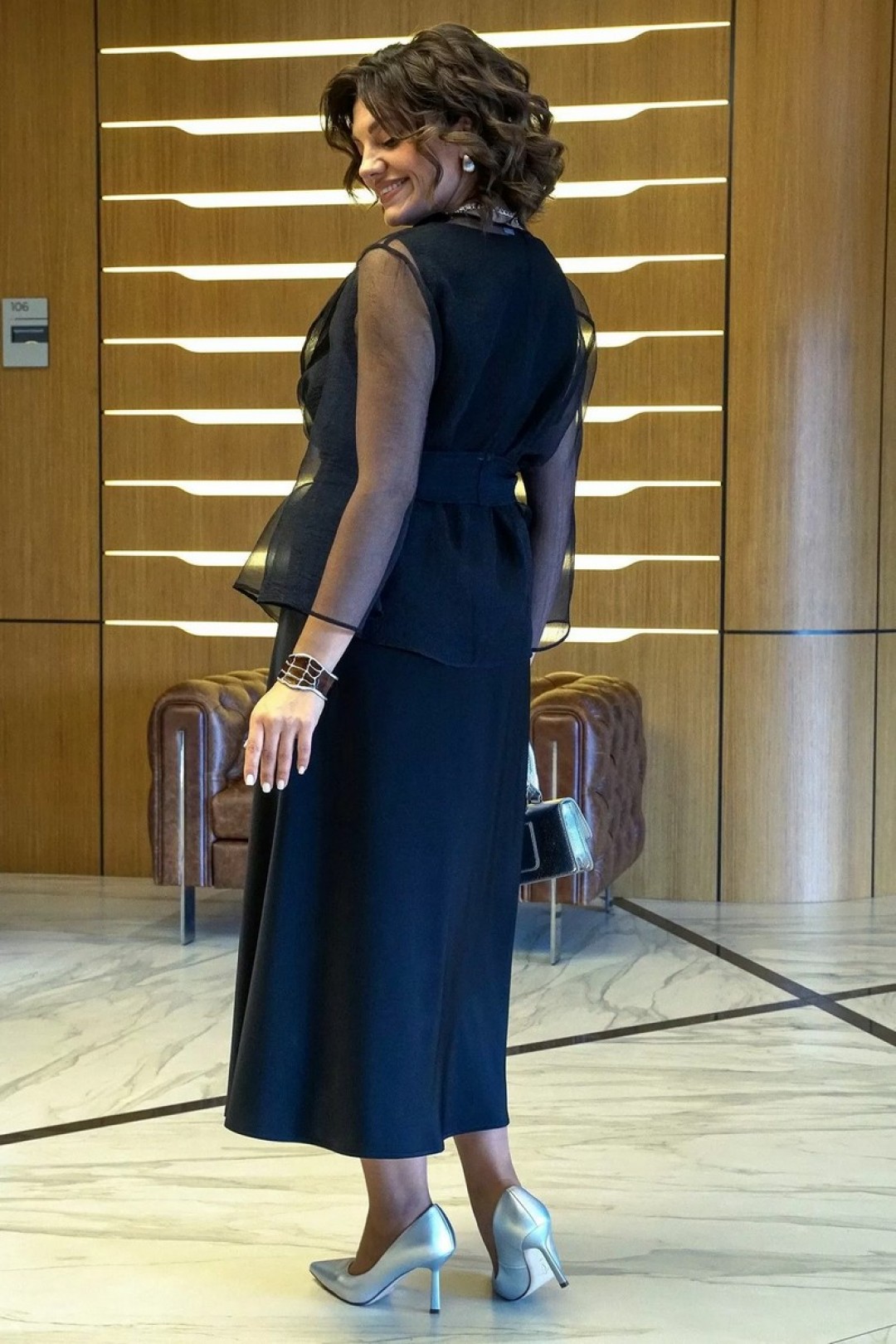 Платье полуприлегающего силуэта вверху книзу типа «рыбки», раскроено по косой. Перед с нагрудными выточками.