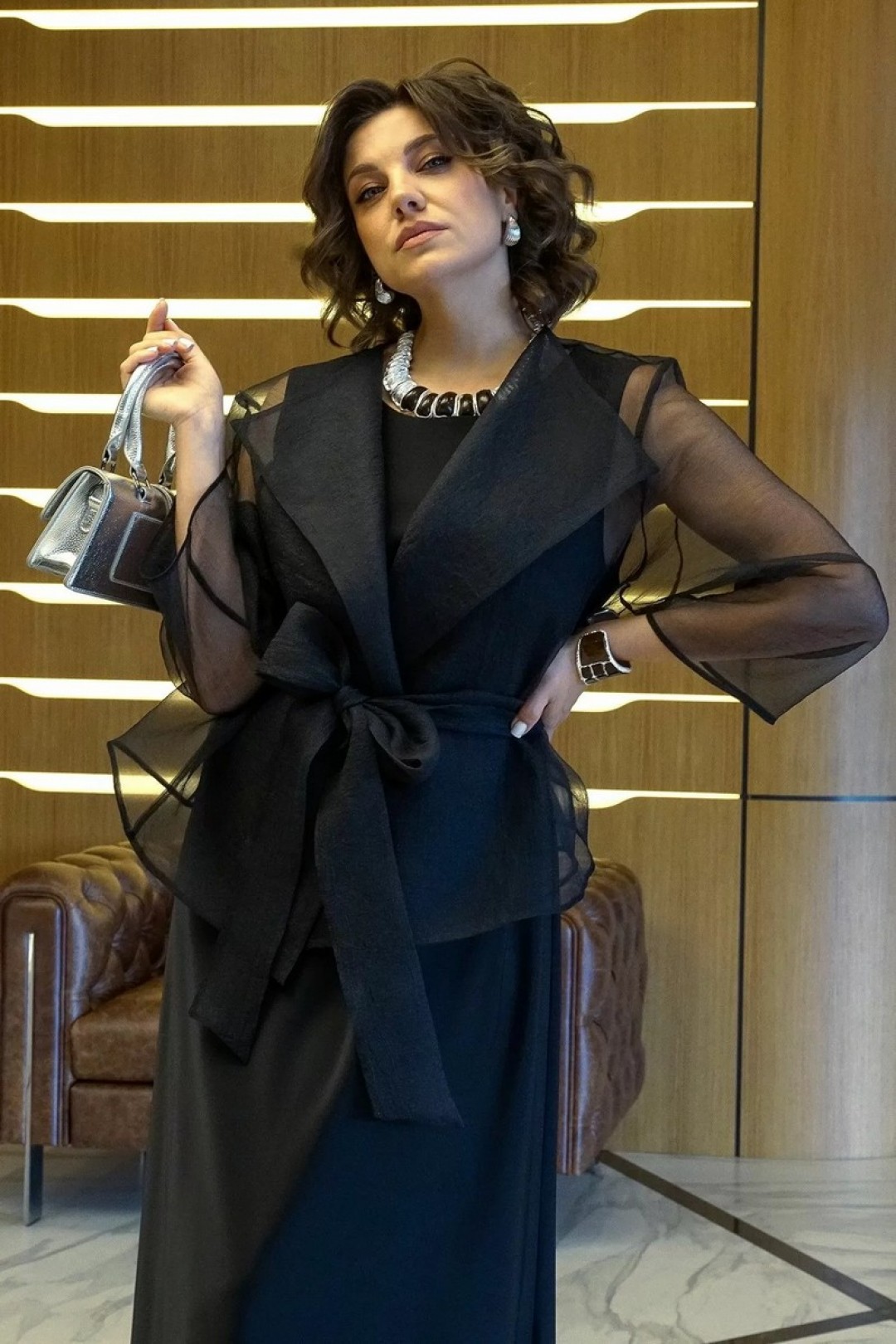 Блузон прямого, свободного силуэта, без застёжки на запах, с завязывающимся поясом. Перед с отложными лацканами. Спинка со средним швом. Рукава втачные, одношовные, длиной ¾.