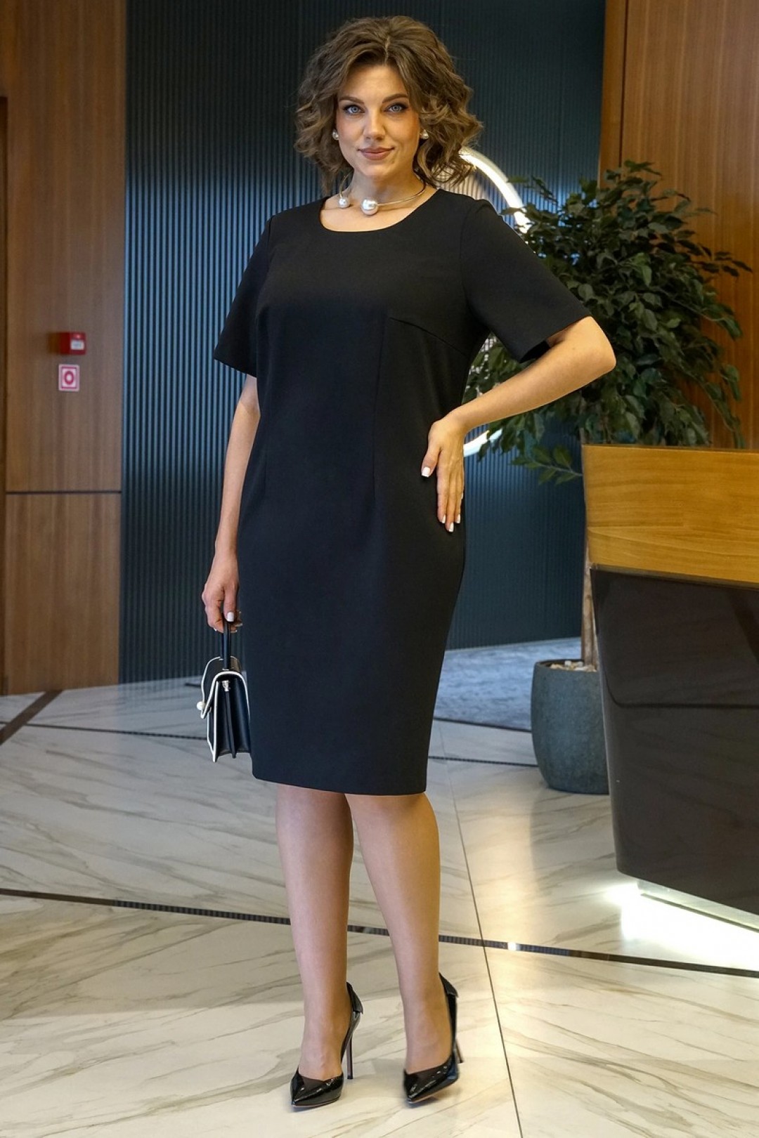Платье полуприлегающего силуэта, с застёжкой на потайную молнию в среднем шве спинки. Перед с нагрудными и талевыми выточками. Спинка с талевыми выточками и шлицей.