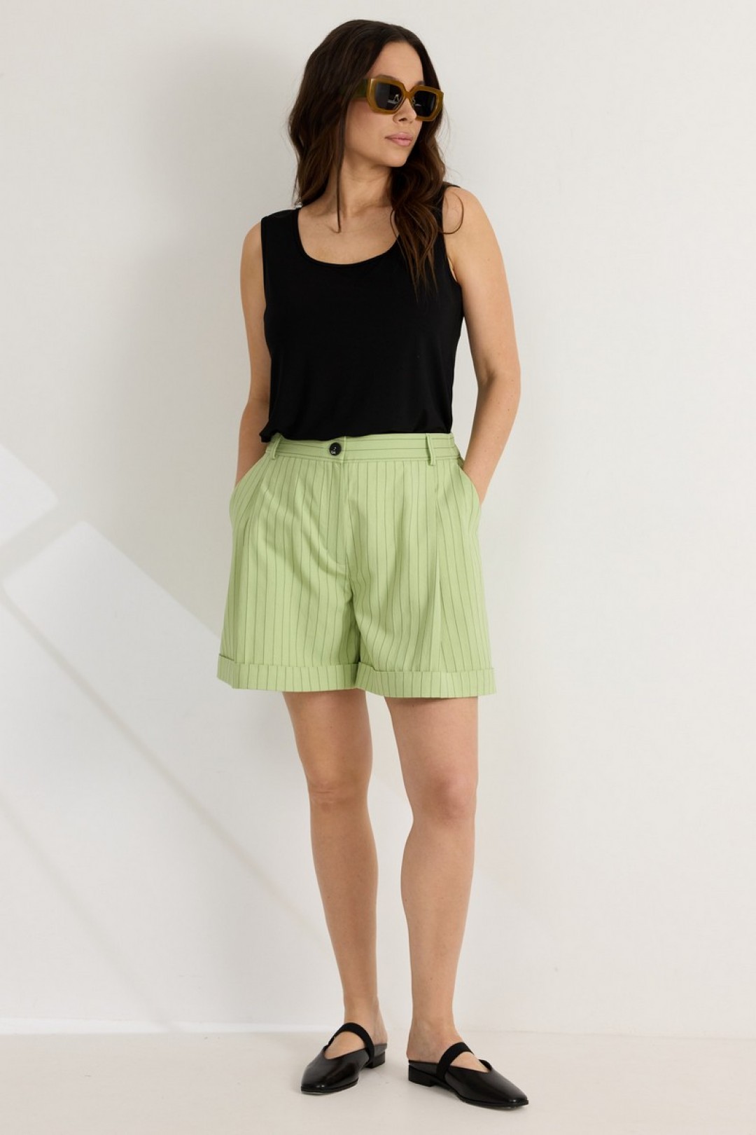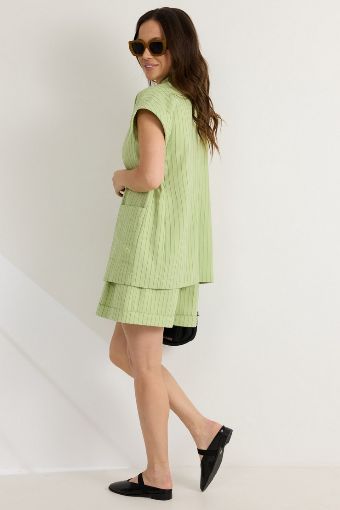 Выполнен из поливискозного полотна цвета лайм в меловую полоску. Удлиненный однобортный жилет свободного кроя со спущенной линией плеча. Жилет без подкладки. Горловина обработана отложным воротником. Застежка на пришивную пуговицу. Жилет дополнен функциональными боковыми карманами. Шорты свободного кроя с притачным поясом, дополненным эластичной тесьмой. Застежка гульфик на молнию и пуговицу. Шорты дополнены шлевками для ремня и удобными боковыми карманами. Низ шорт с подворотом.