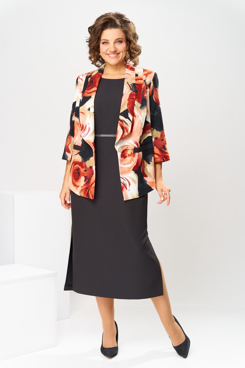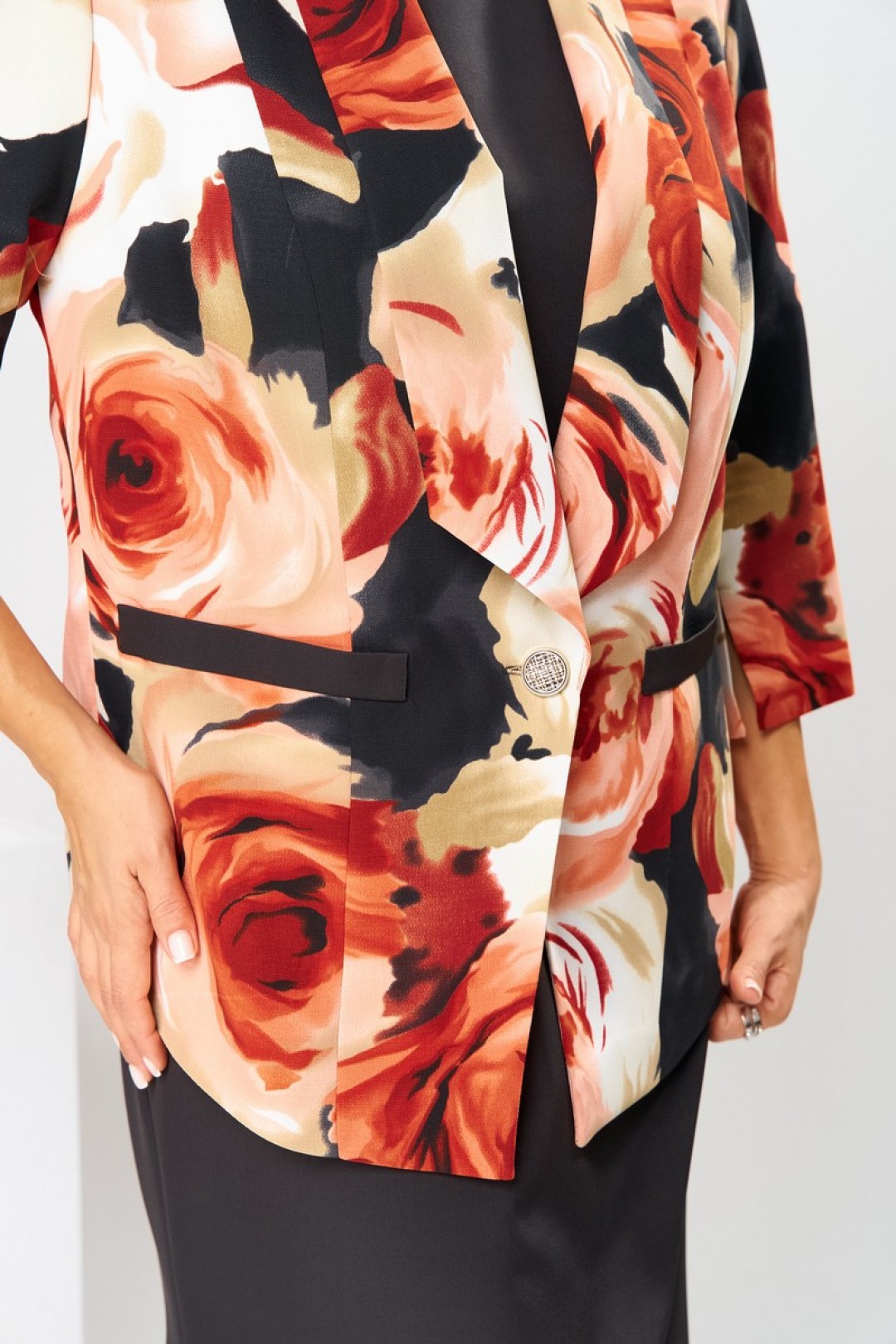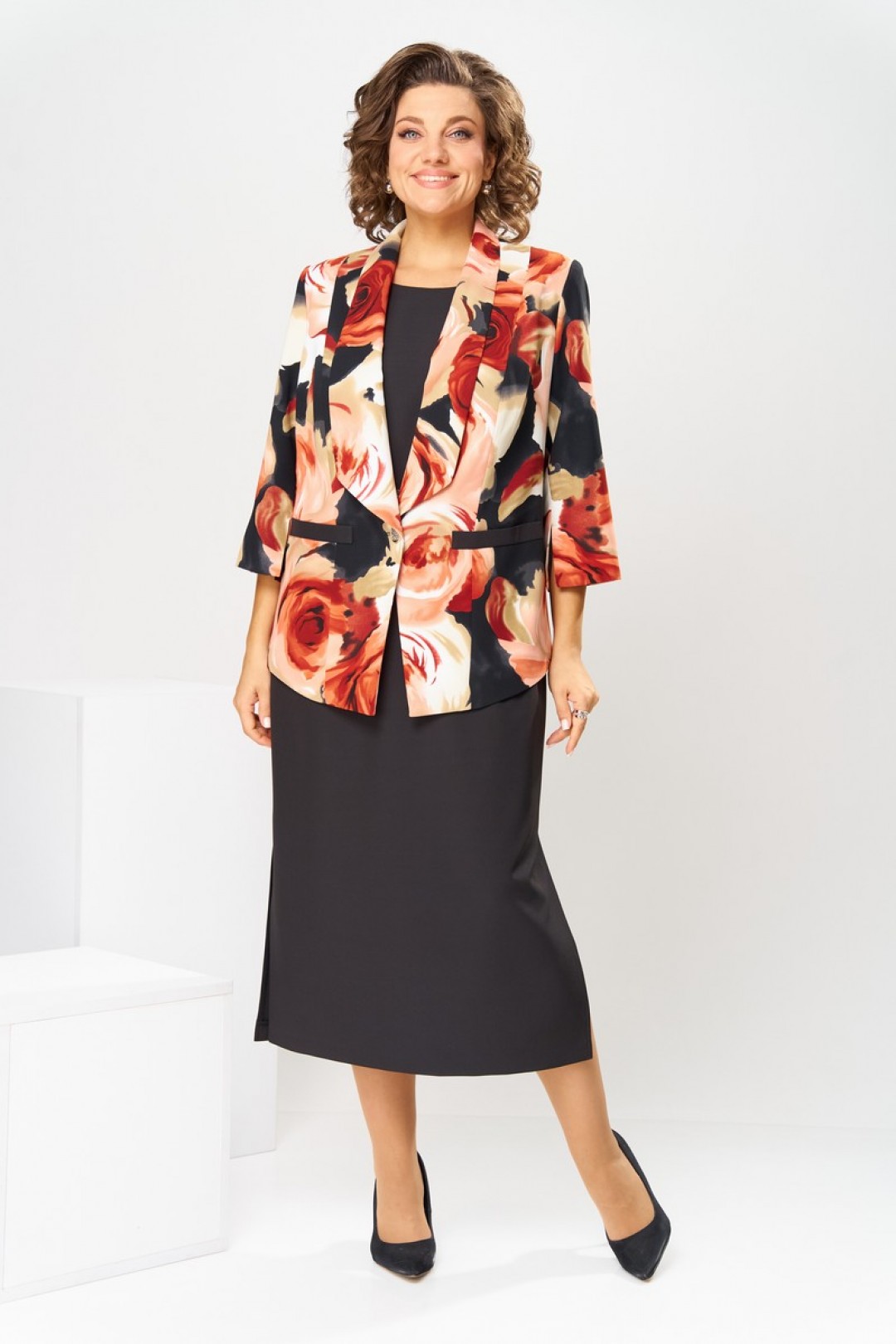 Комплект женский относится к торжественной нарядной одежде. Комплект женский 2-х предметный жакет и платье. Жакет полуприлегающего силуэта с фигурным низом, длиной до линии бёдер. Перед с 2-мя отрезными рельефами и 2-мя настрочными листочками на уровне линии талии. Спинка со средним швом. Горловина с V-образным вырезом с цельнокроеным воротником. Застёжка центральная бортовая на 1-ну петлю и 1-ну пришивную пуговицу. Рукав втачной, 2-х шовный, длиной 3/4, с разрезом внизу локтевого шва. Жакет на приточной подкладке. Жакет с плечевыми накладками. Платье женское полуприлегающего силуэта, длиной до середины икры. Платье отрезное по линии талии. Верхняя часть переда с 2-мя отрезными бочками; нижняя часть переда с 2-мя таллиевыми выточками. Шов соединения частей переда по линии талии декорирован термо тесьмой. Спинка верхняя часть с 2-мя таллиевыми вытачками; нижняя часть спинки с 2-мя таллиевыми вытачками. Боковые швы с разрезами. Горловина круглая обточная без воротника. Застёжка на потайную тесьму-молнию в левом боковом шве платья. Рукав втачной, короткий одношовный. Платье без плечевых накладок.