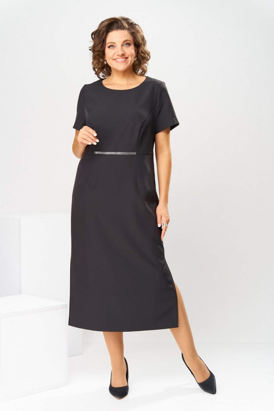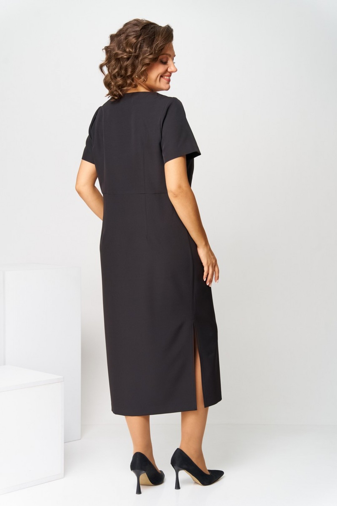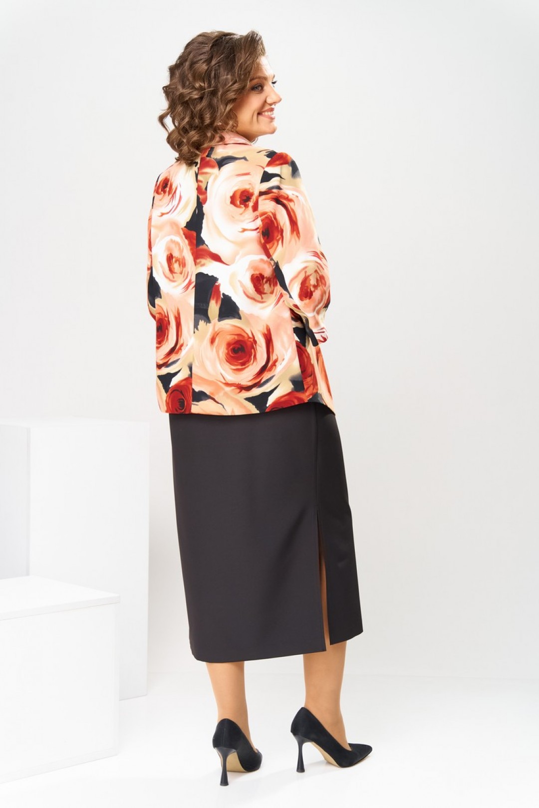 Комплект женский относится к торжественной нарядной одежде. Комплект женский 2-х предметный жакет и платье. Жакет полуприлегающего силуэта с фигурным низом, длиной до линии бёдер. Перед с 2-мя отрезными рельефами и 2-мя настрочными листочками на уровне линии талии. Спинка со средним швом. Горловина с V-образным вырезом с цельнокроеным воротником. Застёжка центральная бортовая на 1-ну петлю и 1-ну пришивную пуговицу. Рукав втачной, 2-х шовный, длиной 3/4, с разрезом внизу локтевого шва. Жакет на приточной подкладке. Жакет с плечевыми накладками. Платье женское полуприлегающего силуэта, длиной до середины икры. Платье отрезное по линии талии. Верхняя часть переда с 2-мя отрезными бочками; нижняя часть переда с 2-мя таллиевыми выточками. Шов соединения частей переда по линии талии декорирован термо тесьмой. Спинка верхняя часть с 2-мя таллиевыми вытачками; нижняя часть спинки с 2-мя таллиевыми вытачками. Боковые швы с разрезами. Горловина круглая обточная без воротника. Застёжка на потайную тесьму-молнию в левом боковом шве платья. Рукав втачной, короткий одношовный. Платье без плечевых накладок.