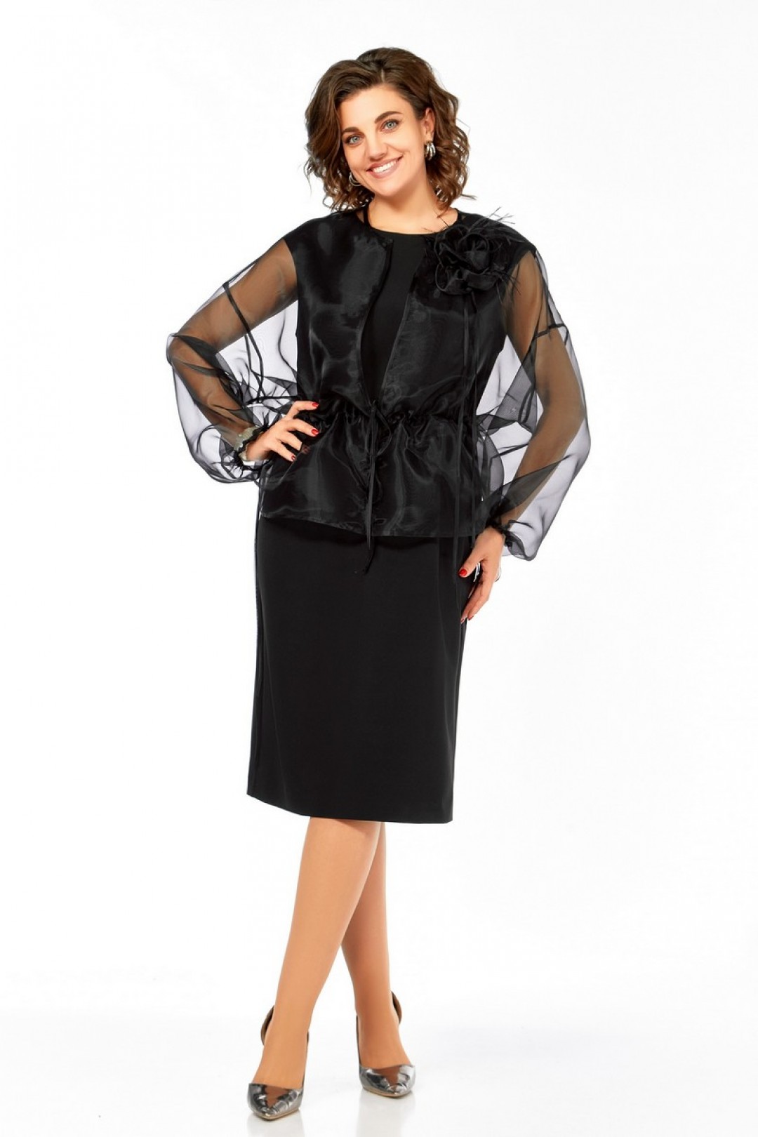 Женский вечерний комплект – это ваш идеальный нарядный образ для особых случаев. Этот стильный праздничный комплект, состоящий из накидки из органзы и изящного платья. Комплект станет ярким акцентом вашего гардероба и подарит уверенность в себе на любом торжественном мероприятии. Накидка свободного силуэта, со спущенным длинным рукавом. Горловина округлой формы, застежка на талии на завязку. По талии кулиска. Рукав по низу присобран тонкой кулиской. Его текстура и свободный силуэт делают этот образ модным и удобным. Платье, выполненное из плательной ткани, полуприлегающего силуэта мягко обрисовывает фигуру, делая образ завершенным и невероятно женственным. Платье с округлой горловиной, слегка спущенной линией плеча, нагрудные вытачки. Застежка на потайную молнию и разрез на спинке гарантируют удобство надевания и комфорт в движении. Позвольте себе быть неотразимой на любом празднике.