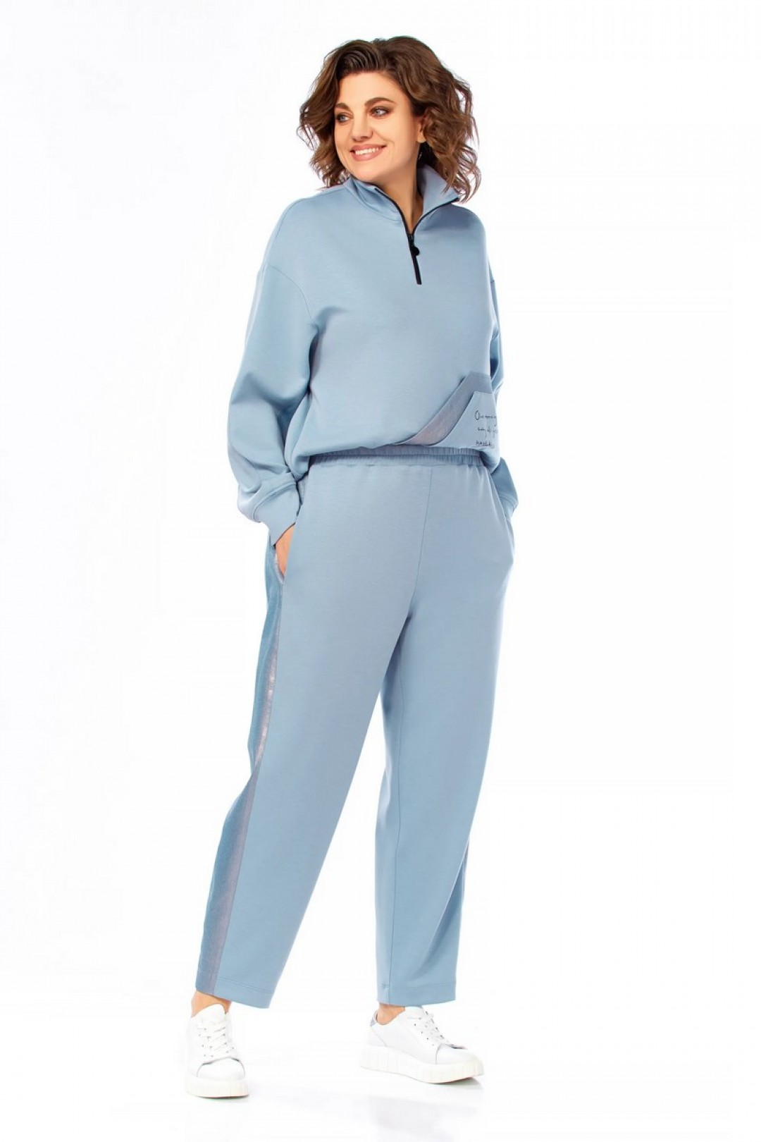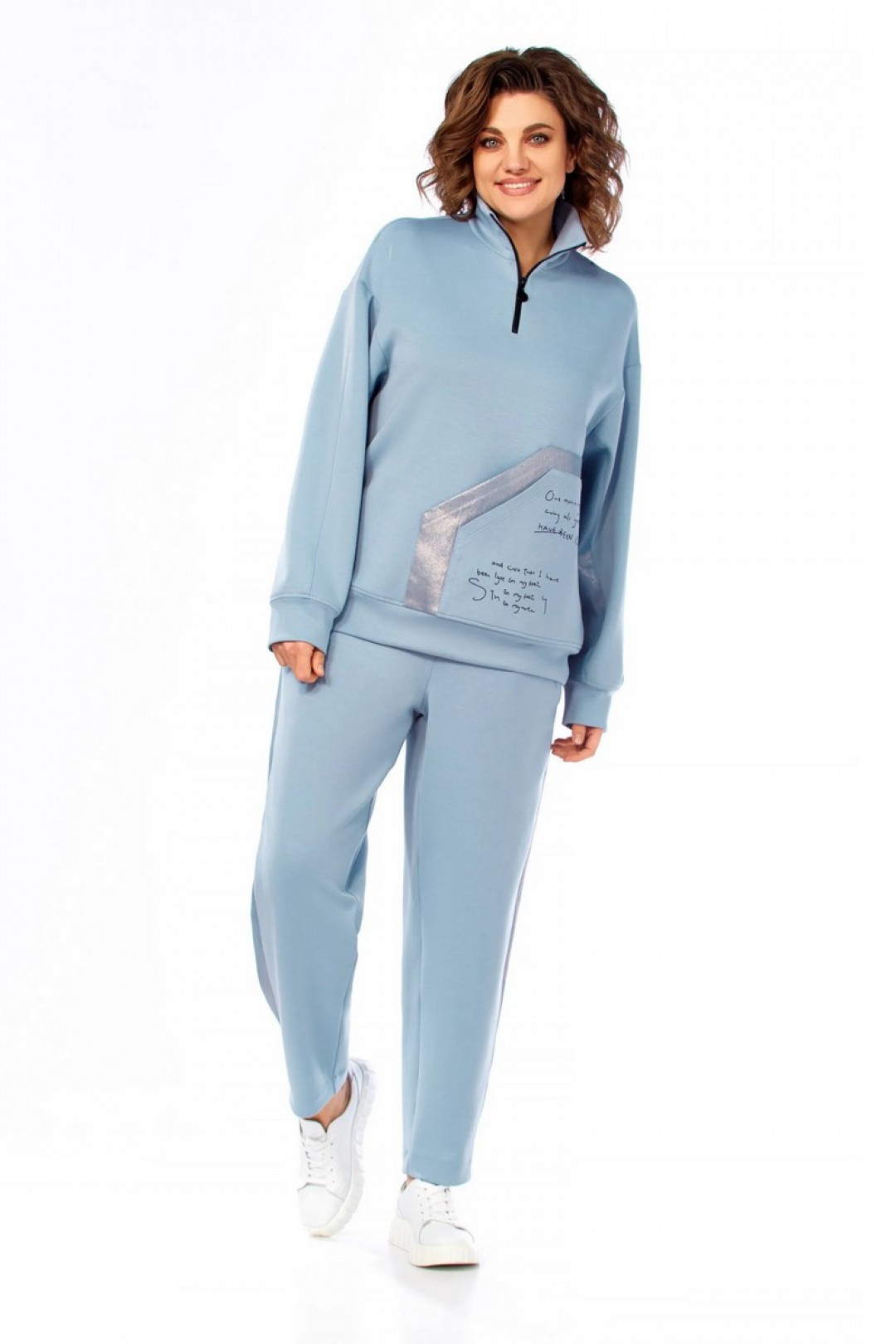 Интересный костюм в стиль спорт-шик, состоит из свитшота и брюк. Свитшот с воротником-стойкой, по центру коетрастеая молния. Оригинальный настрачной карман с принтом и отделочной тканью. Спущенная линия плеча, рукав с манжетой. Низ с притачной планкой. Брюки интерестного кроя, на поясе с отделочными деталями вдоль бокового шва