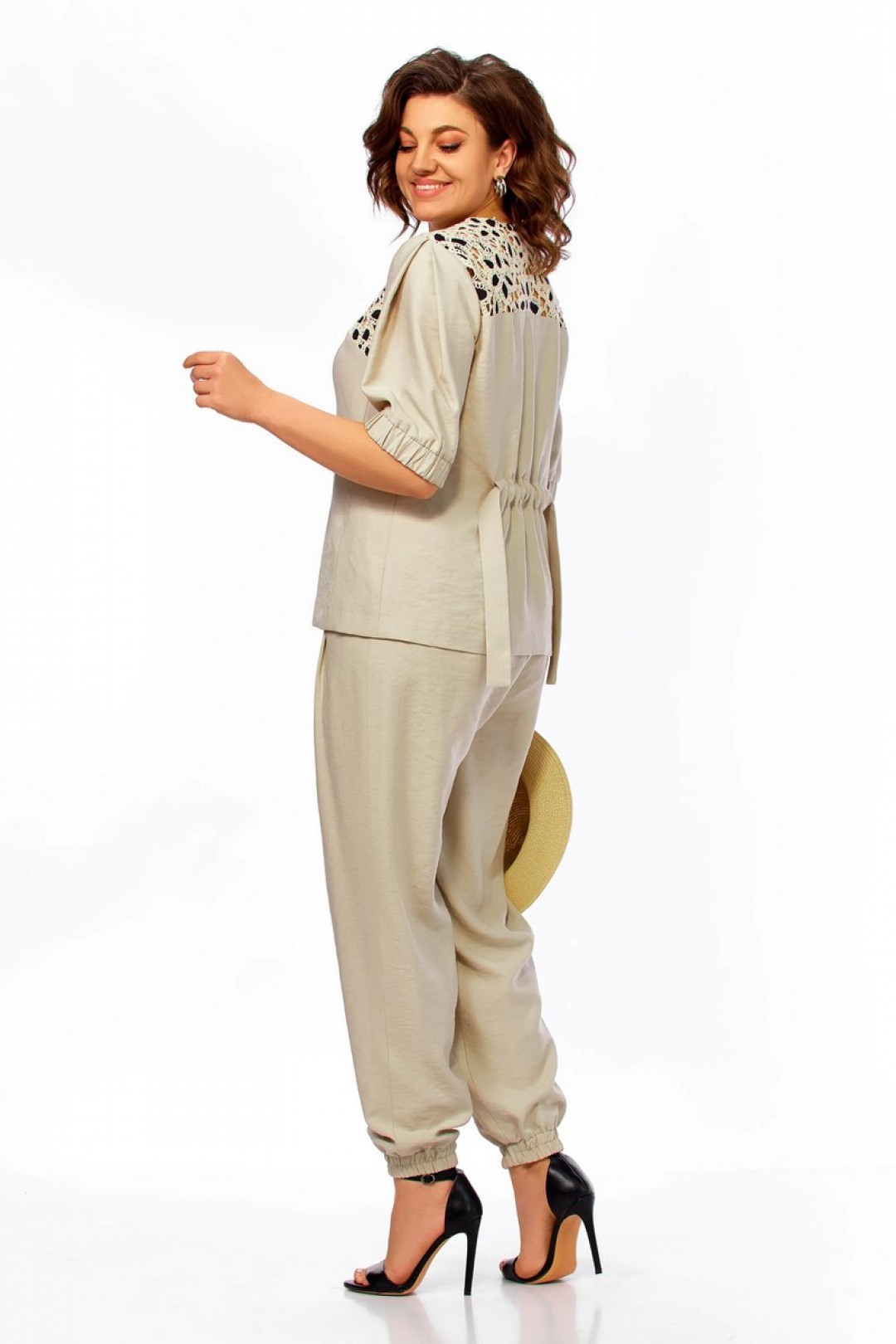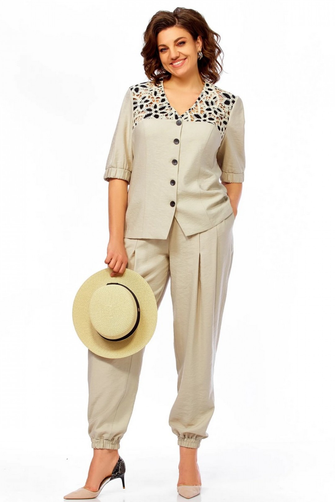 Костюм женский, жакет с коротким рукавом и брюки-алладины. Жакет с V-образной горловиной. Отрезная кокетка из отделочной ткани. По переду рельефы, спинка со средним швом и кулиской. Брюки с боковыми карманами, частично на резинке, застроченные складки по переду. По низу притачные манжеты на резинке.