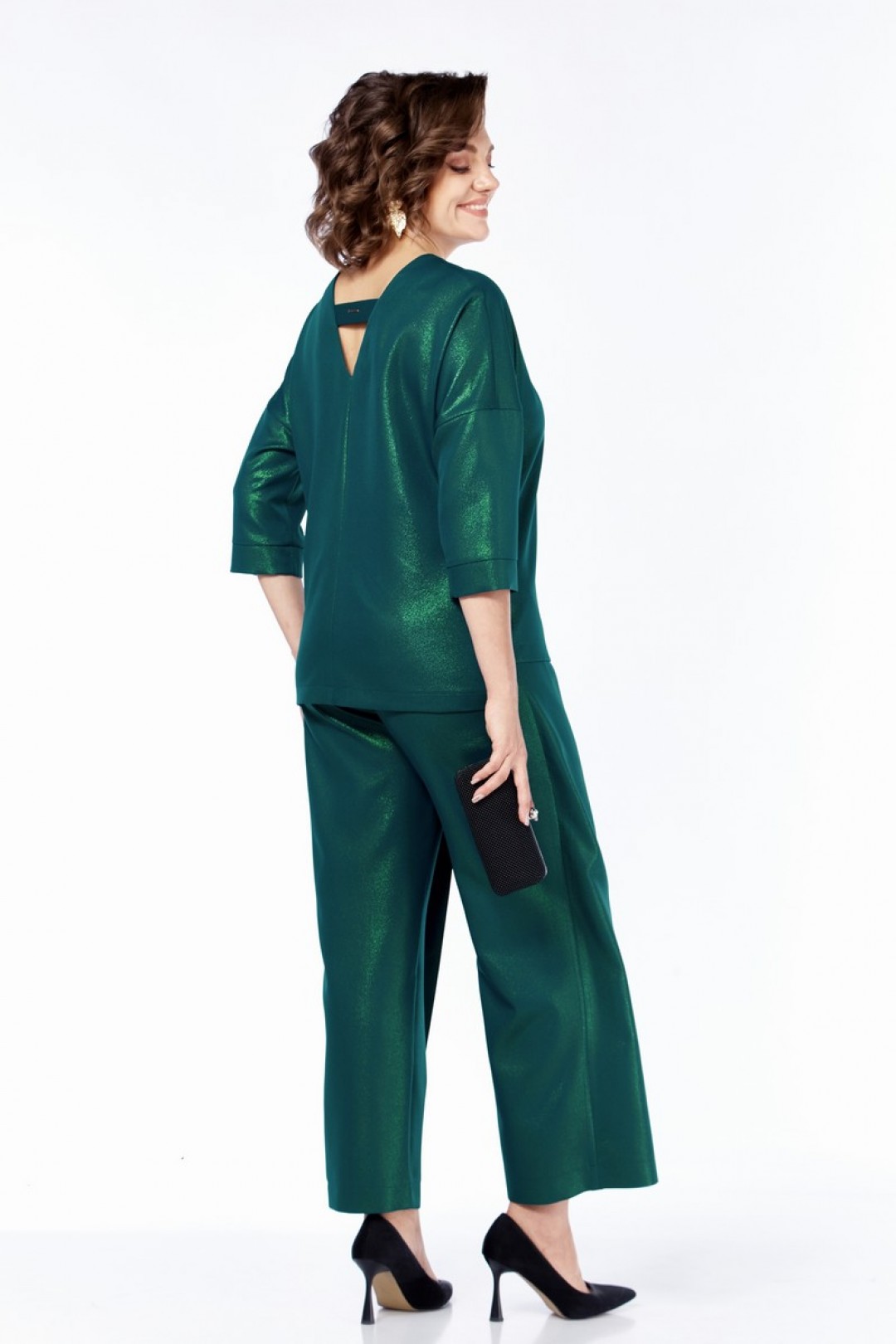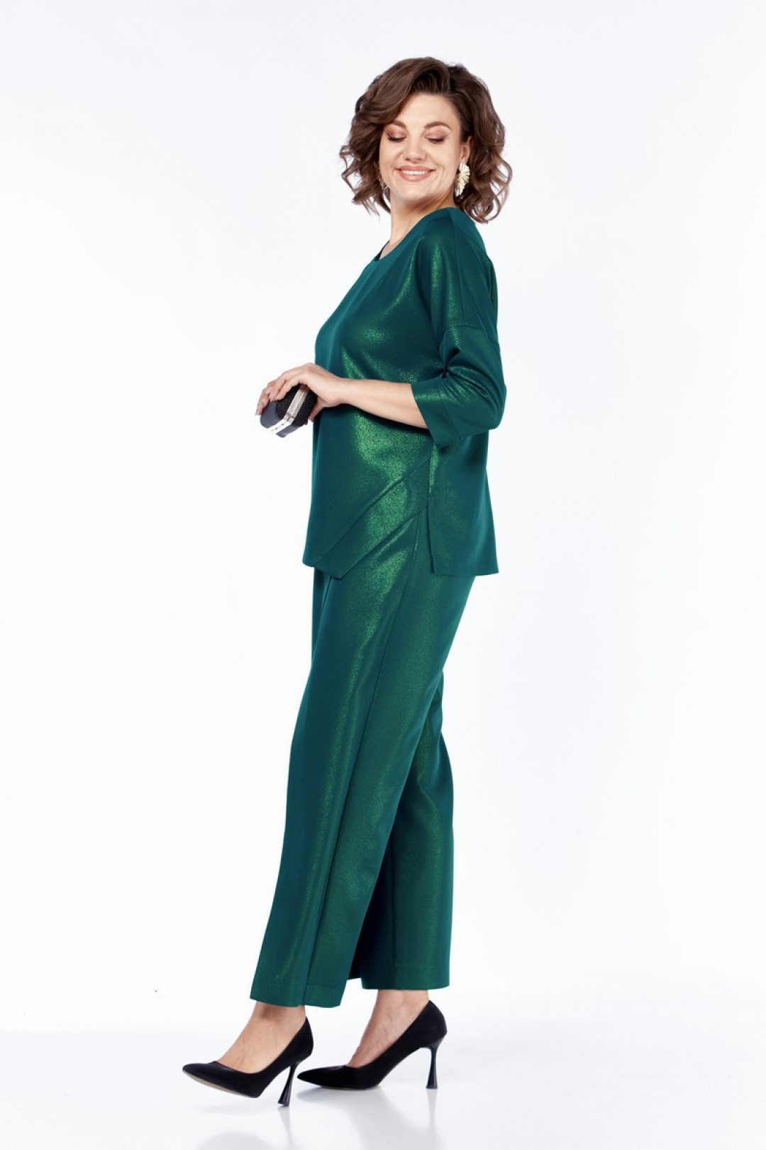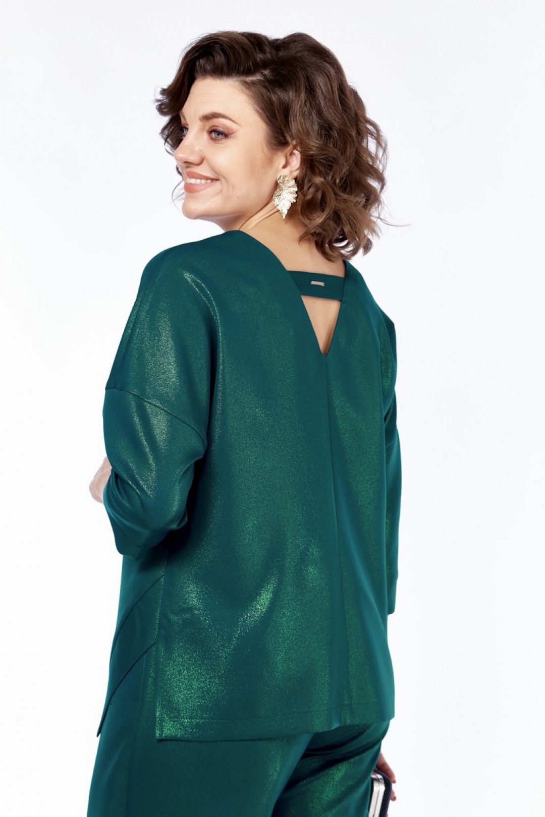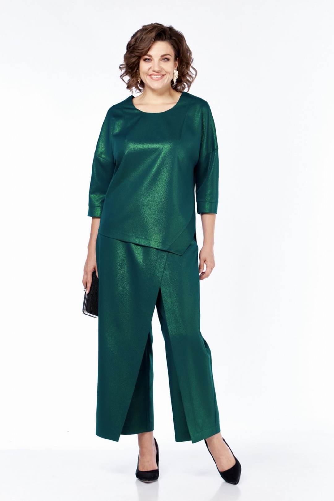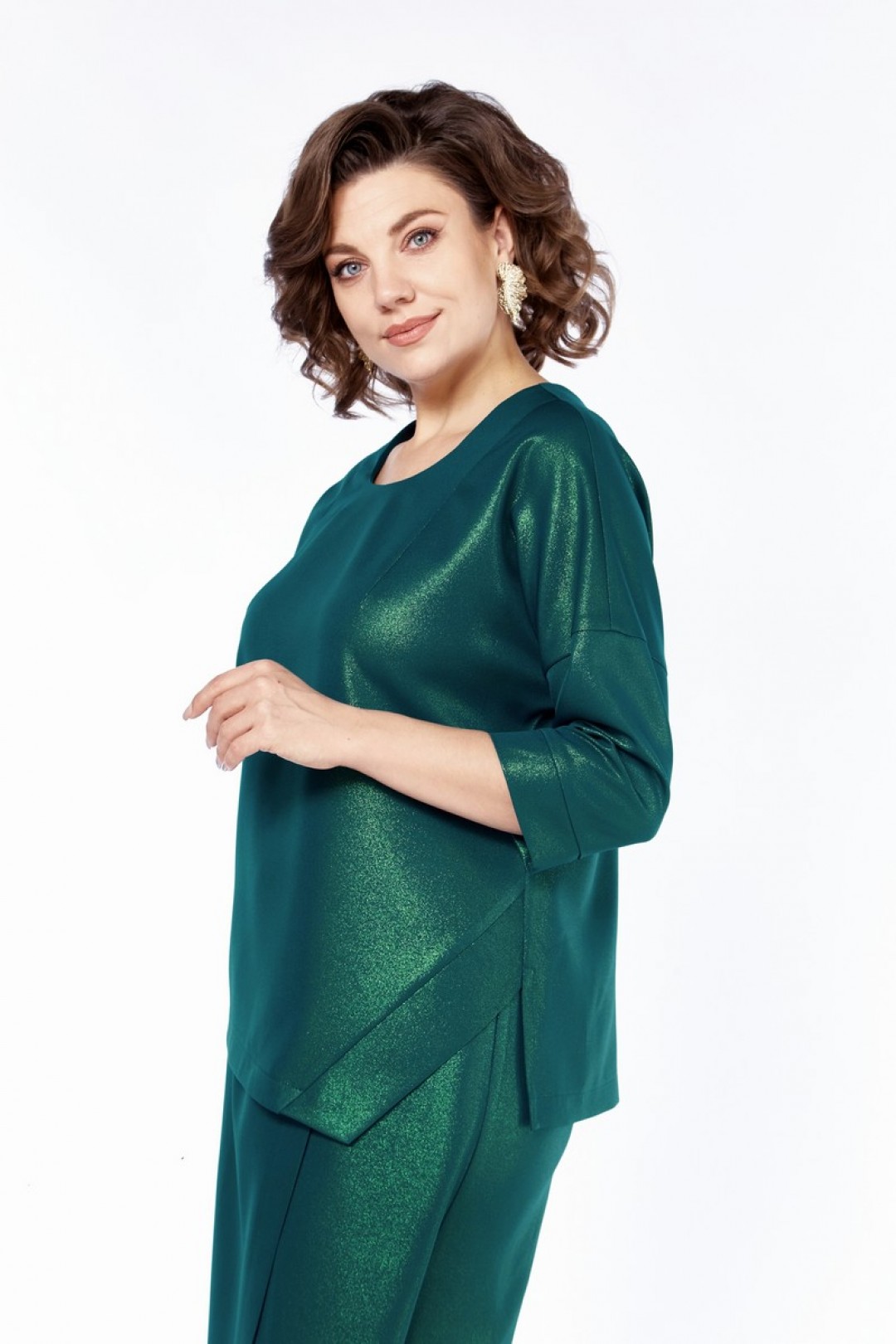 Женский нарядный двухпредметный костюм состоит из блузы и брюк с имитацией юбки спереди,выполнен из плательно-костюмной однотонной ткани с блестящим напылением.