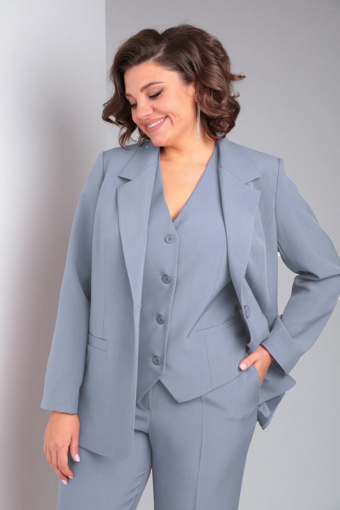 Костюм женский 3-х предметный, полуприлегающего силуэта. Состоит из жакета и жилета на подкладке и брюк.