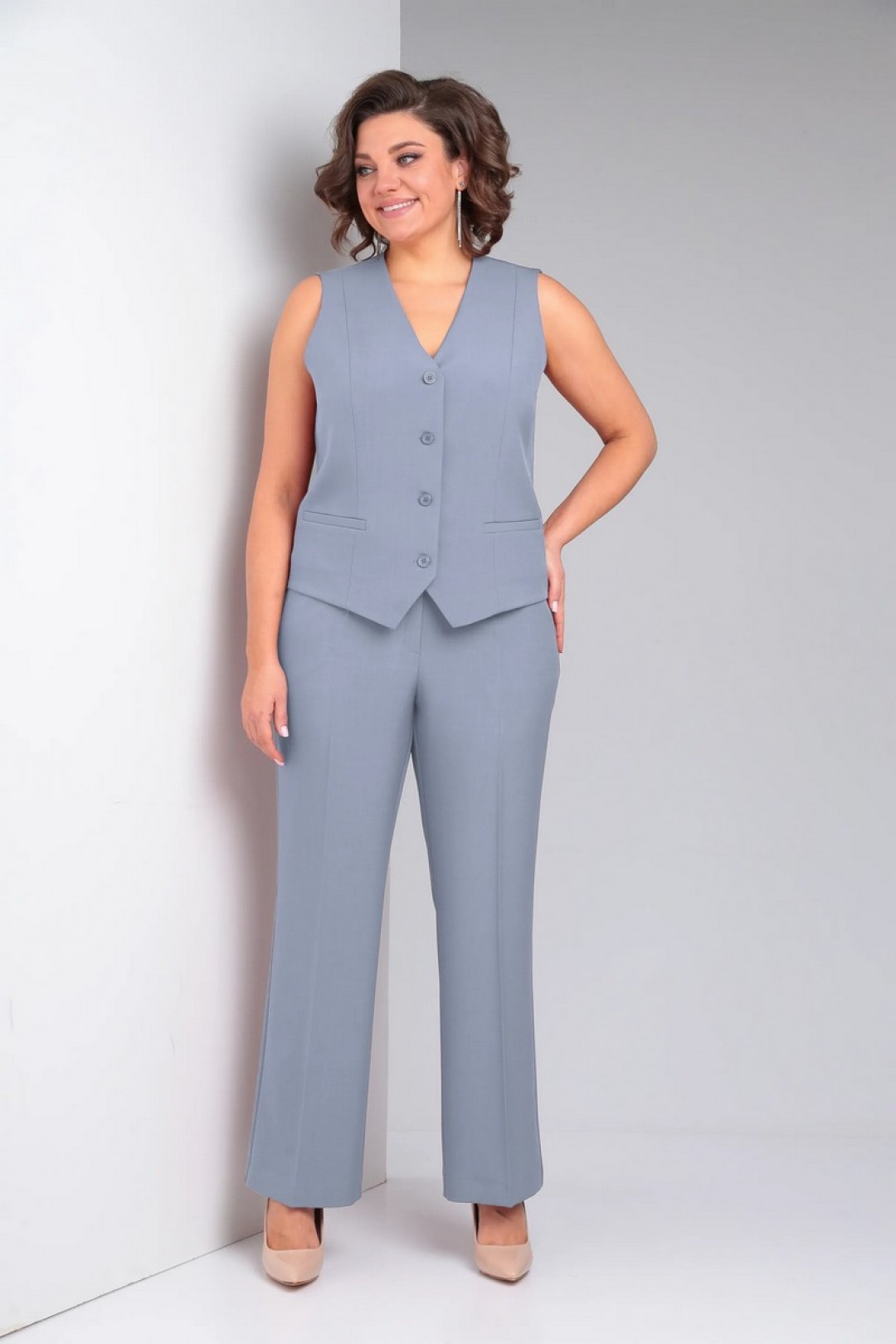 Жилет с рельефными швами от пройм до низа по переду и спинке, с центральной застёжкой на 4 петли и 4 пуговицы. Перед с прорезными карманами с листочками с втачными концами.