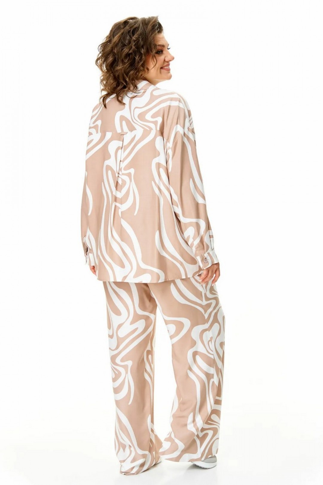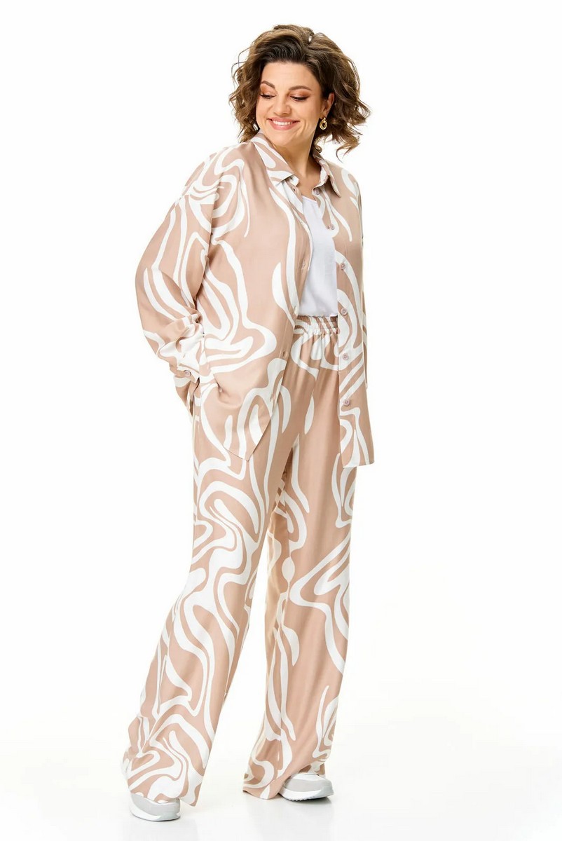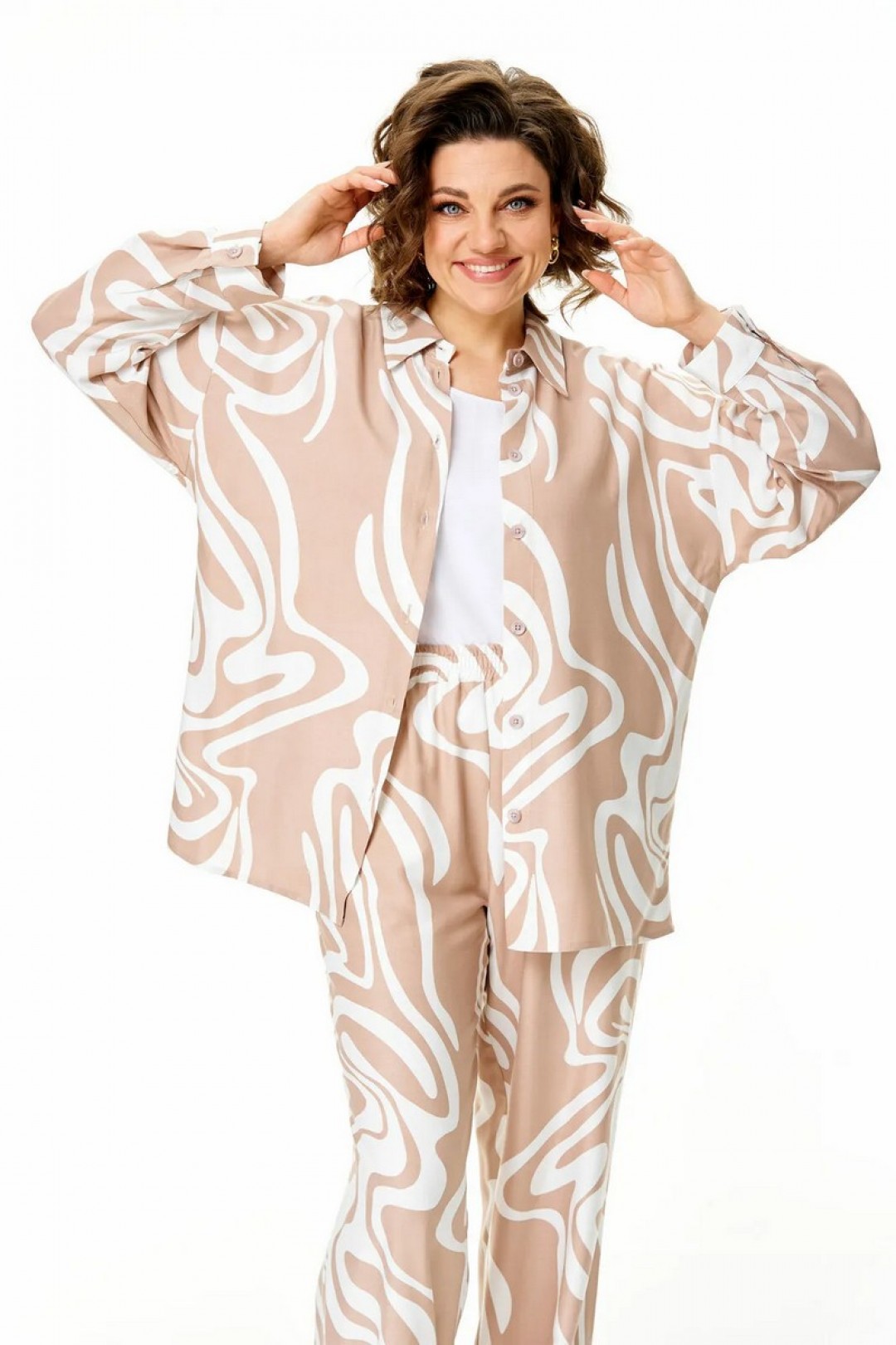 Комплект женский состоит из блузы, брюк и топа. Блуза свободного покроя со спущенной линией плеча. Центральная бортовая застёжка с планкой на петли-пуговицы Рукав втачной одношовный. Низ рукава с манжетой и складками. Спинка с кокеткой и встречной складкой. Воротник на отрезной стойке блузочного типа. Топ свободного покроя. Горловина округлой формы. Проймы и горловина окантованы. Брюки свободные прямого силуэта. Пояс притачной на резинке, регулируется шнуром с наконечниками. В боковых швах карманы