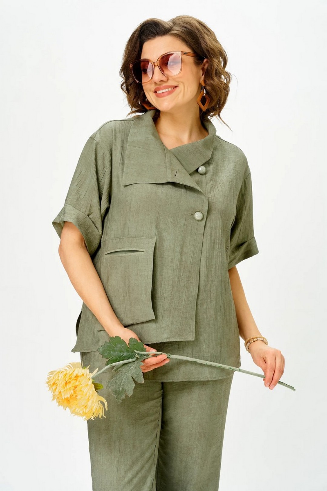 Костюм женский двухпредметный, состоящий из блузы и брюк. Блуза со смещенной бортовой застежкой на 2 петли-пуговицы и 1 потайную пуговицу. Перед с накладным отлетным карманом с рамкой по правой части переда фигурной формы. Низ изделия по переду ассиметричной формы. Спинка с горизонтальной кокеткой и двумя односторонними складками. Изделие имеет спущенную линию плеча. Рукав короткий с односторонней застроченной складкой. Воротник с отложными концами. В боковых швах обработаны разрезы. Брюки с притачным поясом сзади на резинке и с завязками от боковых швов пояса. Застежка на петлю-пуговицу по поясу и тесьму-молнию в средних срезах передних половинок брюк. В изделии обработаны карманы, наклонные к боковому шву. Брюки классического кроя, слегка зауженные книзу за счет односторонней складки по низу бокового шва. Рамка кармана блузы и завязки по поясу выполнены из отделочной ткани