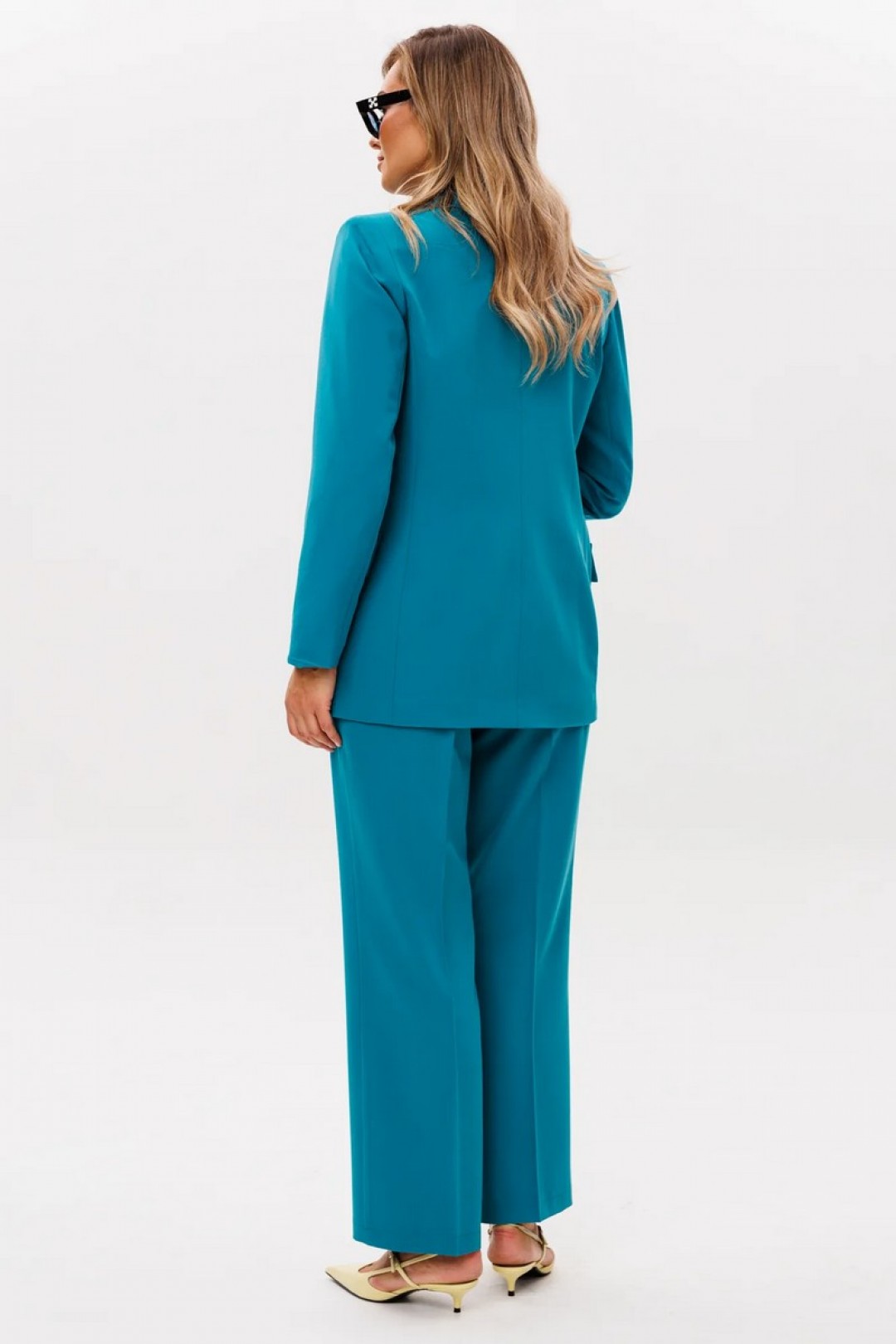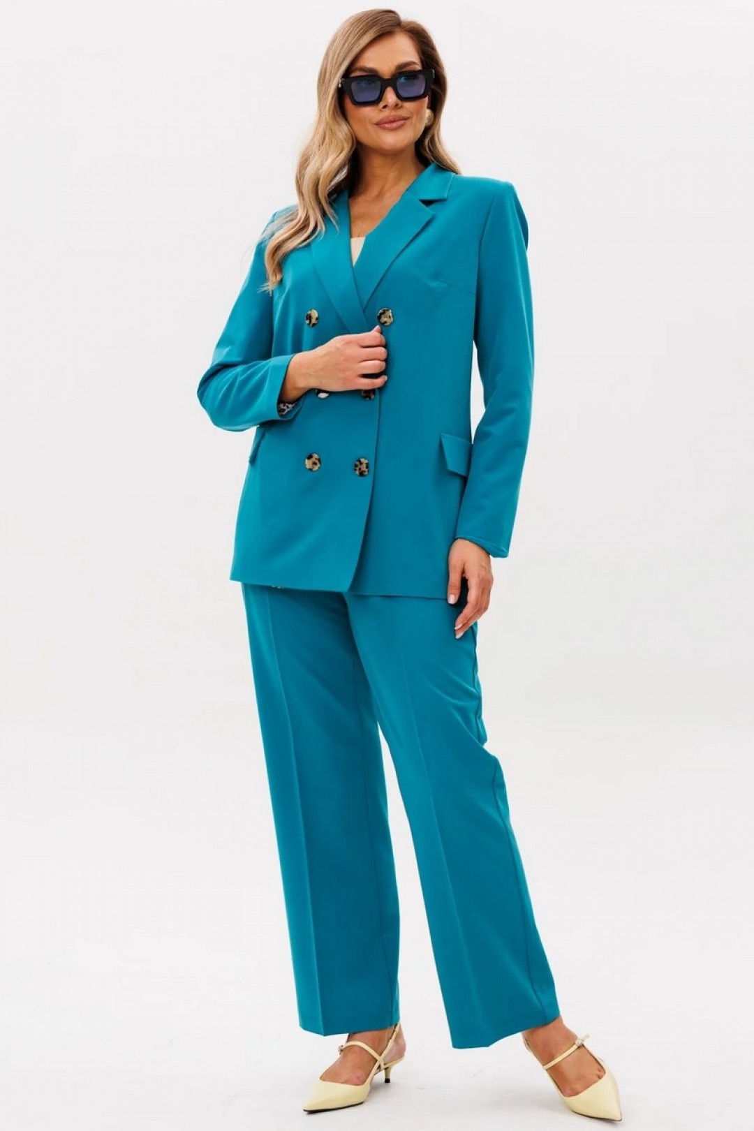Костюм женский 2-х предметный: жакет на подкладке и брюки. Жакет полуприлегающего силуэта: бочок с выточкой по полочке, по спинке средний шов. Застежка двубортная, карман клапан "обманка". Рукав втачной двухшовный. Брюки прямые со стрелками. Застежка по передней части на молнию. Пояс отрезной, по бокам вставлена резинка.