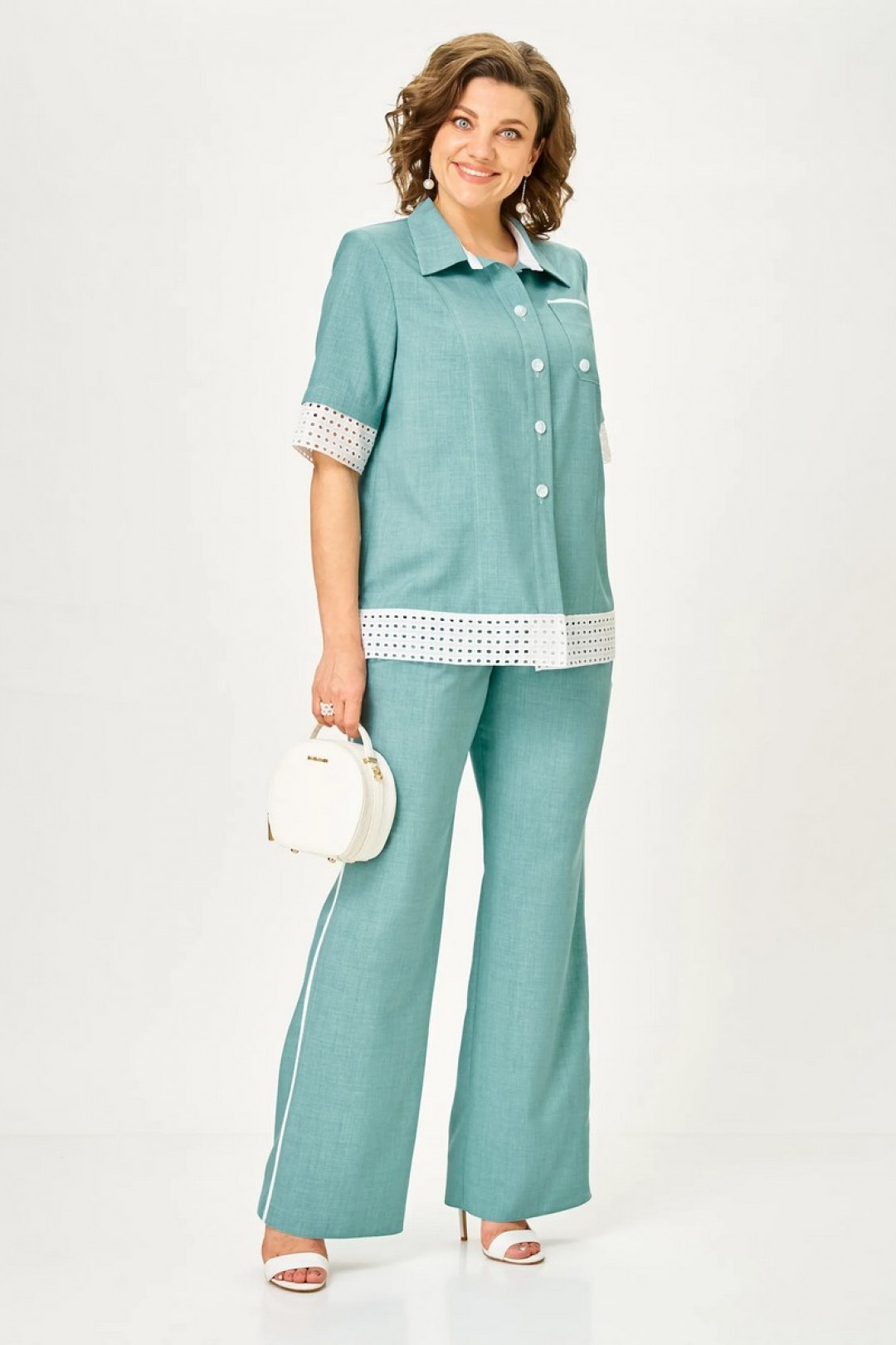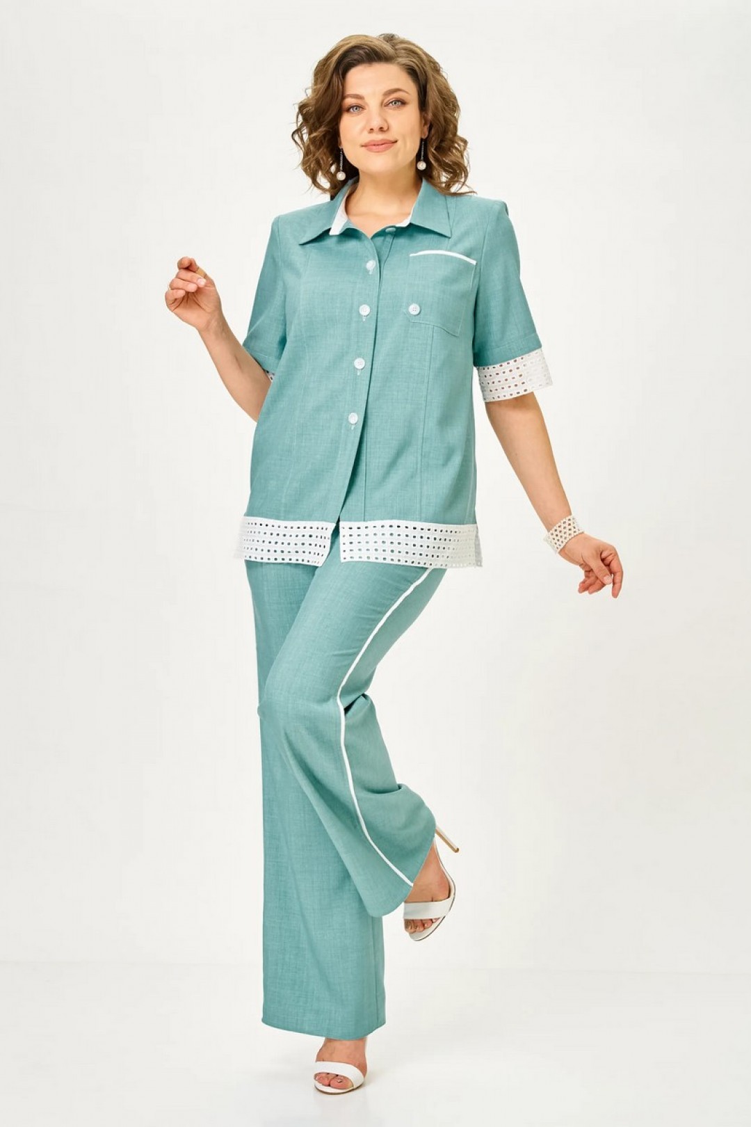 Костюм женский двухпредметный, состоящий из жакета и брюк. Жакет свободного силуэта с центральной застежкой на притачную планку на 5 петель-пуговиц и 1 петлю-пуговицу по стойке изделия. Перед с рельефными швами от плеча до низа и с накладным карманом на левой части изделия. По низу изделия и низа рукавов пришита отделка из кружевной ткани. Спинка цельная с защипом, имитирующим кокетку. В боковых срезах обработаны разрезы. Воротник с застежкой доверху, с отрезной стойкой из отделочной ткани. Рукав втачной короткий одношовный. Брюки прямые от бедра, с отделочным кантом и притачным поясом сзади на резинке. Застежка на тесьму-молнию в средних срезах передних половинок и 1 петлю-пуговицу по поясу