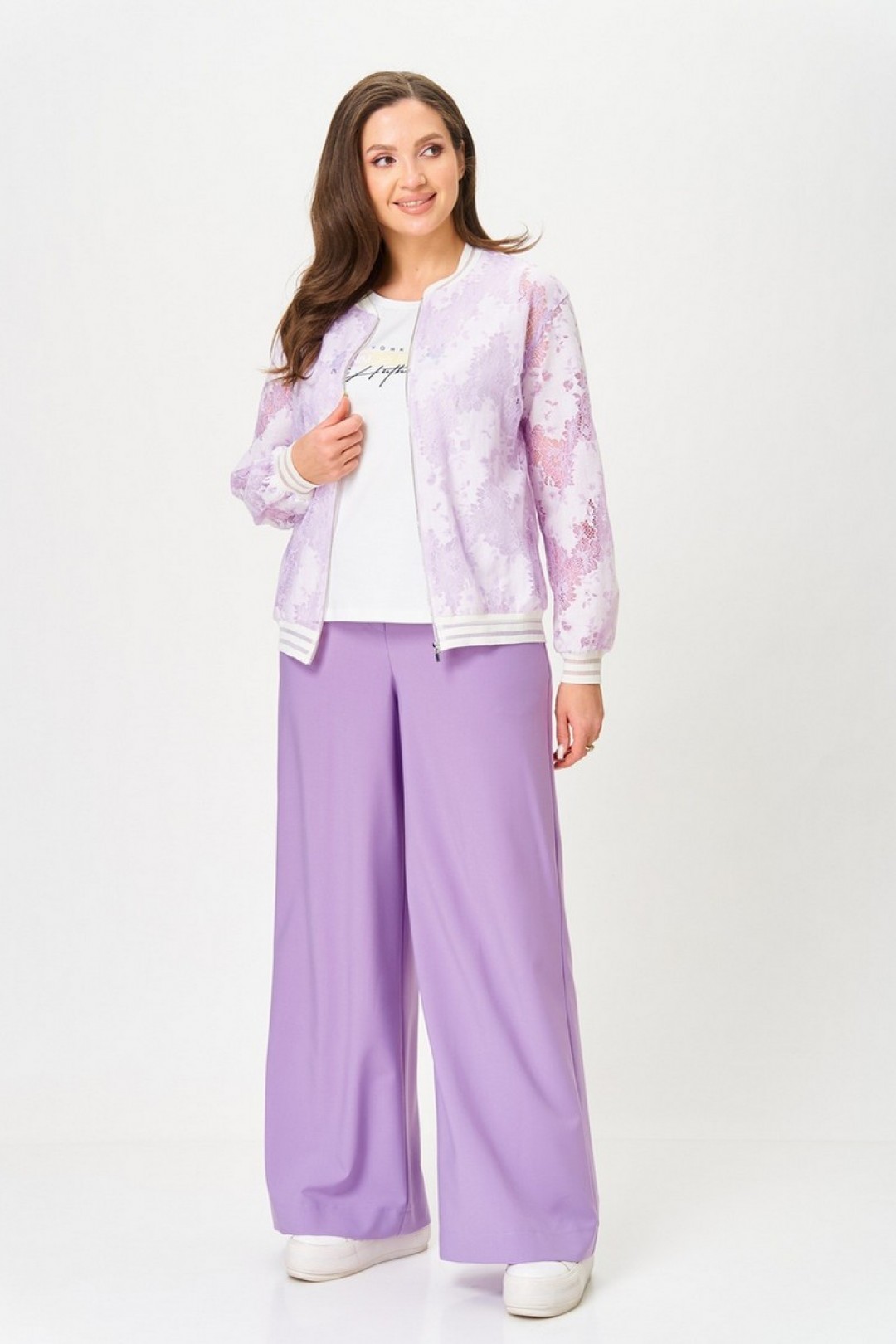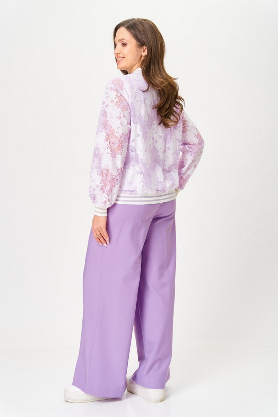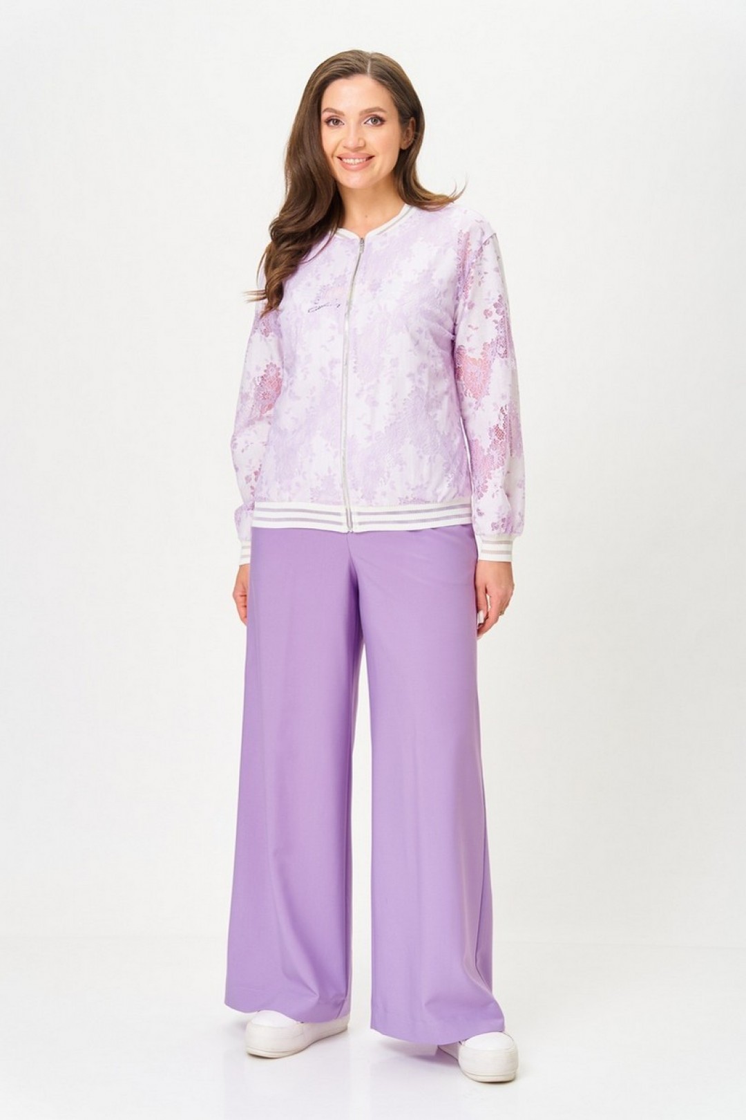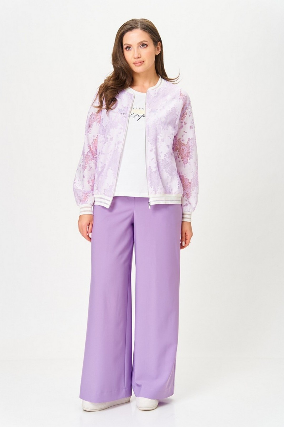 Бомбер свободного силуэта. Рукав втачной, спущенное плечо. По переду на застёжку-молнию. Округлый вырез горловины. Горловина, низ рукава и низ изделия- обработаны довязом. Майка без рукава, округлый вырез горловины. Брюки свободного силуэта. По талии на резинке, без застёжки, имитация гульфика. В боковых швах карманы-"хулиганы".