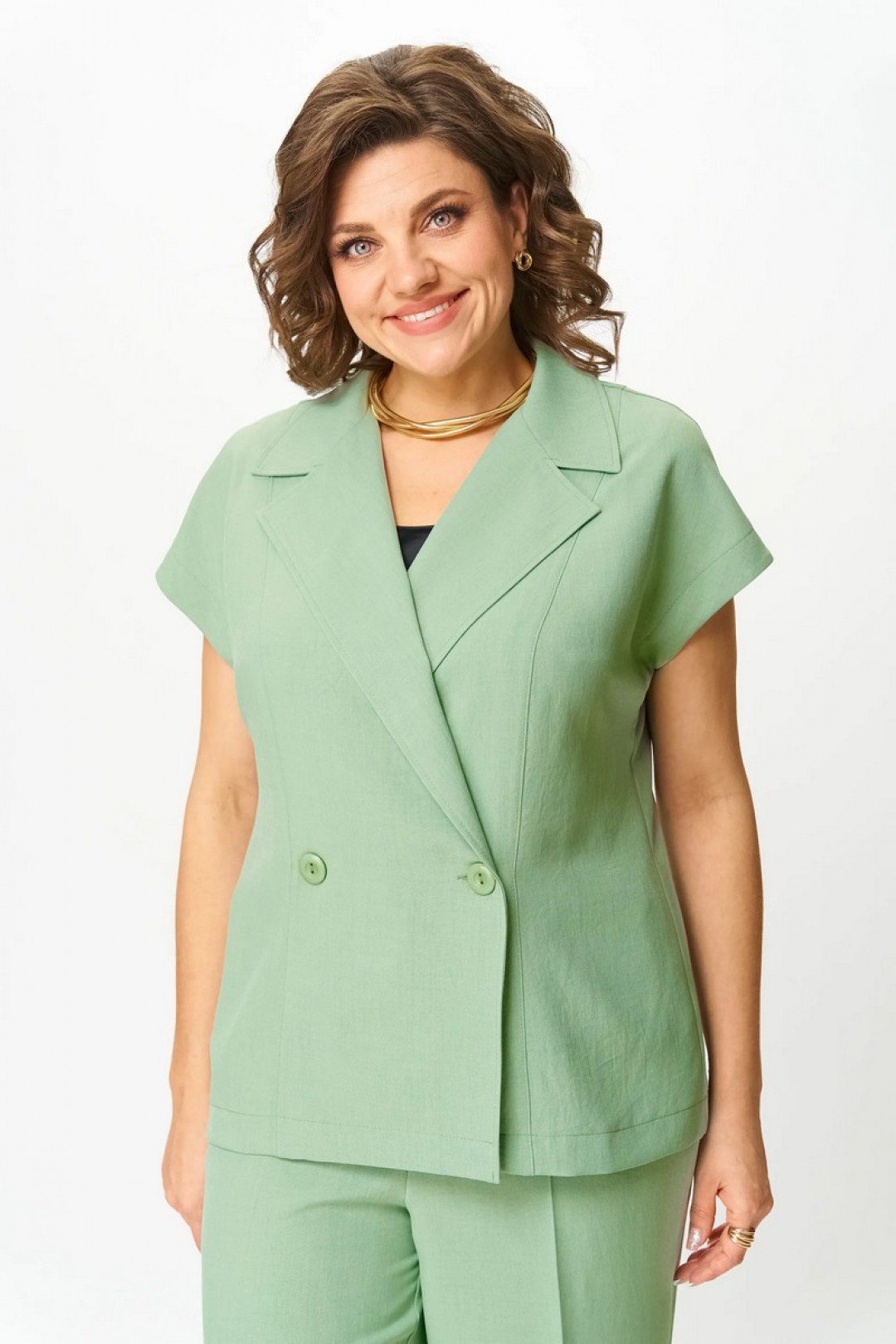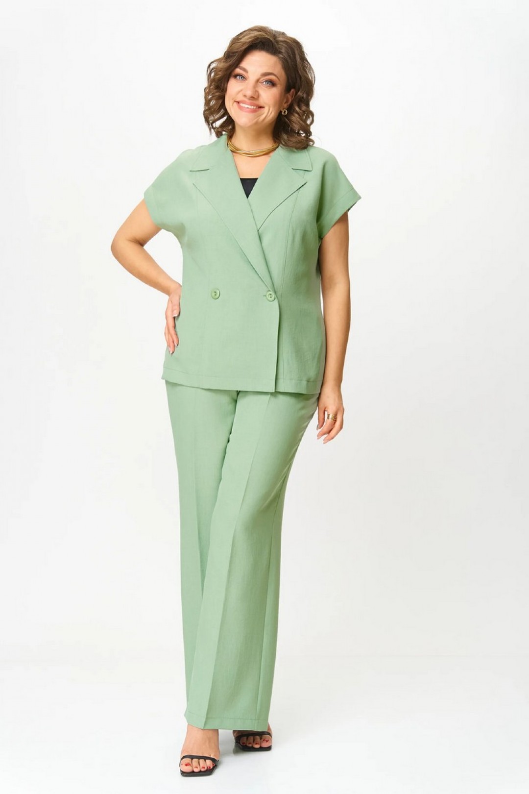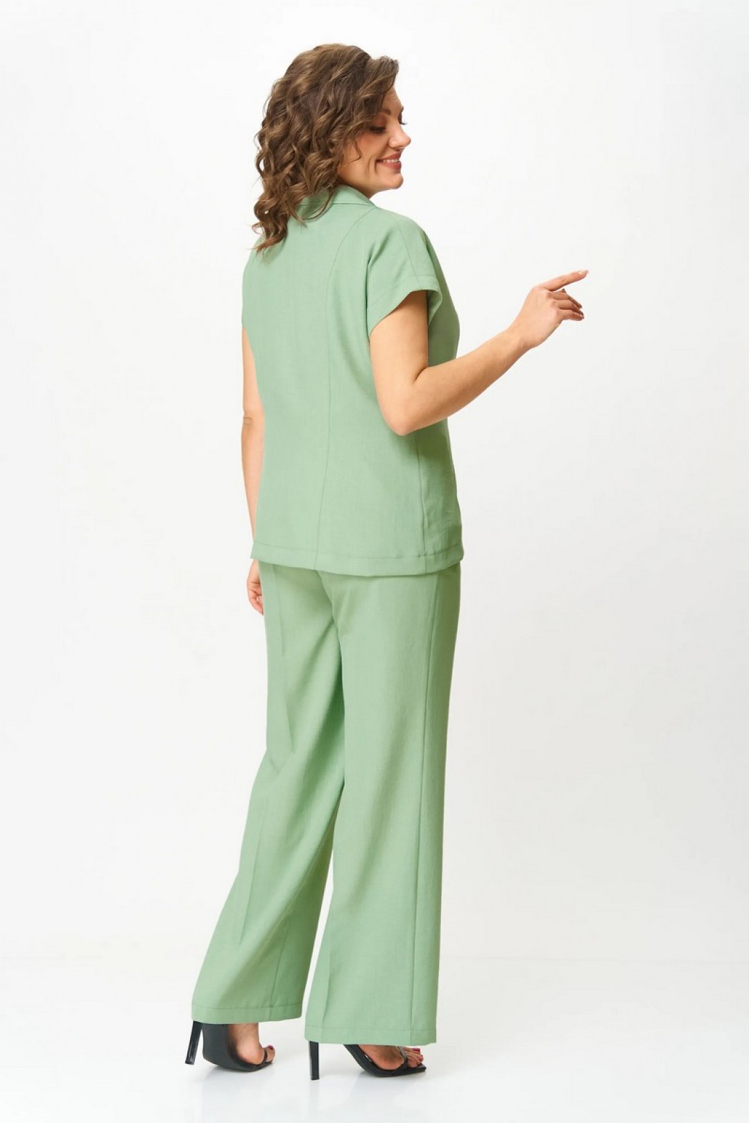 Костюм состоит из жакета и брюк, выполнен из ткани в полоску и однотонной ткани. Жакет полуприлегающего силуэта, длиной чуть ниже линии бедер. Жакет с застежками на один ряд петель и пуговиц, и воротником притачного типа. Полочка и спинка с рельефами от плечевого шва. Рукав цельнокроеный, короткий. Брюки прямые, длинные, свободные в верхней части, со стрелками. По передним половинам выполнены карманы. Брюки на притачном поясе с эластичной тесьмой
