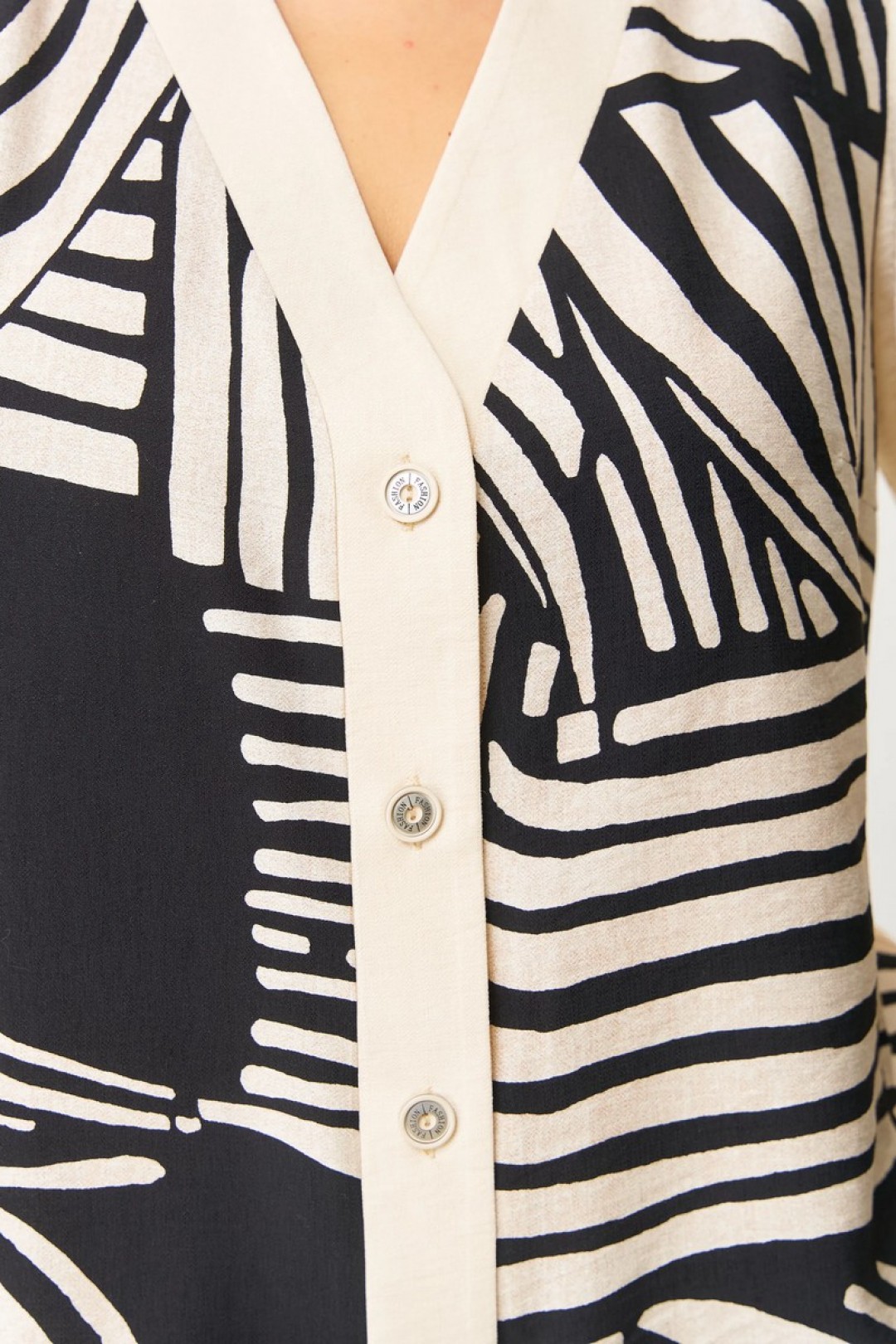 Блузка прямого силуэта. Полочка блузки с нагрудными вытачками, горловина V-образной формы, застежка центральная на петли и пуговицы по притачной планке. Полочка выполнена из отделочной ткани с принтом. Спинка цельная. Рукав длиной до локтя, одношовный, втачной.