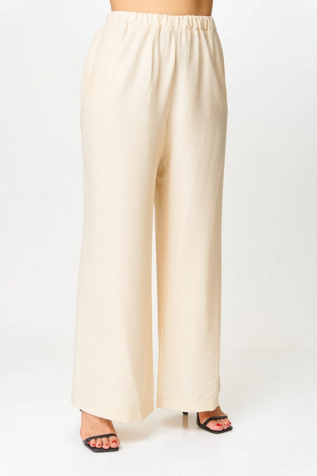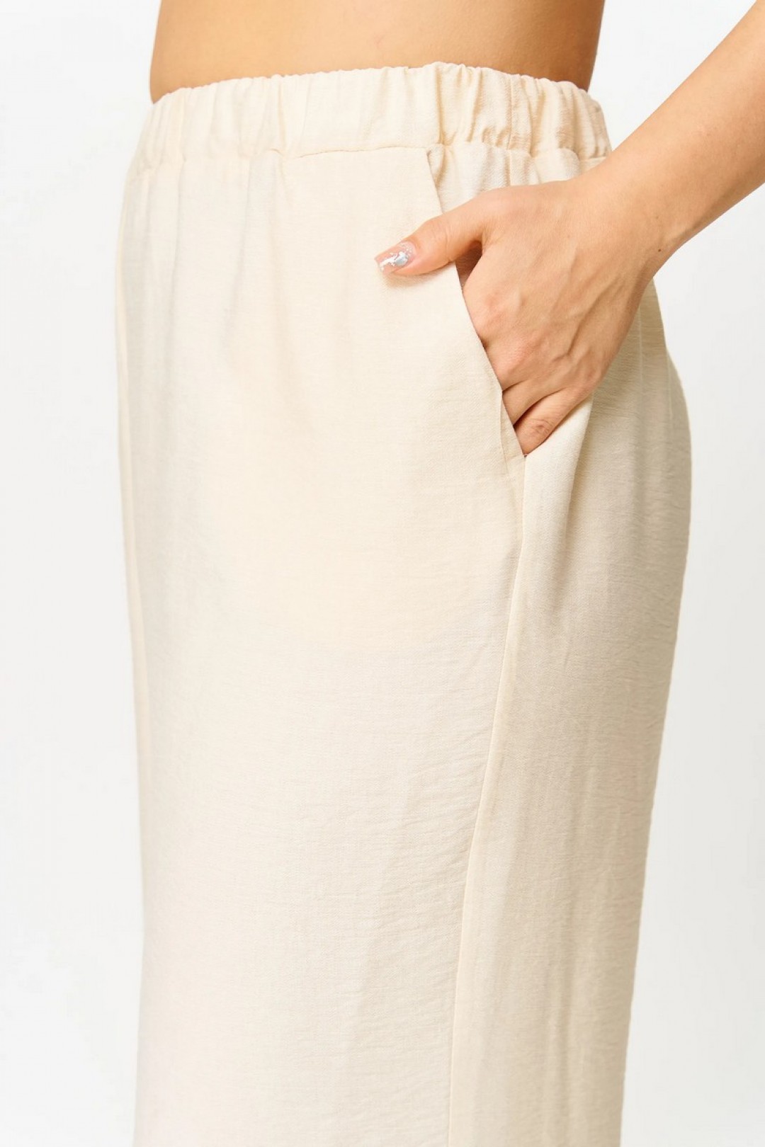 Брюки свободные, прямые, полной длины. По передним половинкам выполнены наклонные карманы. Брюки по поясу на притачном поясе с эластичной тесьмой