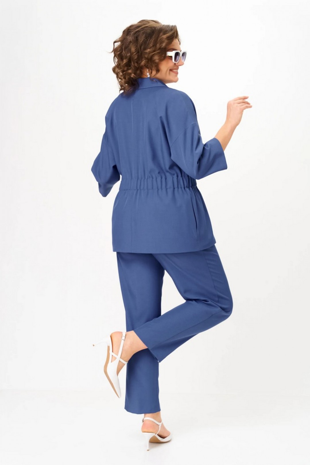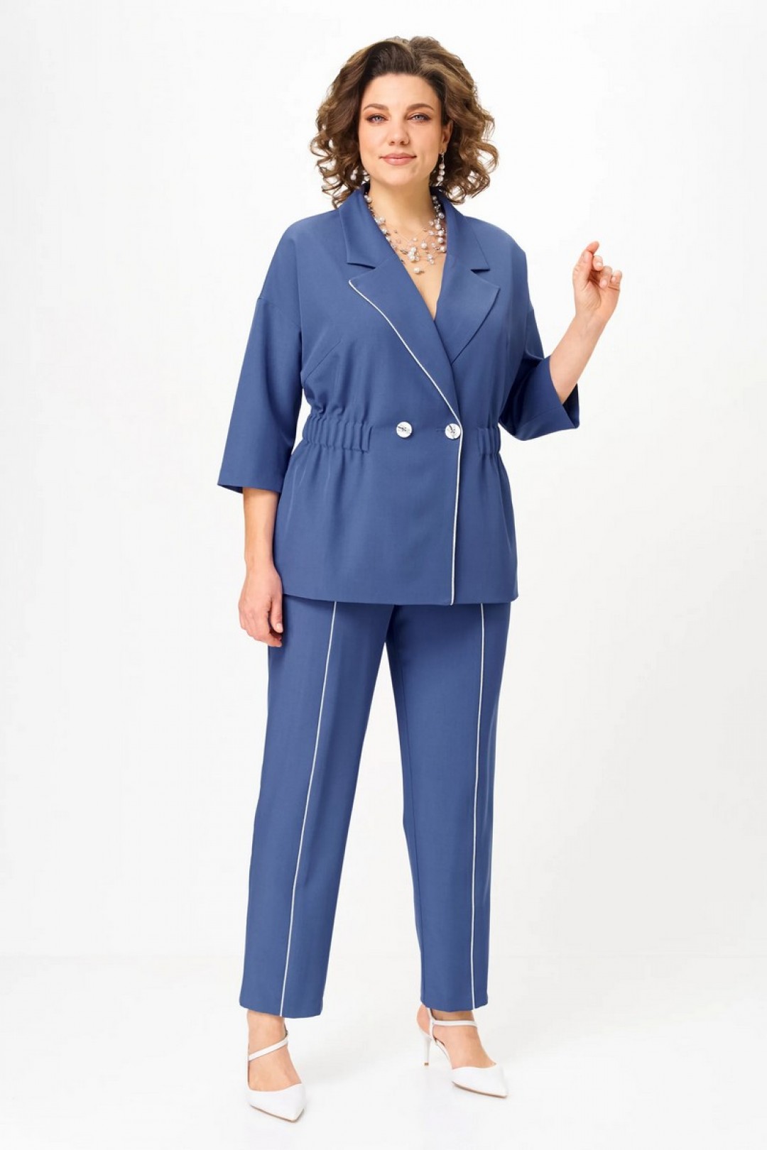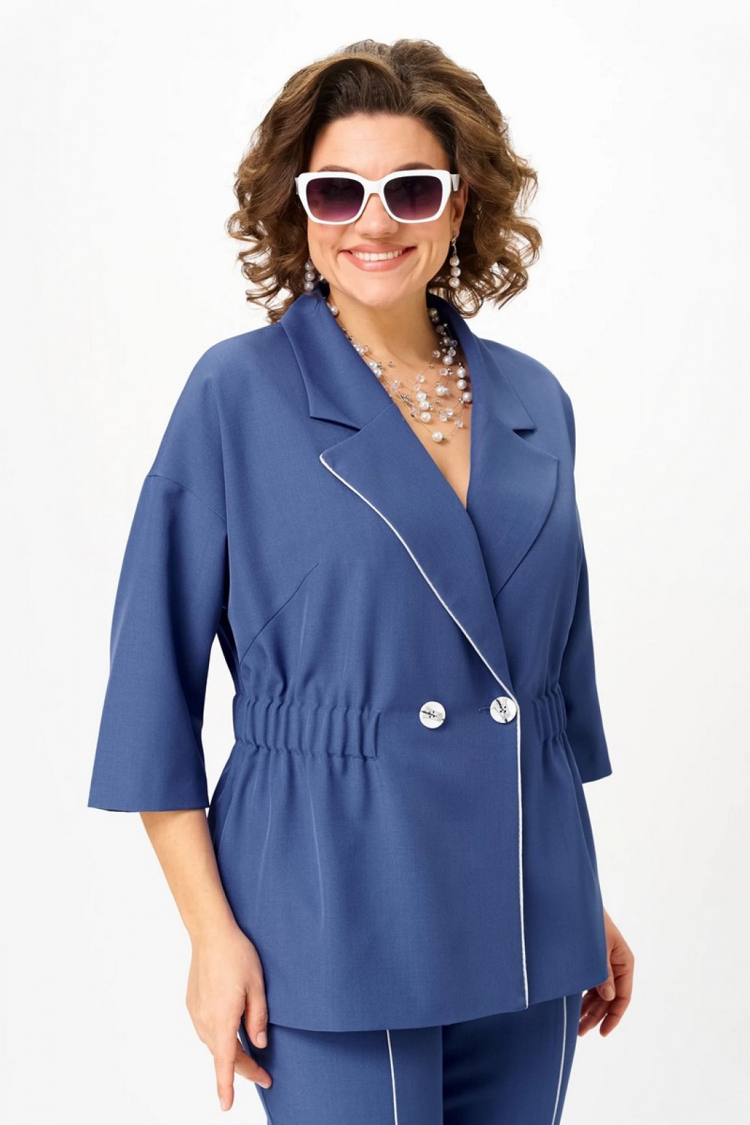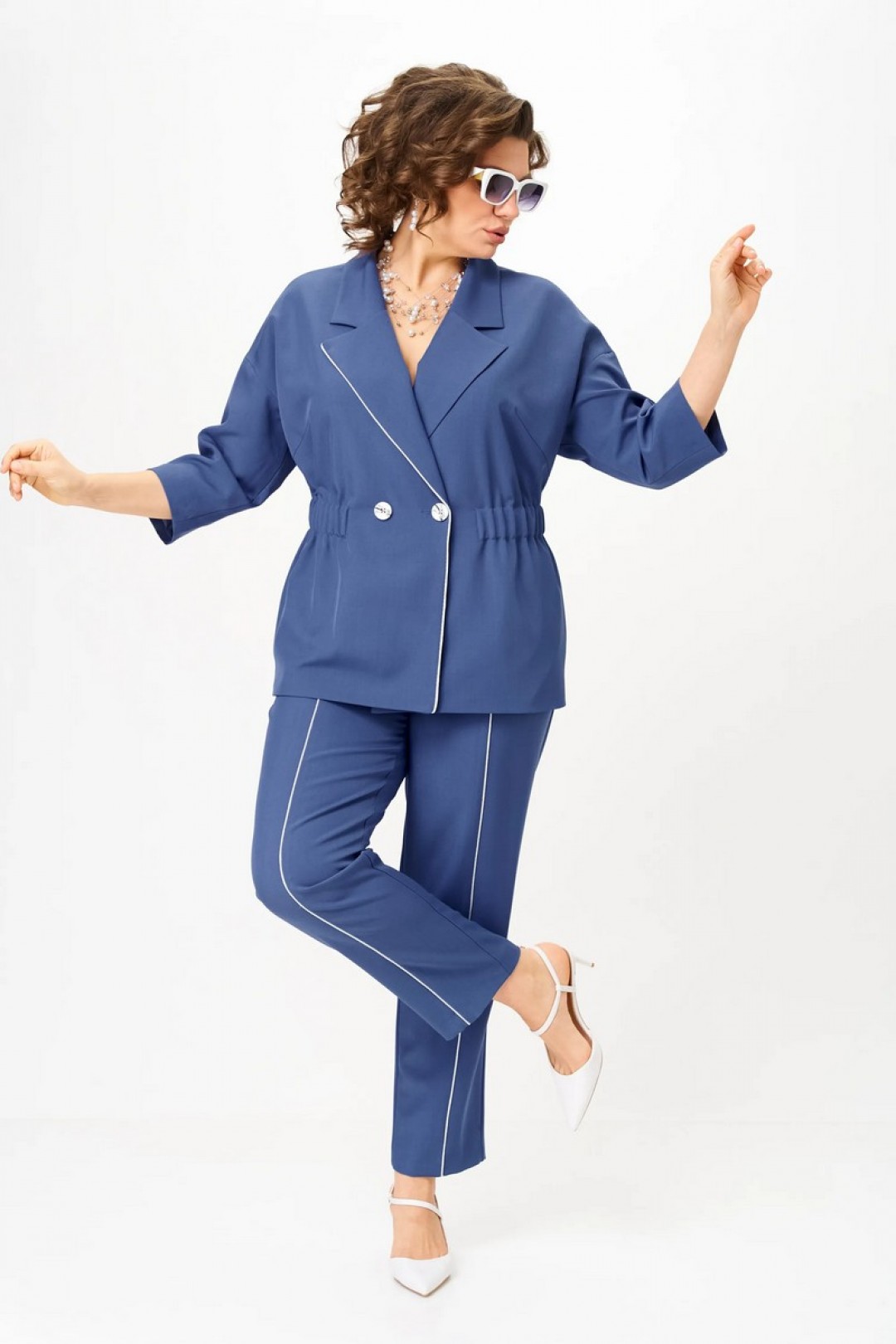Стильный женский костюм от бренда Anastasia, идеальный для любого случая. Этот костюм сочетает в себе элегантность и комфорт, что делает его подходящим как для деловых встреч или прогулок. Комплект состоит из жакета и брюк. Костюм женский 2-х предметный (жакет и брюки). Жакет на подкладке из текстильной ткани полуприлегающего силуэта со спущенным плечом. Приталивание по талии создается за счет кулиски с резинкой. По полочке идут грудовые вытачки из бокового шва. Застежка двубортная. Воротник английского типа. По правому борту идет отделка- кант. По бокам карманы. По спинке средний шов. Рукав 3/4. Брюки, зауженные к низу. Пояс на резинке. По передней части – вставка кант. Брюки-клеш, пояс на резинке. По внутреннему срезу по низу идут разрезы. Отдельный части костюма легко будут сочетаться с вещами из Вашего гардероба. Модель можно отнести к стилю кэжуал. Костюм можно носить с туфлями, кроссовками или ботинками.