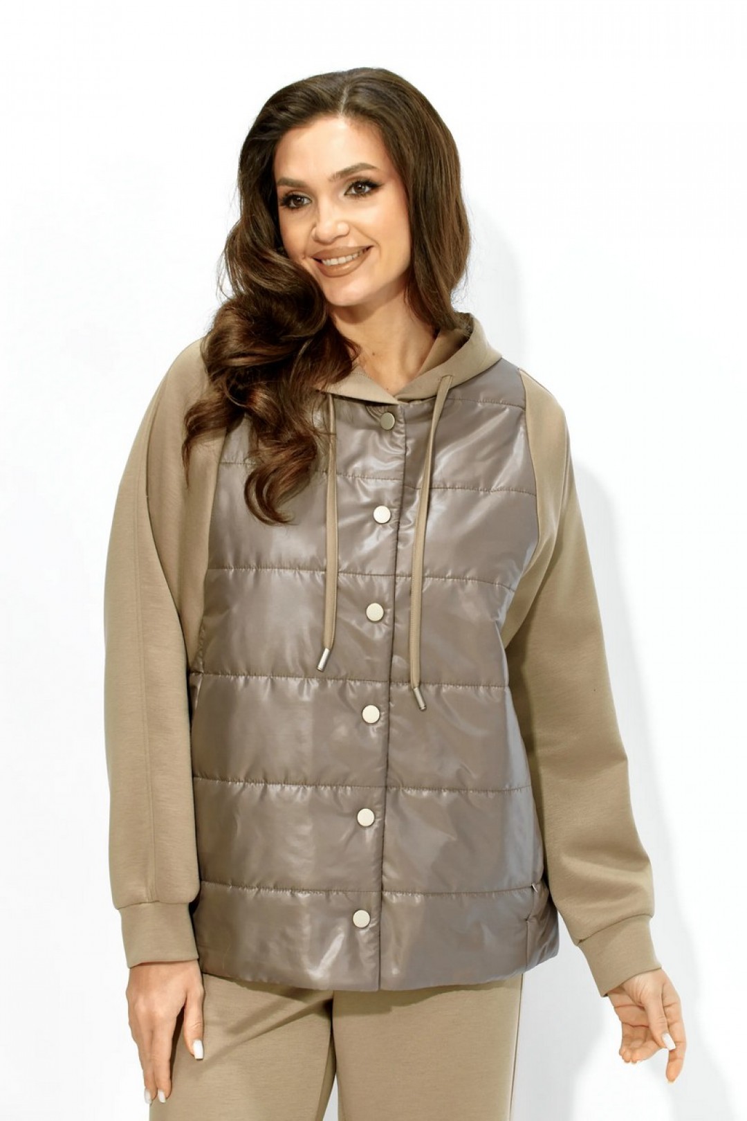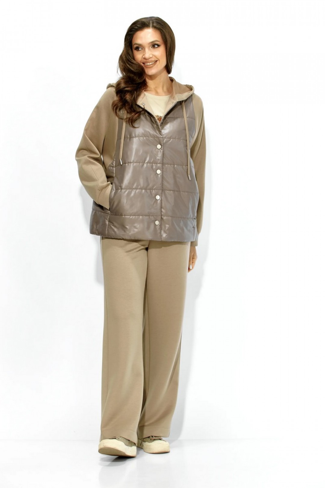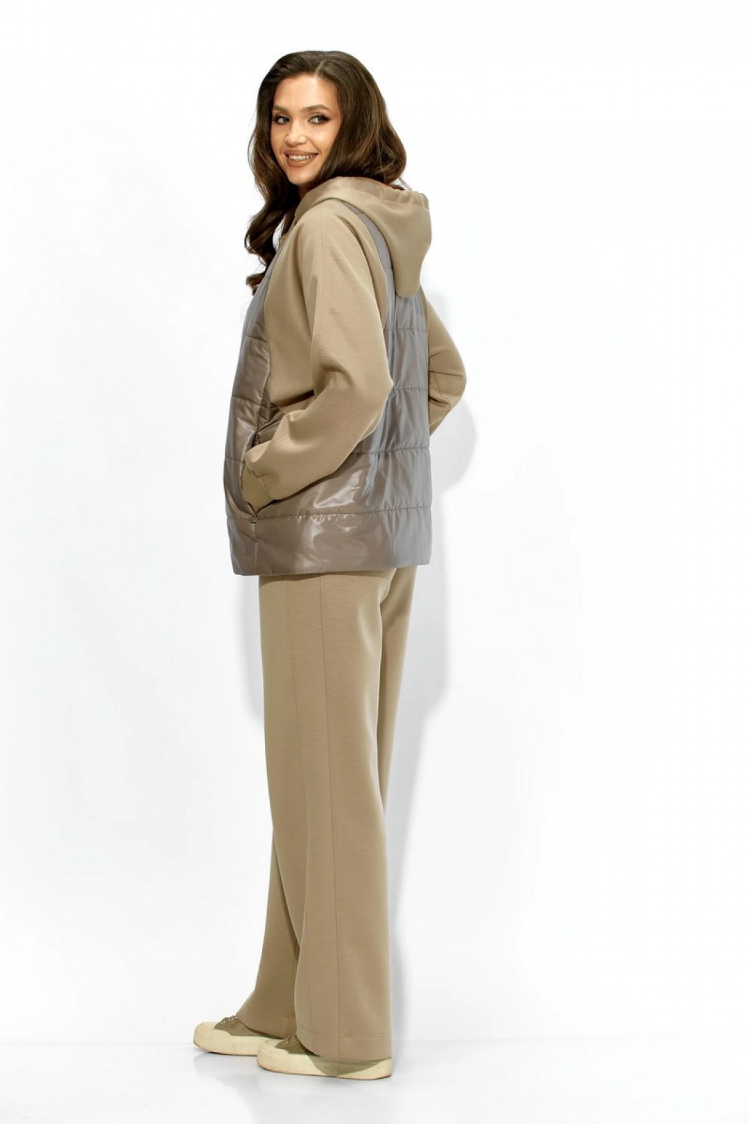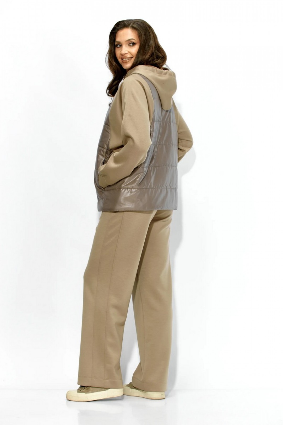 Комплект женский, 2х предметный, состоящий из куртки и брюк. Куртка прямого силуэта. Выполнена на сочетании стеганной плащевки на синтепоне (VS 100) и трикотажного полотна (фенди). Центральная часть переда и спинки из стежки. По переду центральная застежка на кнопки и карманы в рельефах. Горловина оформлена капюшоном с кулисой по краю. Рукав цельнокроеный, с манжетой снизу. Низ куртки по ширине регулируется внутренней кулисой (резинка) с фиксаторами. Стежка на подкладке. Брюки прямые. По боку подрезной лампас с отделочной строчкой и карманы. Пояс притачной, по переду гладкий, дальше с резинкой по кругу