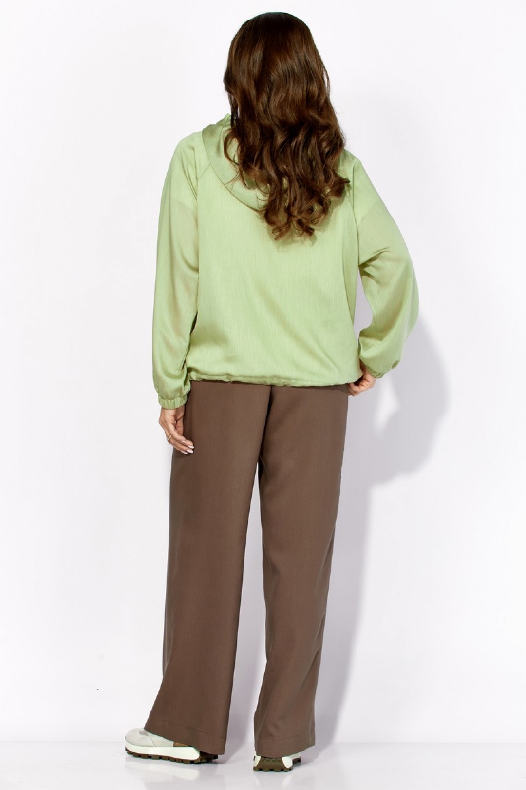 Комплект женский, 3х предметный, состоящий из куртки брюк и топа. Куртка-парка, облегченная, без подкладки, прямого силуэта. Рукав реглан, длинный, по низу на резинке. Горловина оформлена капюшоном с кулисой. По переду карманы в рельефах. Застежка центральная, потайная, на петли и пуговицы. Низ куртки регулируется кулисой с фиксатором по бокам. Спинка без особенностей. Топ из трикотажного хлопкового полотна, прямого силуэта с коротким цельнокройным рукавом. Горловина круглая, с подрезной планкой. Перед задекорирован принтом. Брюки прямые, широкие. По переду наклонные карманы и ягкие складки. Пояс притачной, по центру гладкий, дальше с резиной. В брюках подкладка (шорты)