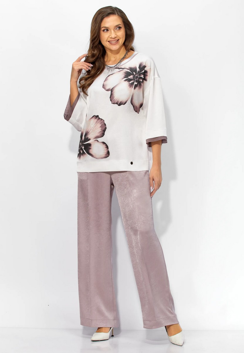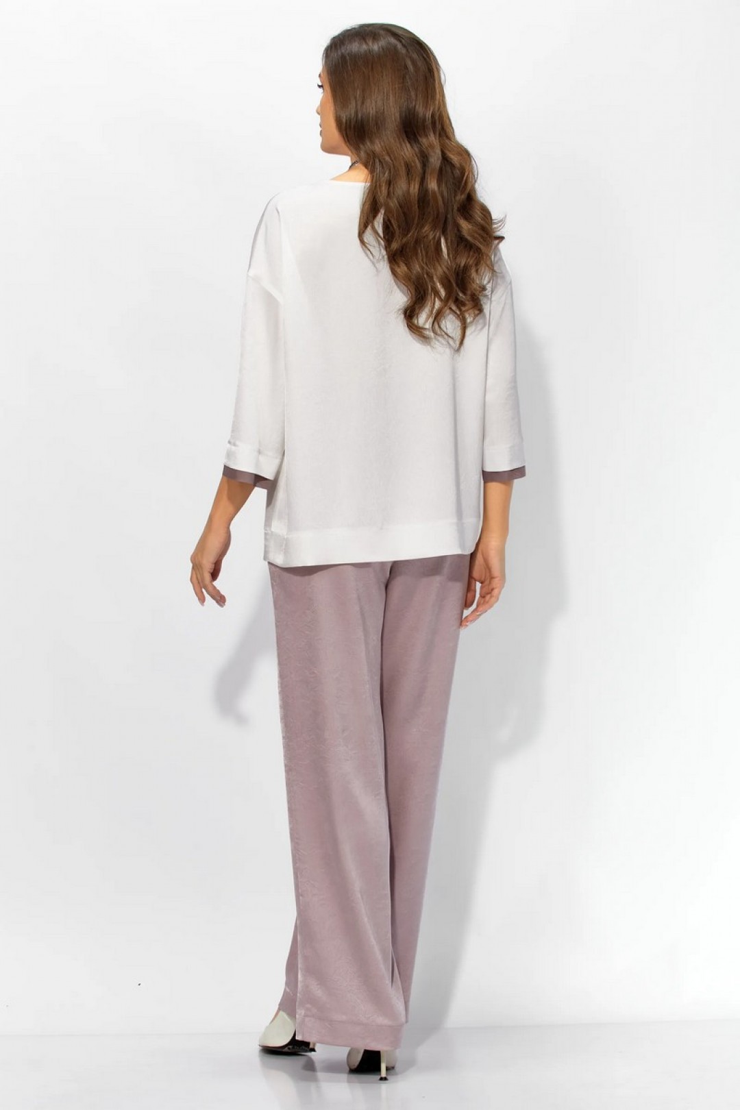 Комплект женский, 2-предметный, состоящий из блузы и брюк. Блуза прямого силуэта с рукавом длинной 3/4. Рукав со спущенной линией плеча. По низу рукава планка, с отлетными деталями из отделочной ткани (вуалька). Горловина круглой формы с отделочной планкой и кантом. Брюки прямые, по переду заутюжены канты (стрелки) и функциональные наклонные карманы. Пояс притачной с резинкой по кругу