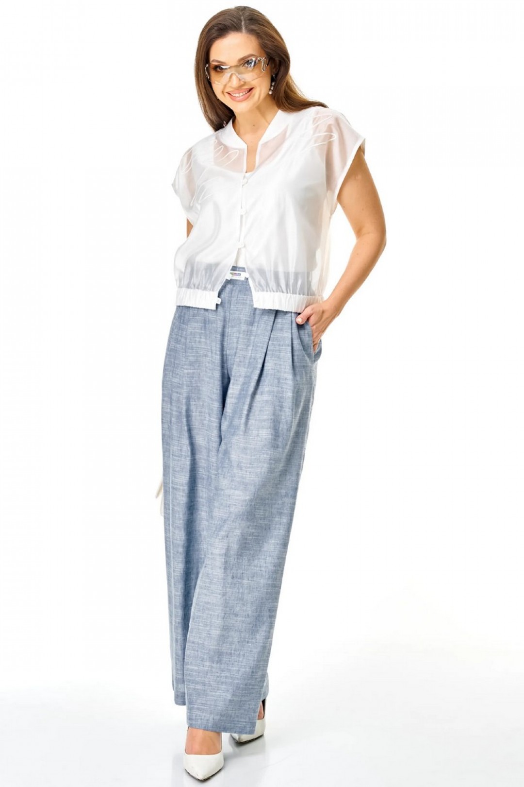 Брюки выполнены из льняной ткани с фактурой. Брюки прямые, расширенные, со складками. Карманы в боковых швах. Пояс на резинке.