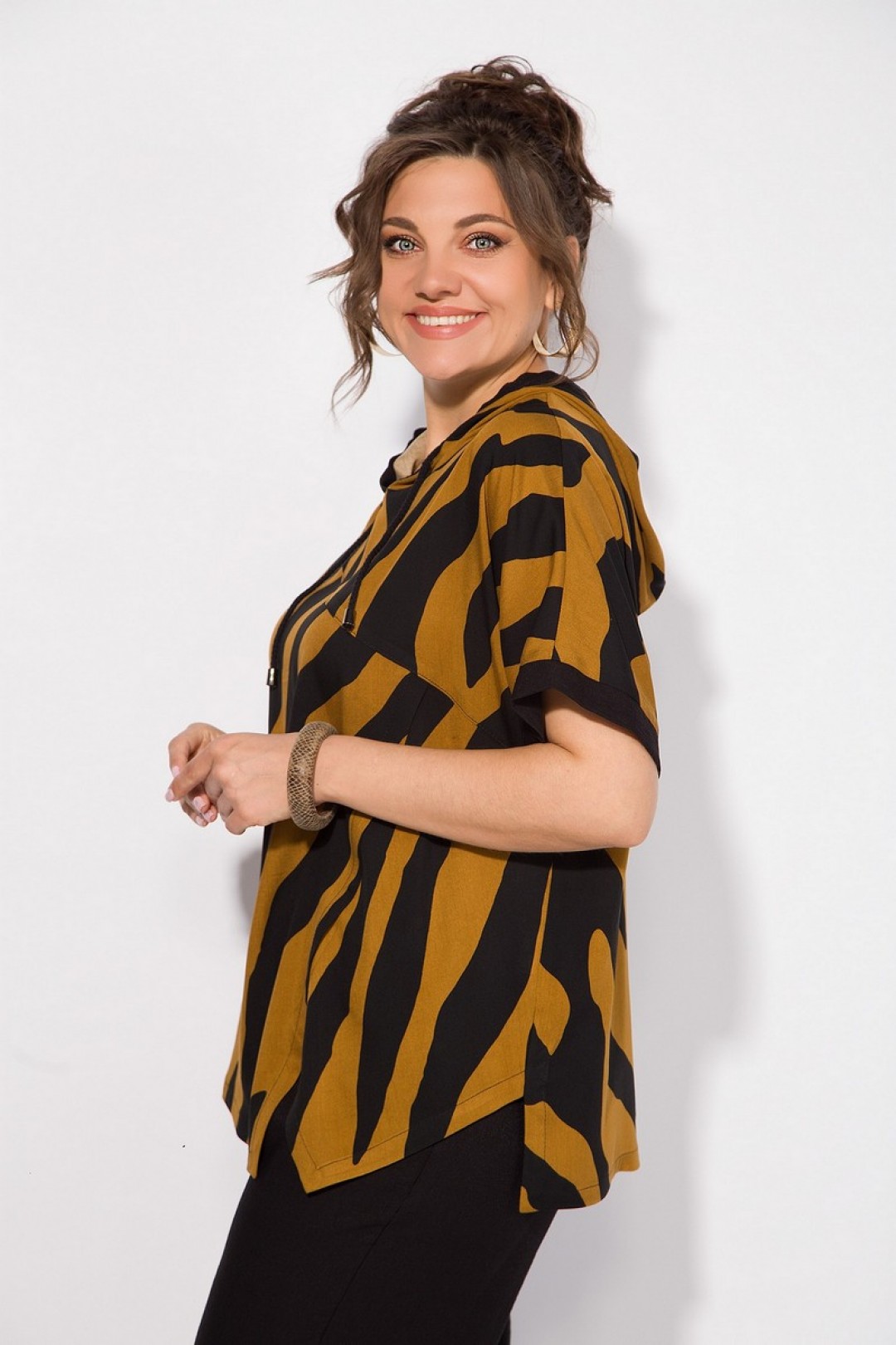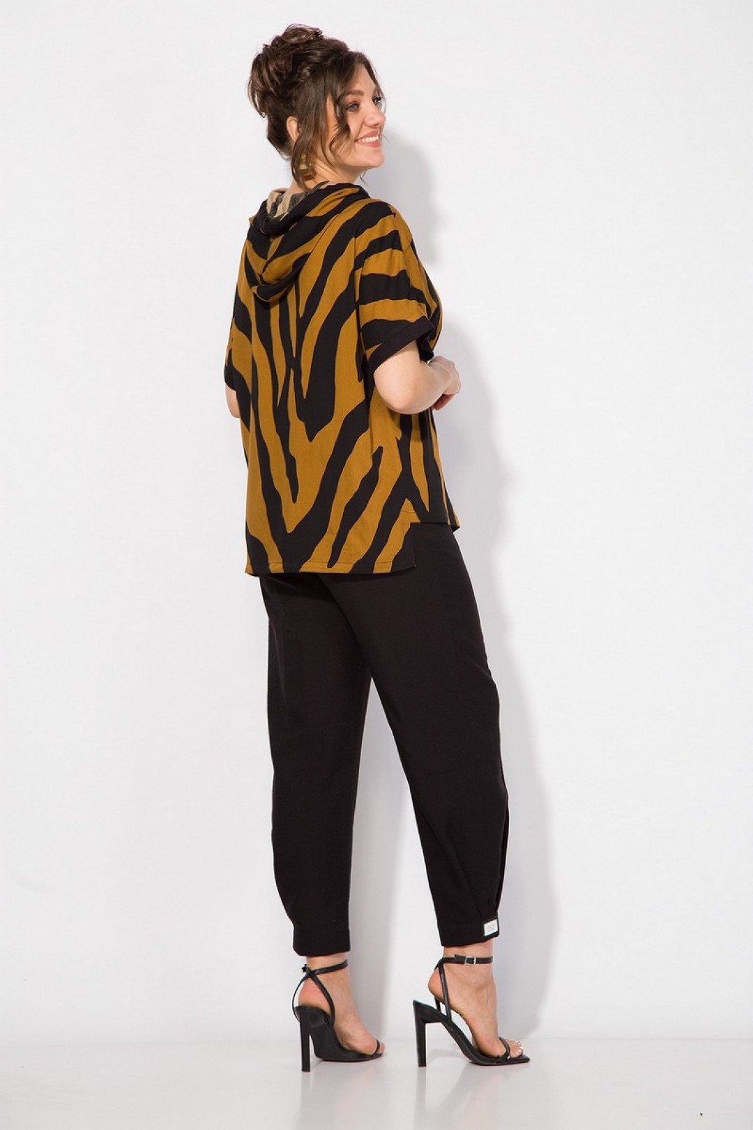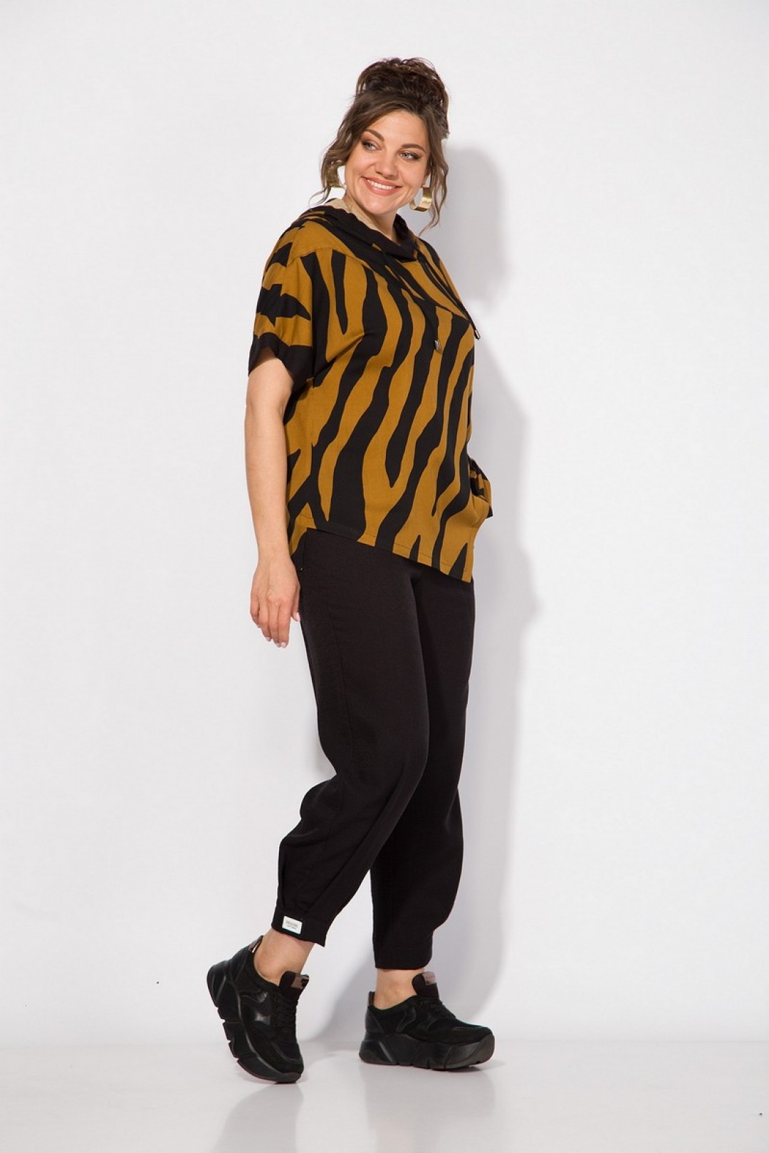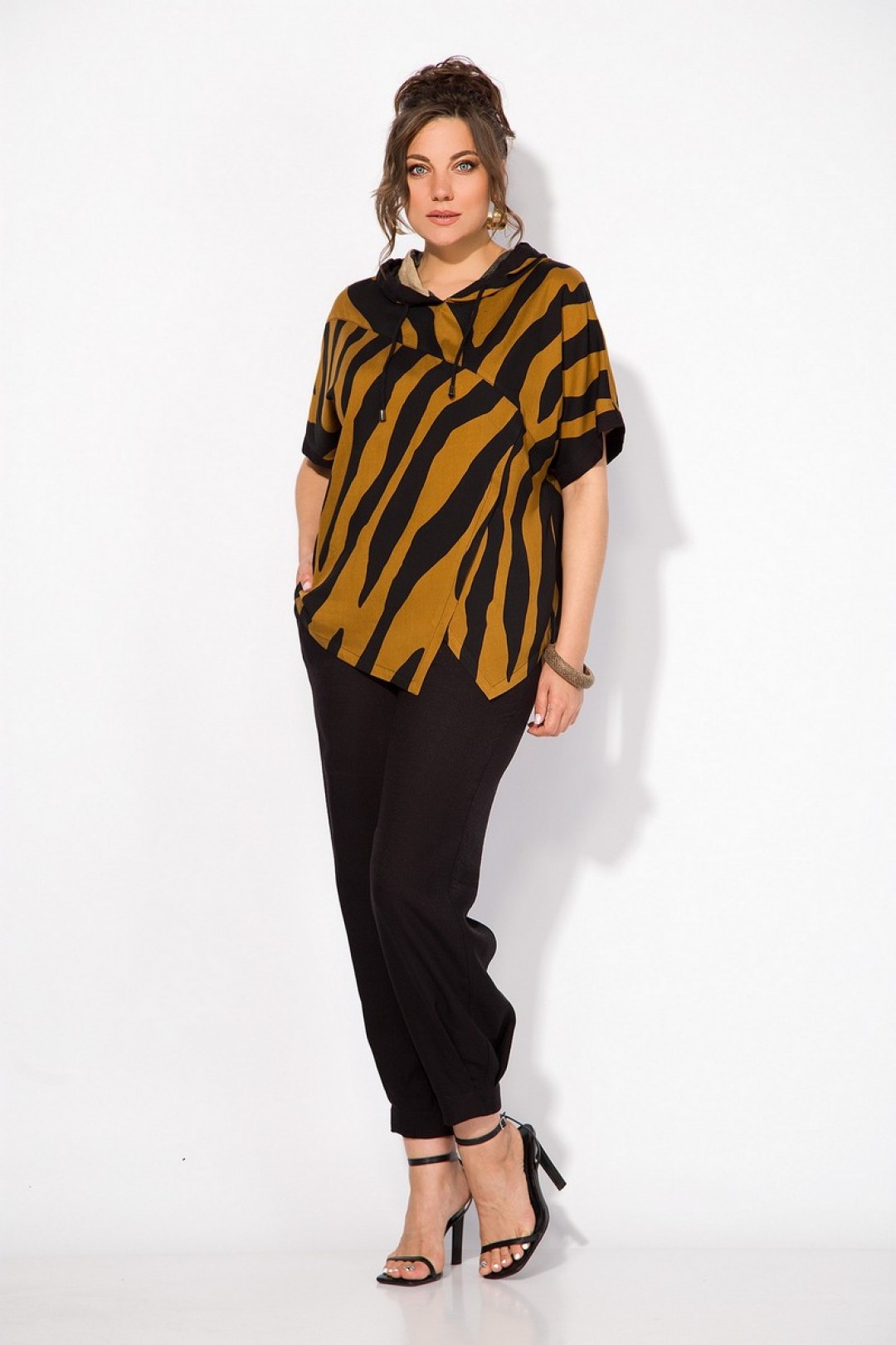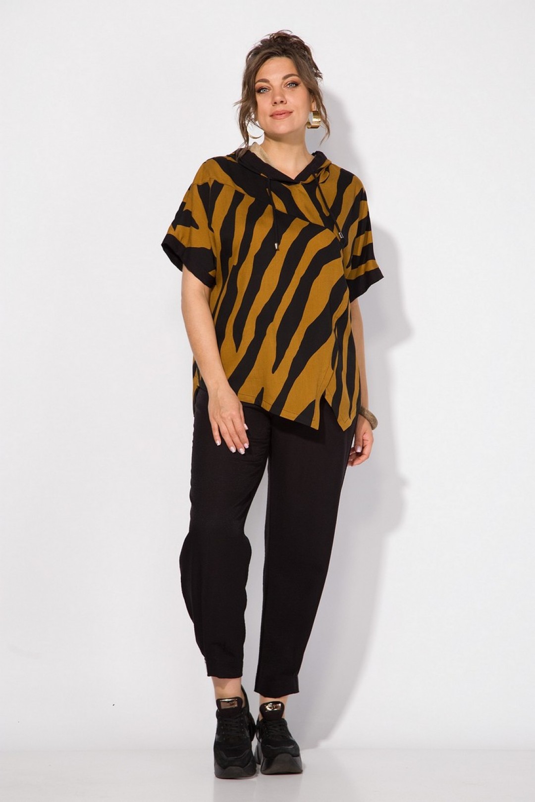 Стильный летний костюм, состоящий из удлиненной туники свободного покроя и брюк. Оригинальная туника из вискозы добавлением льна. Модель с цельнокроеным укороченным рукавом и ассиметричным подрезом по полочке. Модель с легким капюшоном и кулисой на шнуровке. Низ изделия разноуровневый. Спинка цельная. В комплекте свободные брючки, завышенной посадки. Брюки на притачном поясе с круговой резинкой. Имеются боковые карманы. Низ с заложенными складками, что придает изделию более спортивный образ.