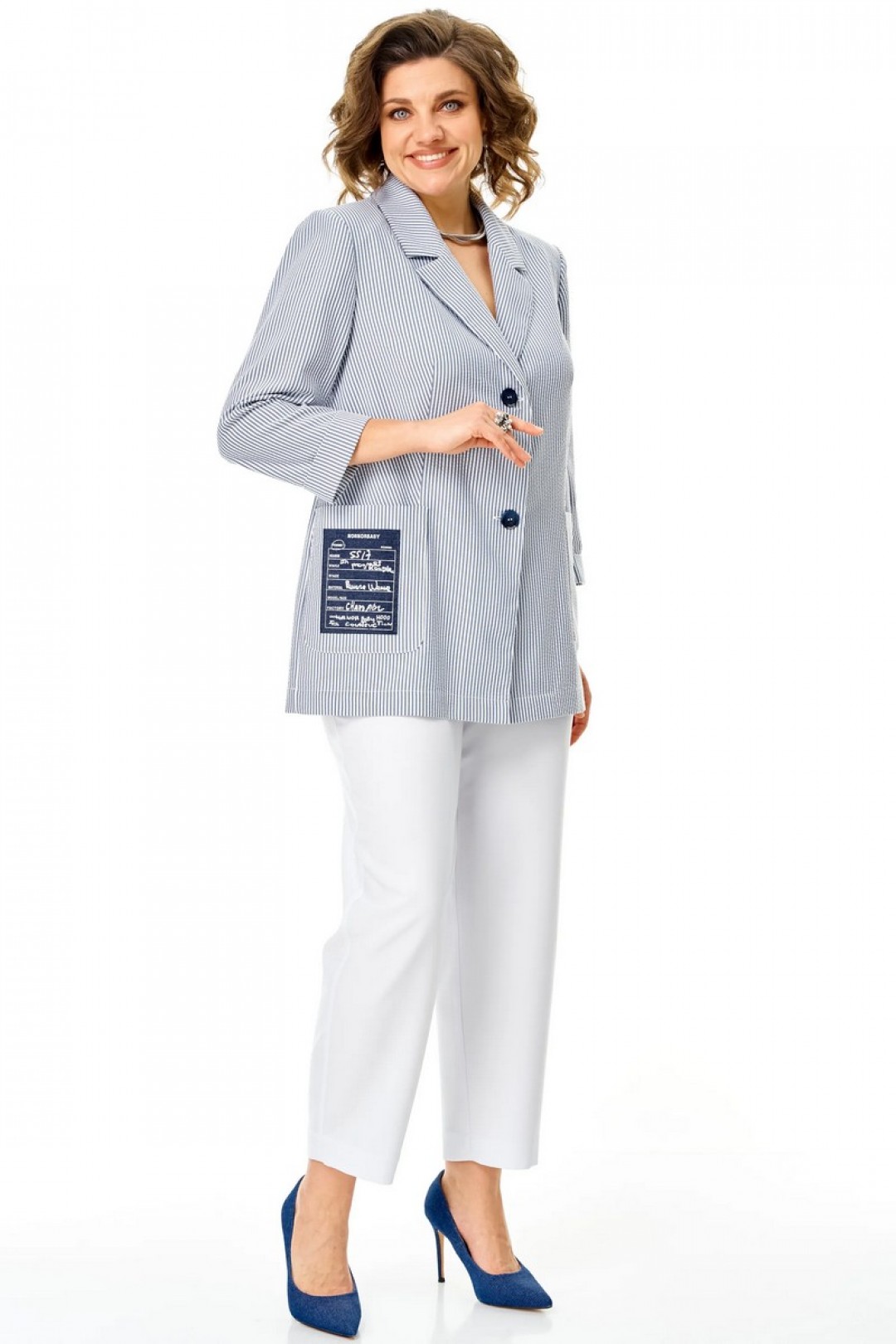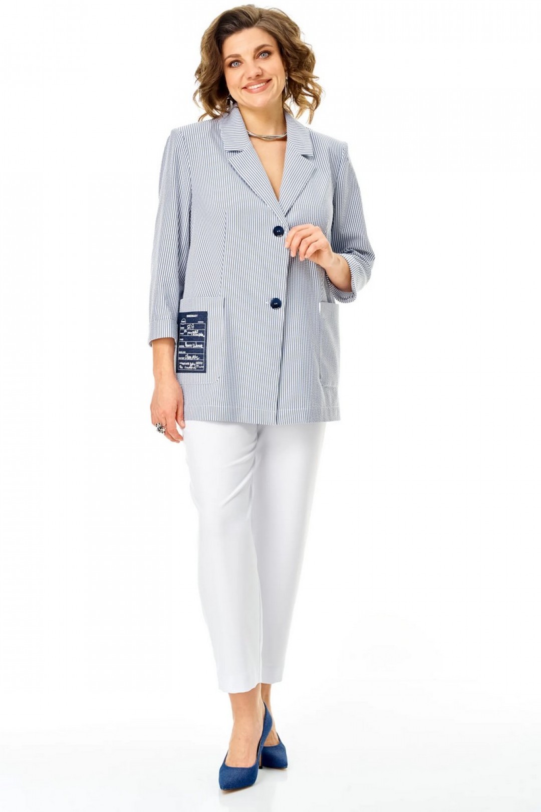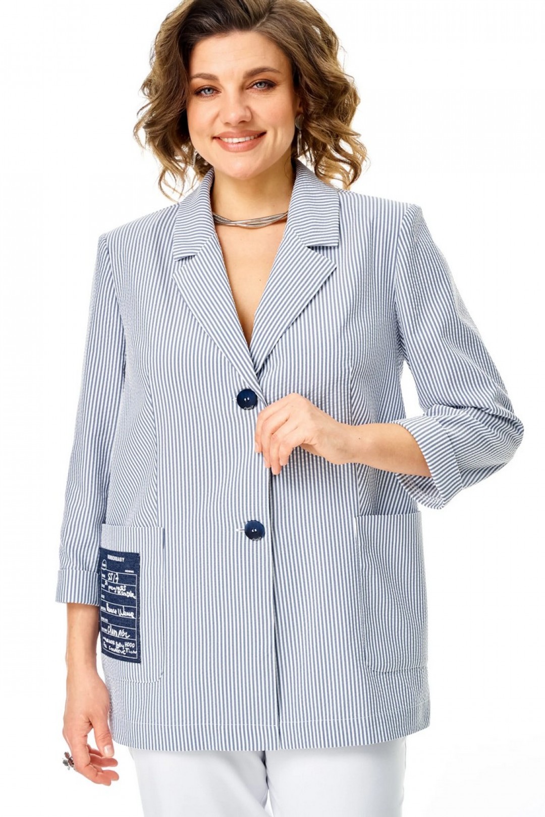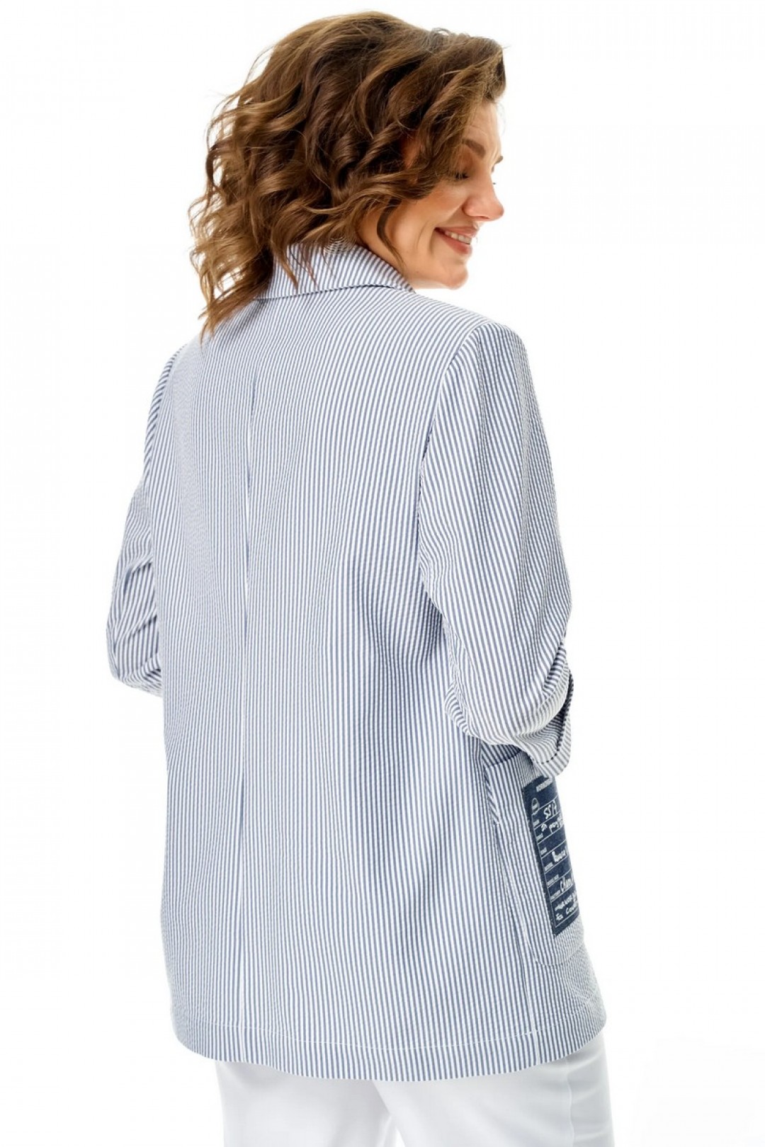 Жакет летний, без подкладки. Выполнен из ткани в тонкую полоску. Силуэт прямой, покрой рукава втачной. Застёжка центральная на 2 петли и пуговицы. Воротник пиджачный. Карманы накладные, правый карман декорирован нашивкой. Рукав длиной 3/4 , низ оформлен отворотом. Спинка прямая со средним швом .