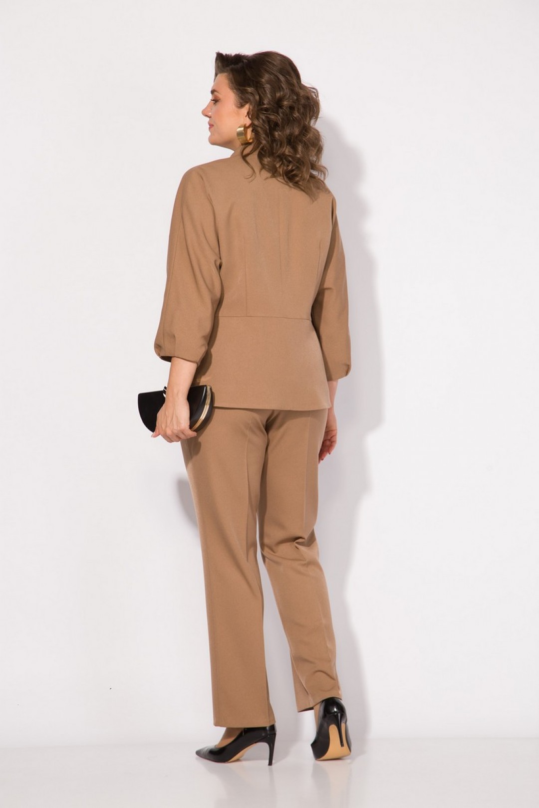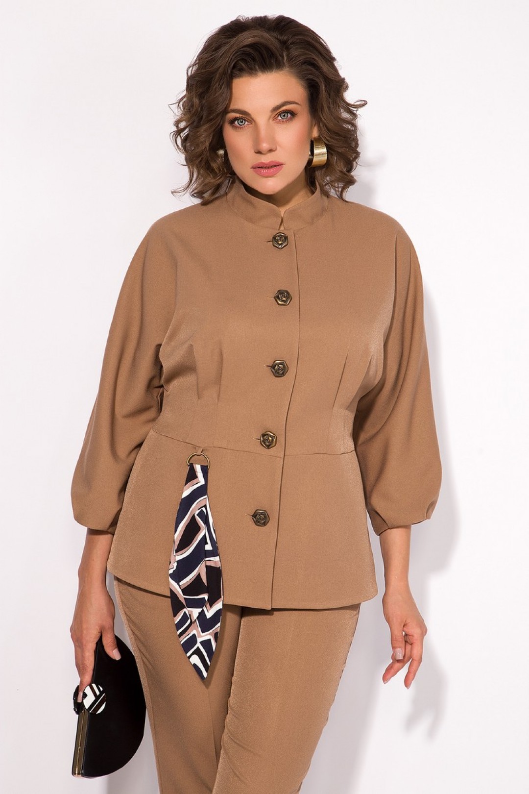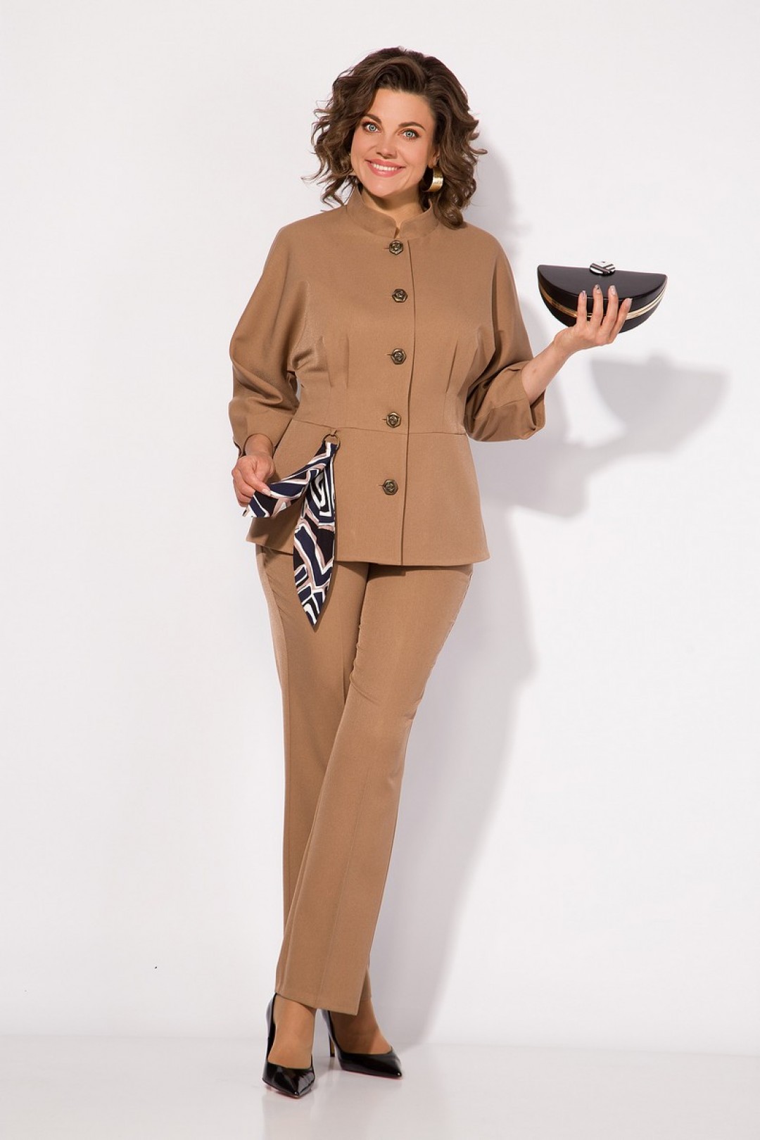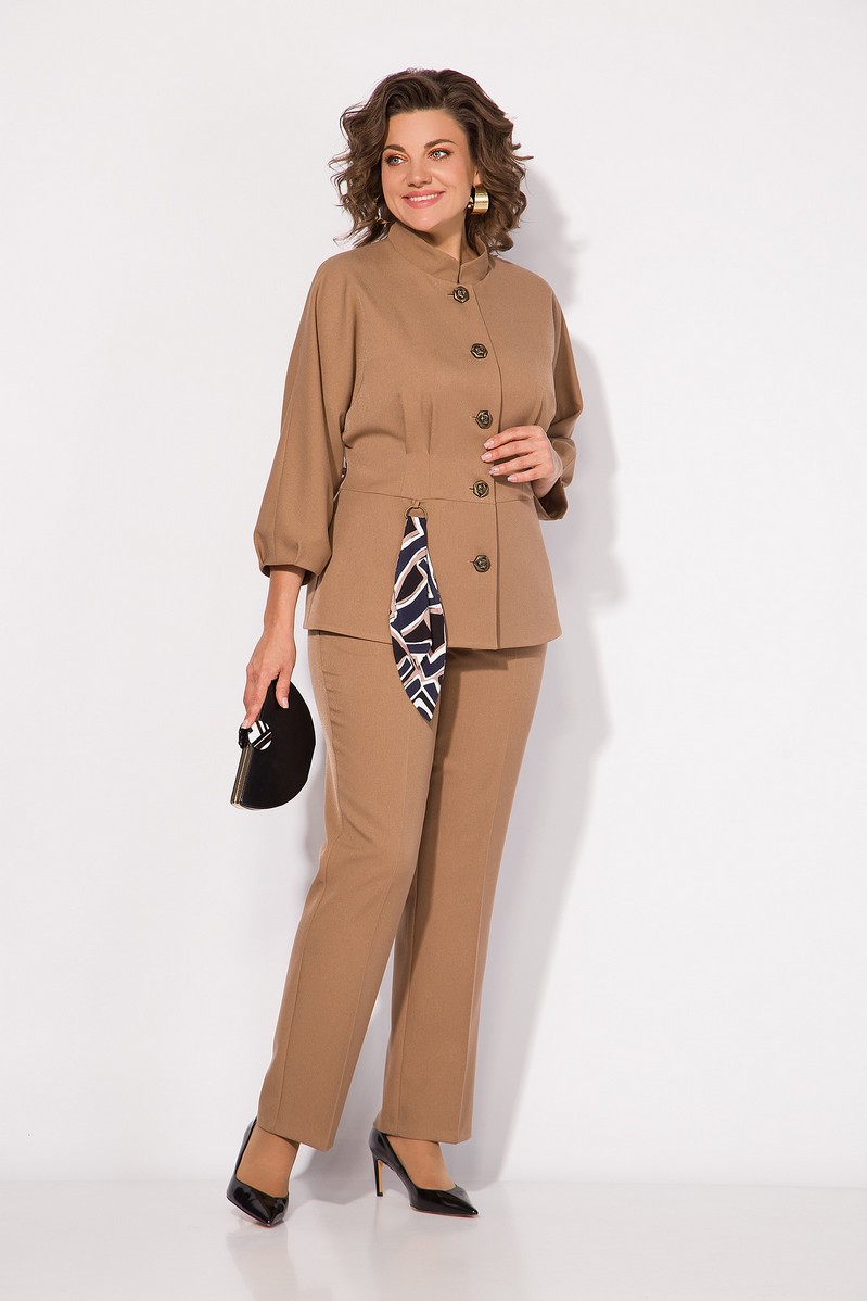 Брючный женский костюм– это воплощение элегантного стиля и комфорта. Комплект состоит из стильного жакета и прямых брюк, и является классическим выбором для любого торжественного или праздничного мероприятия! Жакет полуприталенного силуэта, с цельнокроеным рукавом длиной ¾-тии. Воротник фигурная стойка, переходящая в центральную бортовую застежку на декоративные пуговицы. По талии жакет отрезной, с заложенными выточками. Низ рукава с декоративными защипами создает эффект фонарика. Жакет на шелковой подкладке. Брюки в комплекте классического покроя, с заутюженными стрелками. Пояс притачной, со вставками резинки по бокам. Застежка – брючная тесьма-молния с боковыми карманами и обработанным гульфиком. Данный стильный костюм украшает съемный аксессуар в виде подвески с декоративным шарфиком!