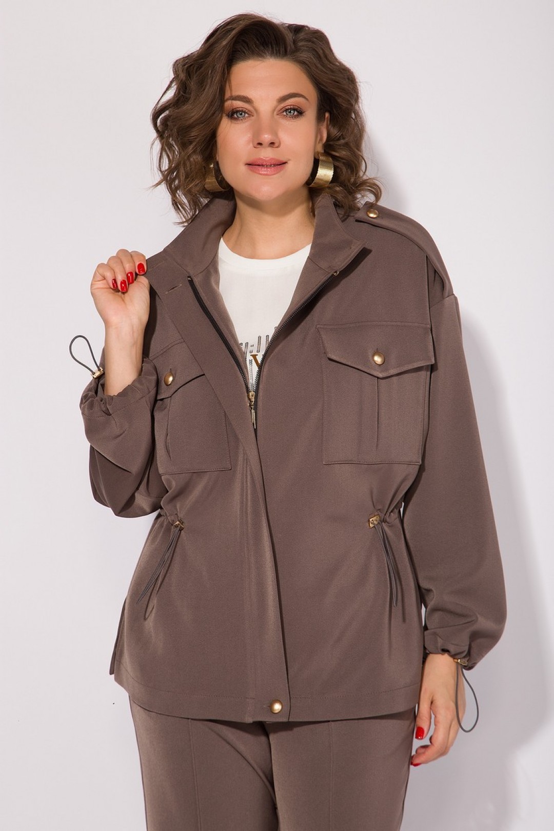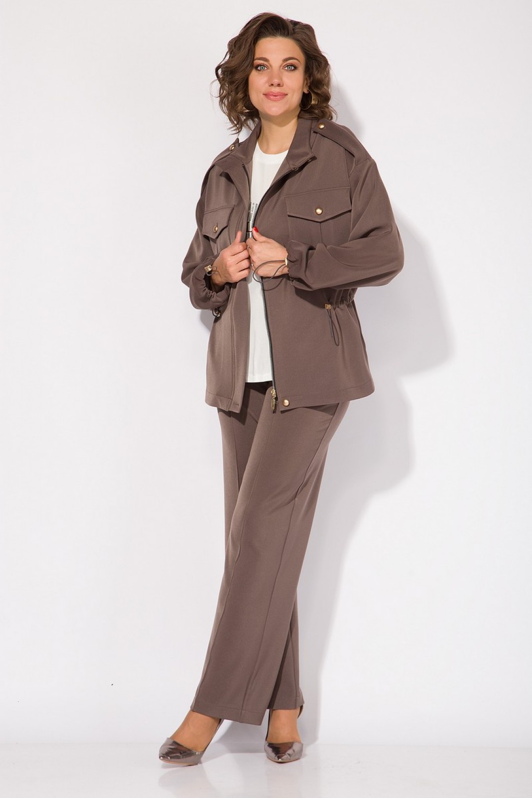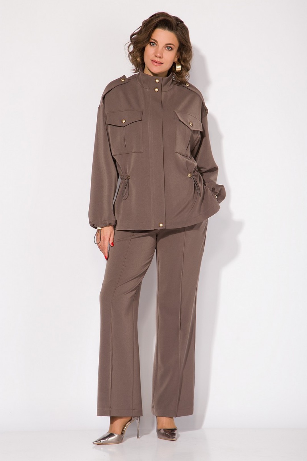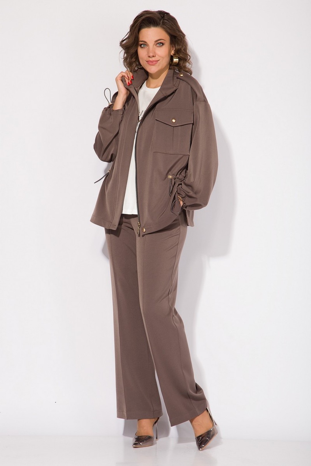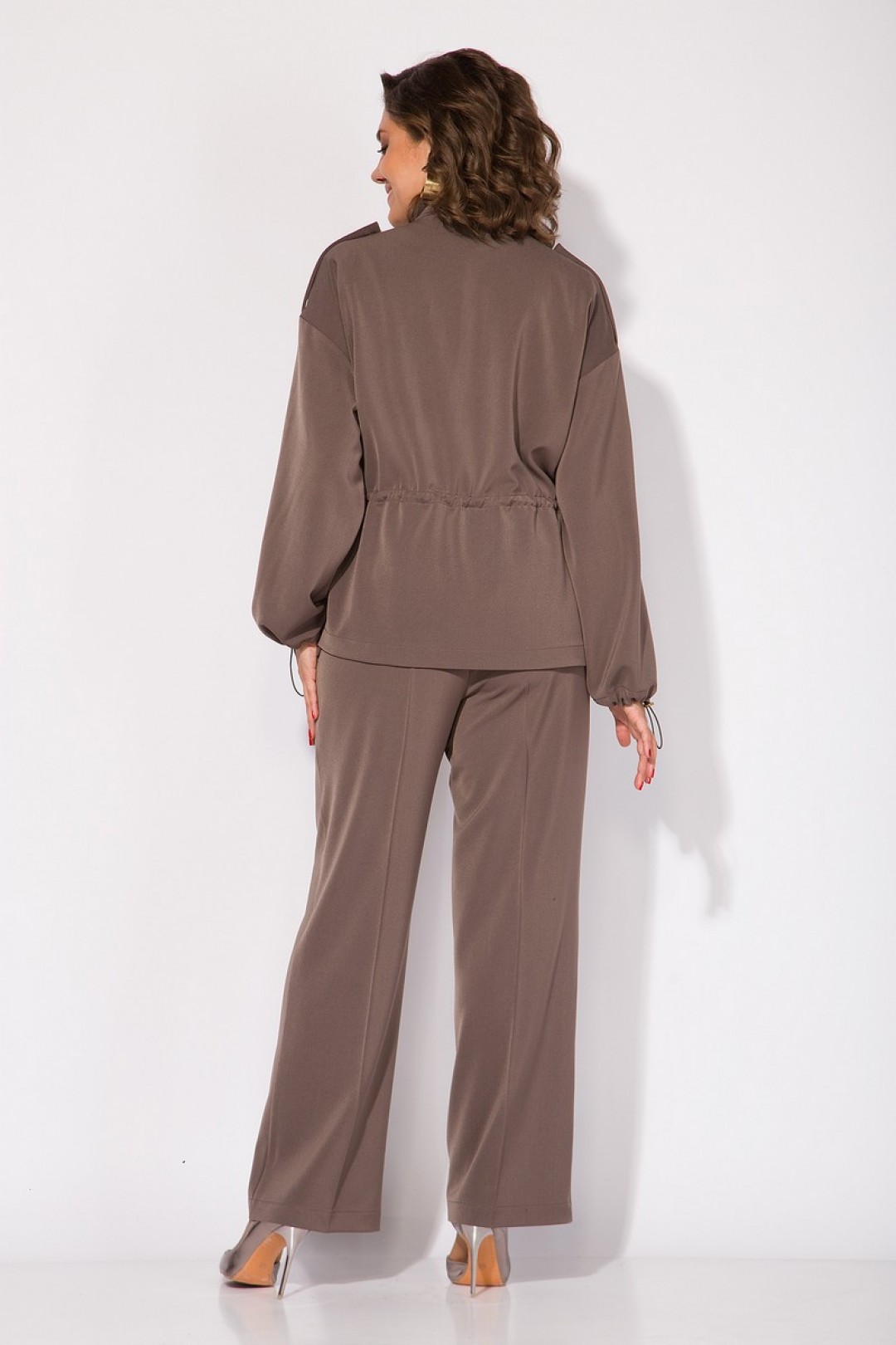 Костюм состоит из жакета и брюк. Жакет полуприталенного силуэта с застежкой на молнию. Воротник стойка. Рукав на спущенной линии плеча полной длины. По талии и низу рукава предусмотрена кулиску с утяжкой. По полочке расположены накладные карманы с клапаном. По бокам предусмотрены разрезы. В комплекте брюки прямого кроя с заутюженными кантами. Брюки на притачном поясе с круговой резинкой по талии. В брюках имеются боковые карманы.
