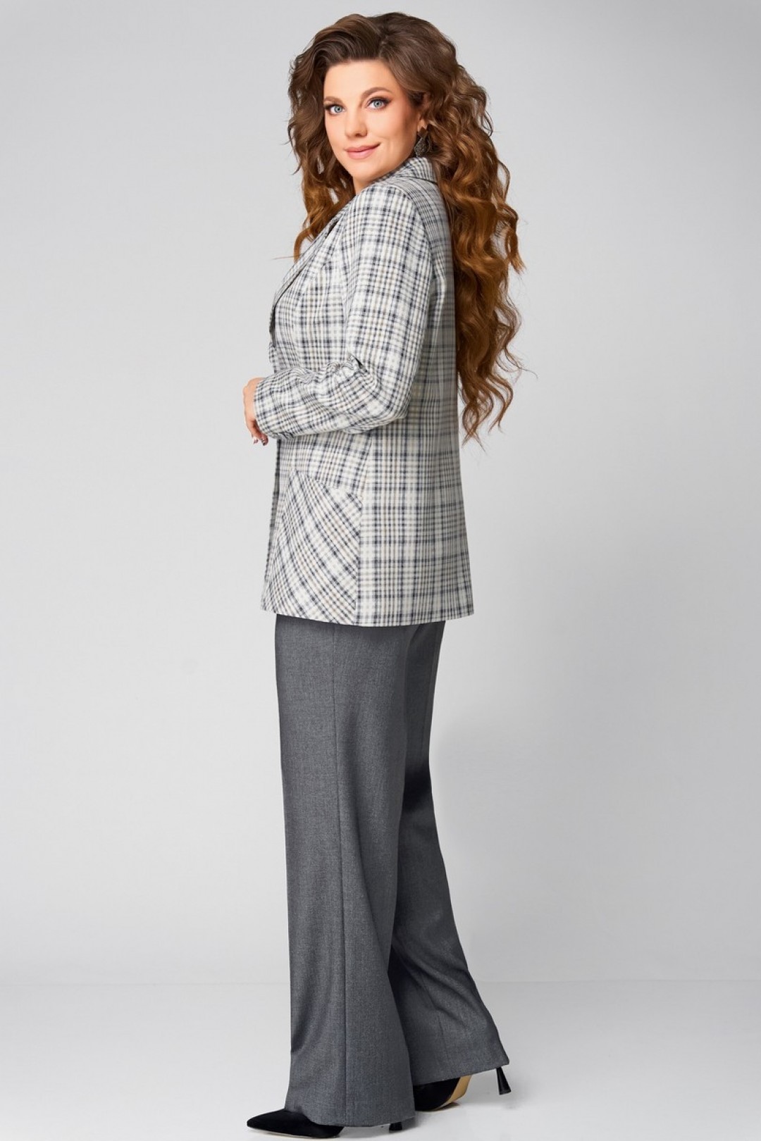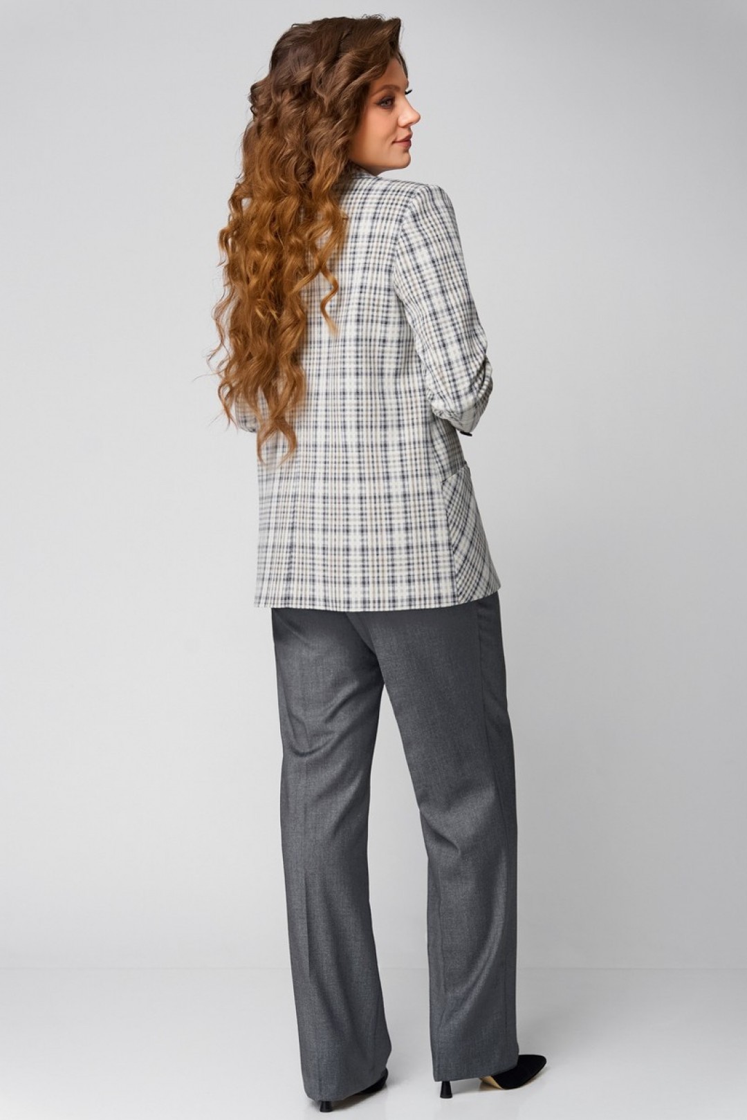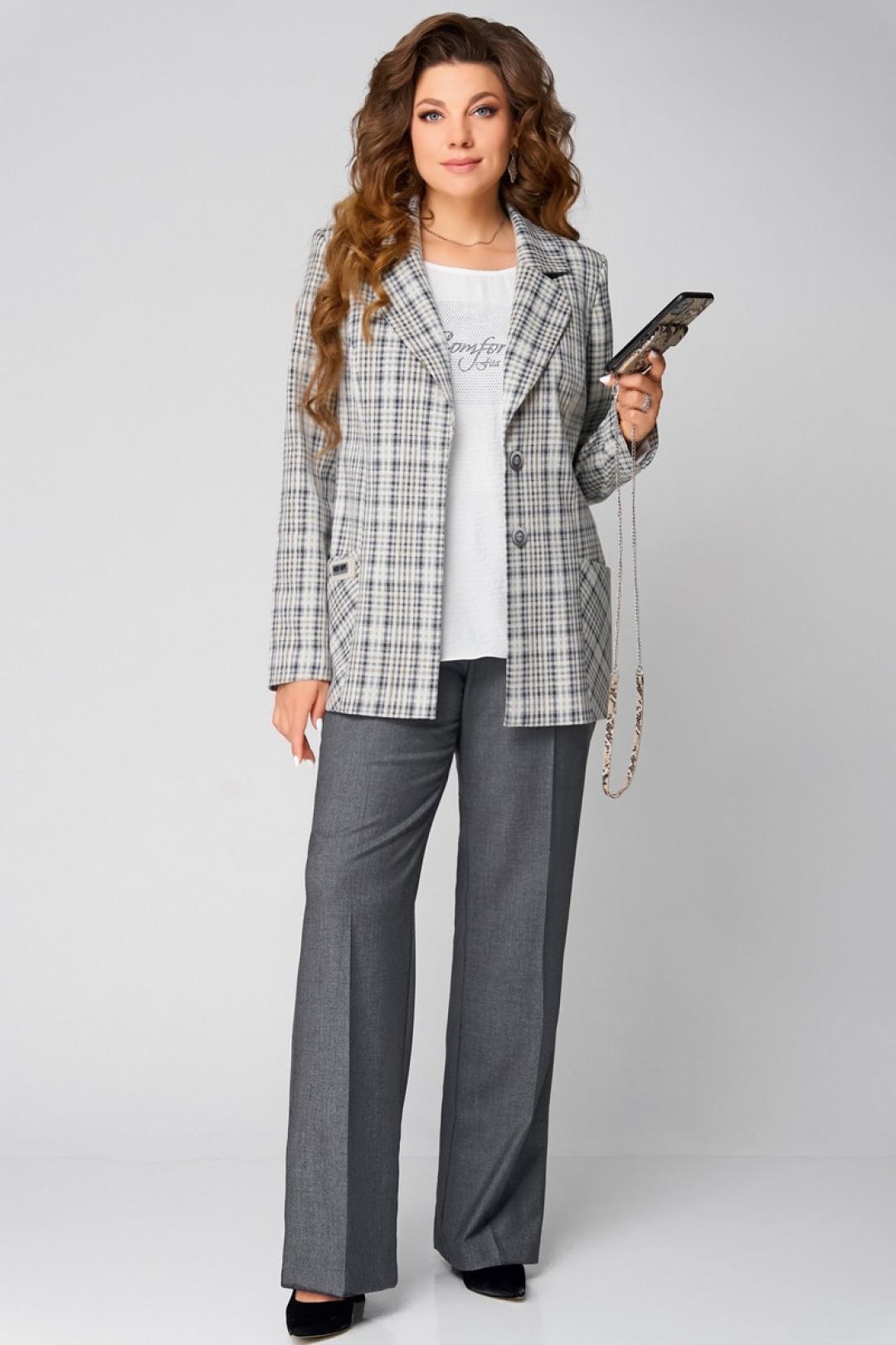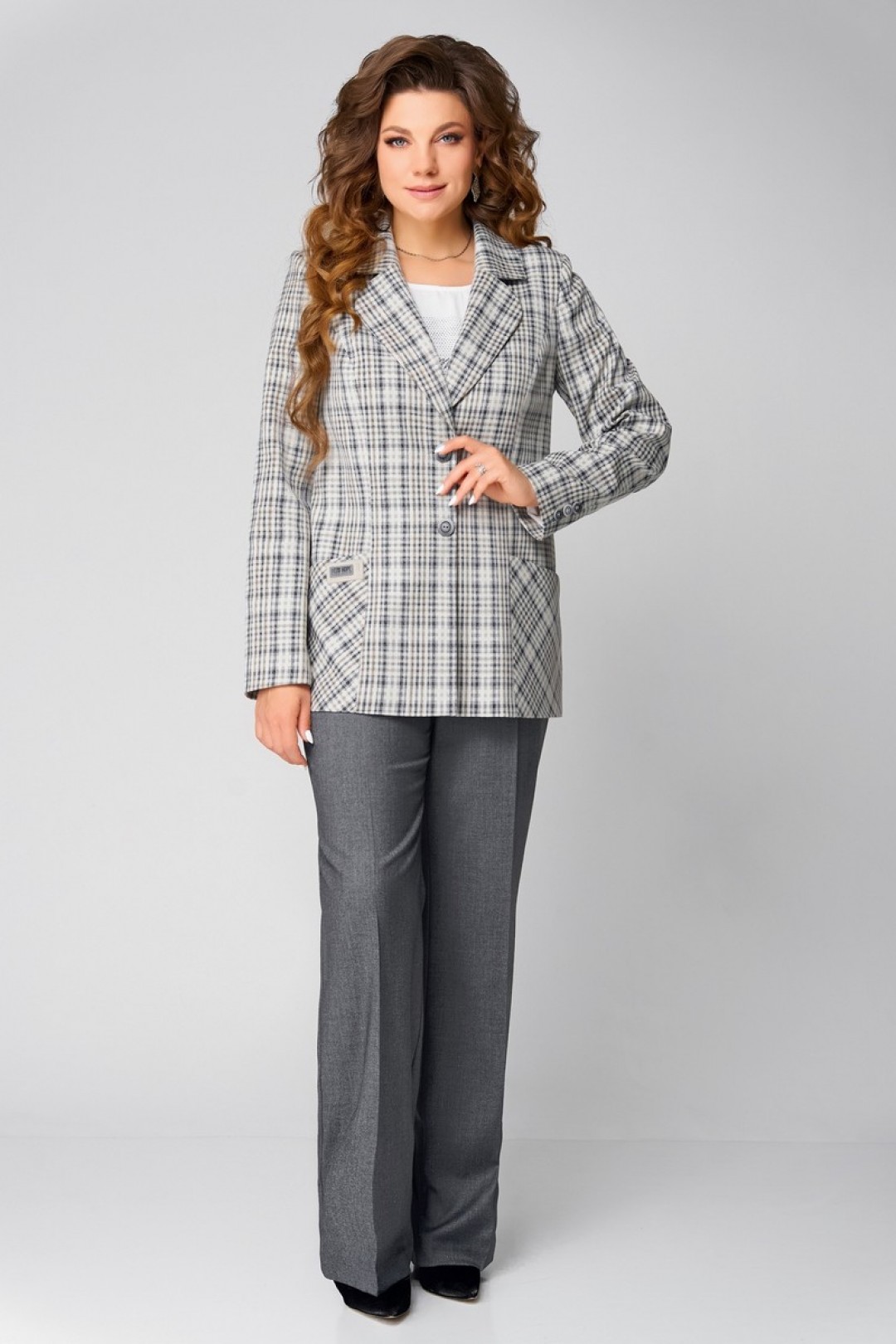 В этом изысканном ансамбле «Каталена» классика встречается с современной утонченностью. Трио из жакета, блузки и брюк выполнено из качественной текстильной ткани, словно создано для женщины, уверенной в себе и стремящейся к гармонии формы и содержания.
