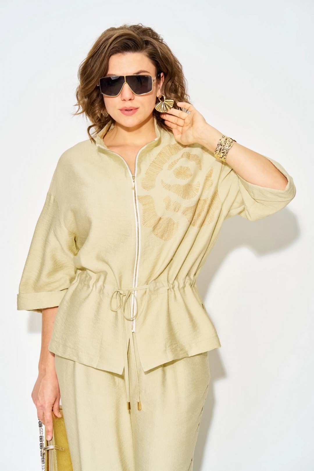 Брючный костюм от бренда «ЛИЛИАНА»- это идеальный выбор для комфортного и стильного образа в весенне-летнее время года. Сшит из вискозного полотна, он приятен к телу и позволяет коже дышать. Модель выполнена в свободном оверсайз покрое, что обеспечивает максимальный комфорт и свободу движений. Блузон со спущенной линией плеча и рукавом длиной 3/4ти с манжетами на отворот. Воротник свободная стойка; застежка центральная на металлическую молнию. По талии расположена кулиска со шнуровкой для более комфортного прилегания. По бокам блузона предусмотрены разрезы. Лиф украшает абстрактная печать-накат с золотым напылением. Брюки в костюме средней посадки, на притачном поясе с круговой резинкой. Модель с боковыми карманами. По низу брюк предусмотрена утяжка, благодаря ей брюки трансформируются в модные «султанки» – ХИТ весенне-летнего сезона!