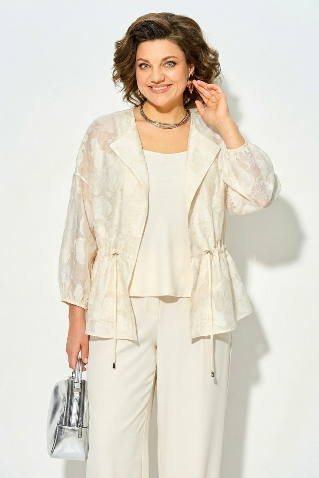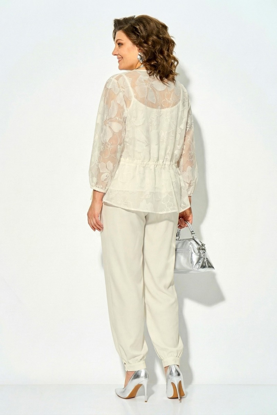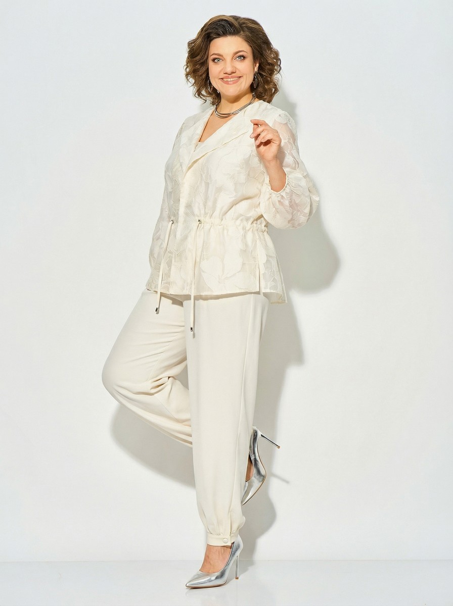 Нарядный брючный костюм - эталон стиля и элегантности. Эффектный костюм включает в себя брюки «султанки», топ на регулируемых бретелях и свободную блузон-накидку из батиста с хлопковой вышивкой. Блузон свободного силуэта, с цельнокроеным рукавом длиной ¾-ти на резинке по низу. Модель с подбортом и регулируемой кулисой по талии. Топ скроен по-косой, слегка расклешен к низу, что обеспечивает посадку по фигуре. Брюки в костюме с завышенной посадкой, на круговом поясе с резинкой. В боковых швах предусмотрены разрезы. Низ брюк оформлен манжет со сборкой на пуговицу. Брючная тройка не останется вас без внимания на торжественных мероприятиях, а свободный крой обеспечит идеальную посадку благодаря большому размерному ряду в соответствии с молодежным трендом!