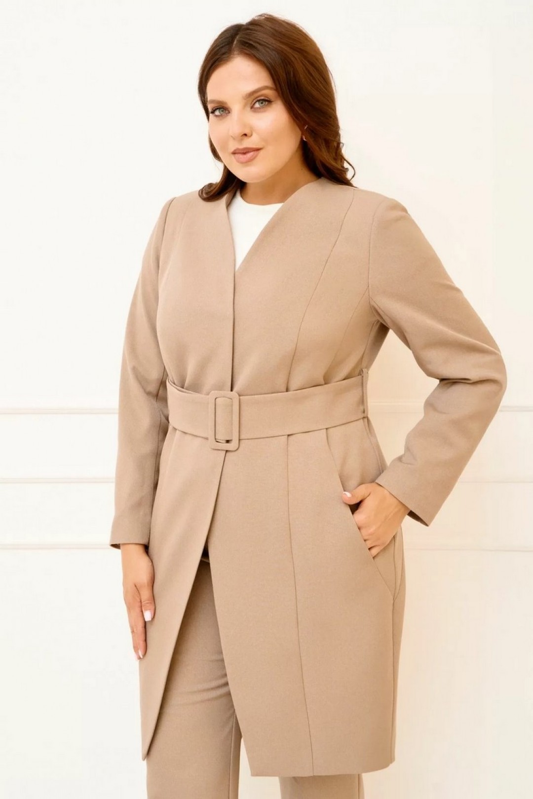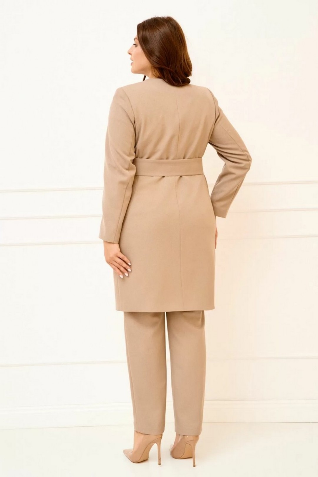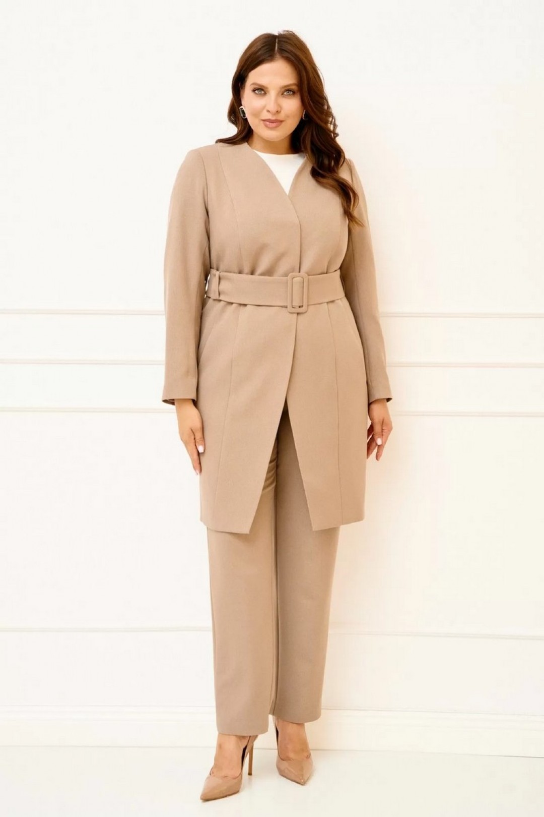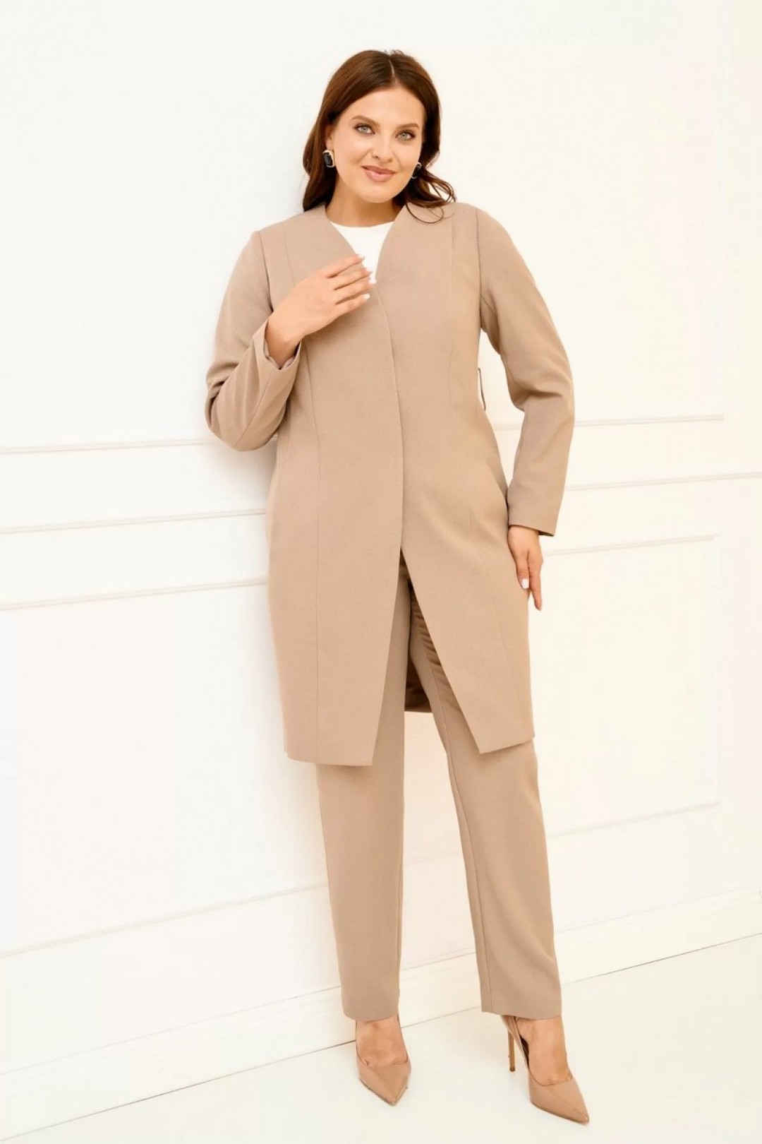 Костюм женский двойка, состоящий из удлиненного жакета и брюк, выполнен из плотной костюмной ткани. Жакет на подкладке полуприлегающего силуэта до линии колена; рукава втачные; горловина V- образной формы; по переду рельефы и функциональные прорезные карманы; застежка на потайные пришивные кнопки. Зауженные к низу брюки полуприлегающего силуэта застегиваются на молнию, петлю и пуговицу; пояс притачной с резинками в боковых швах для лучшего прилегания; на передних половинках функциональные карманы. В комплекте съемный пояс из основной ткани. Костюм полностью соответсвует заявленному размеру. Пользуйтесь таблицей замеров готового изделия. Уход за натуральными тканями: - рекомендована бережная стирка при температуре не выше 30 градусов;