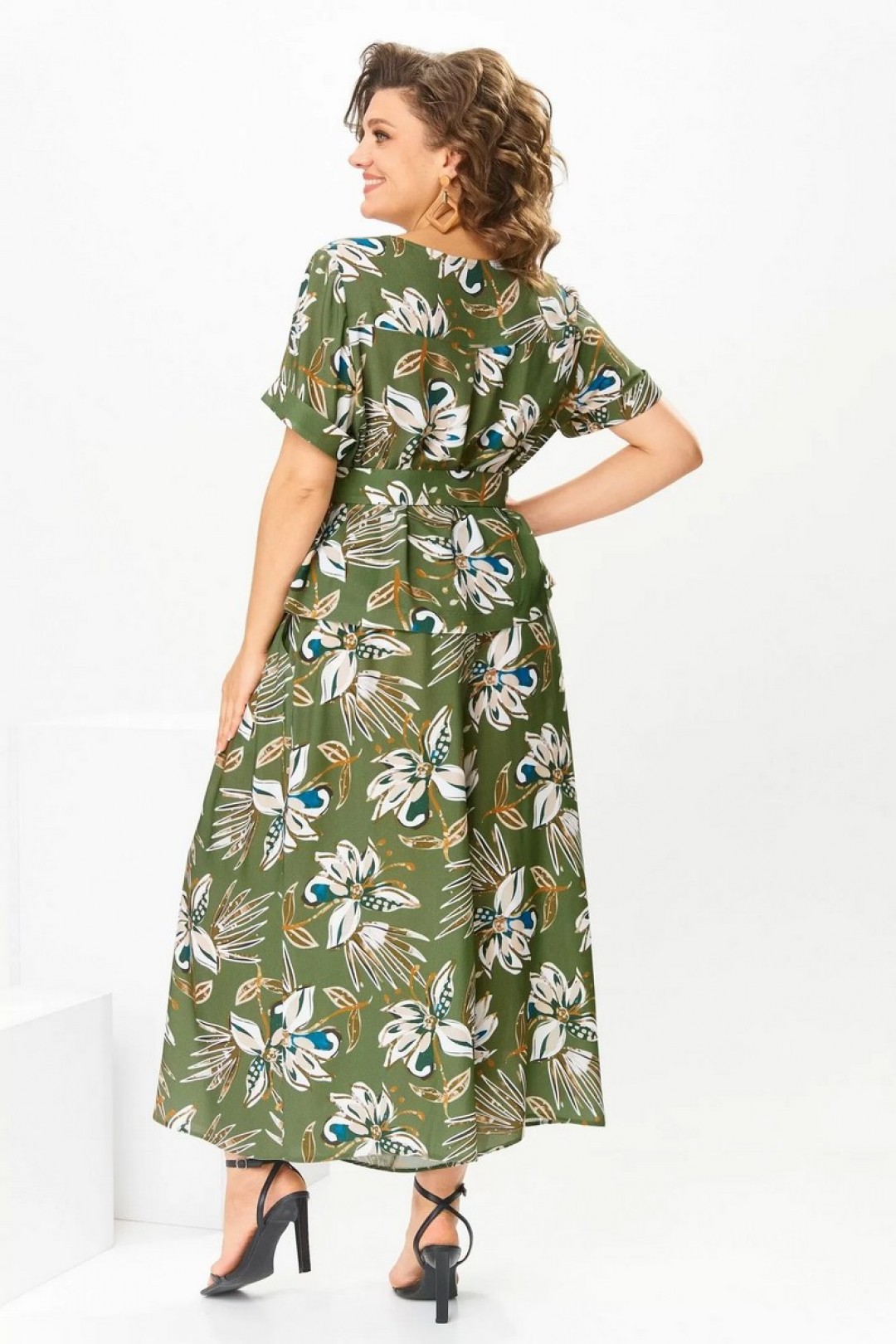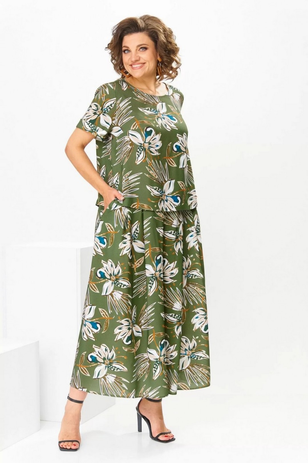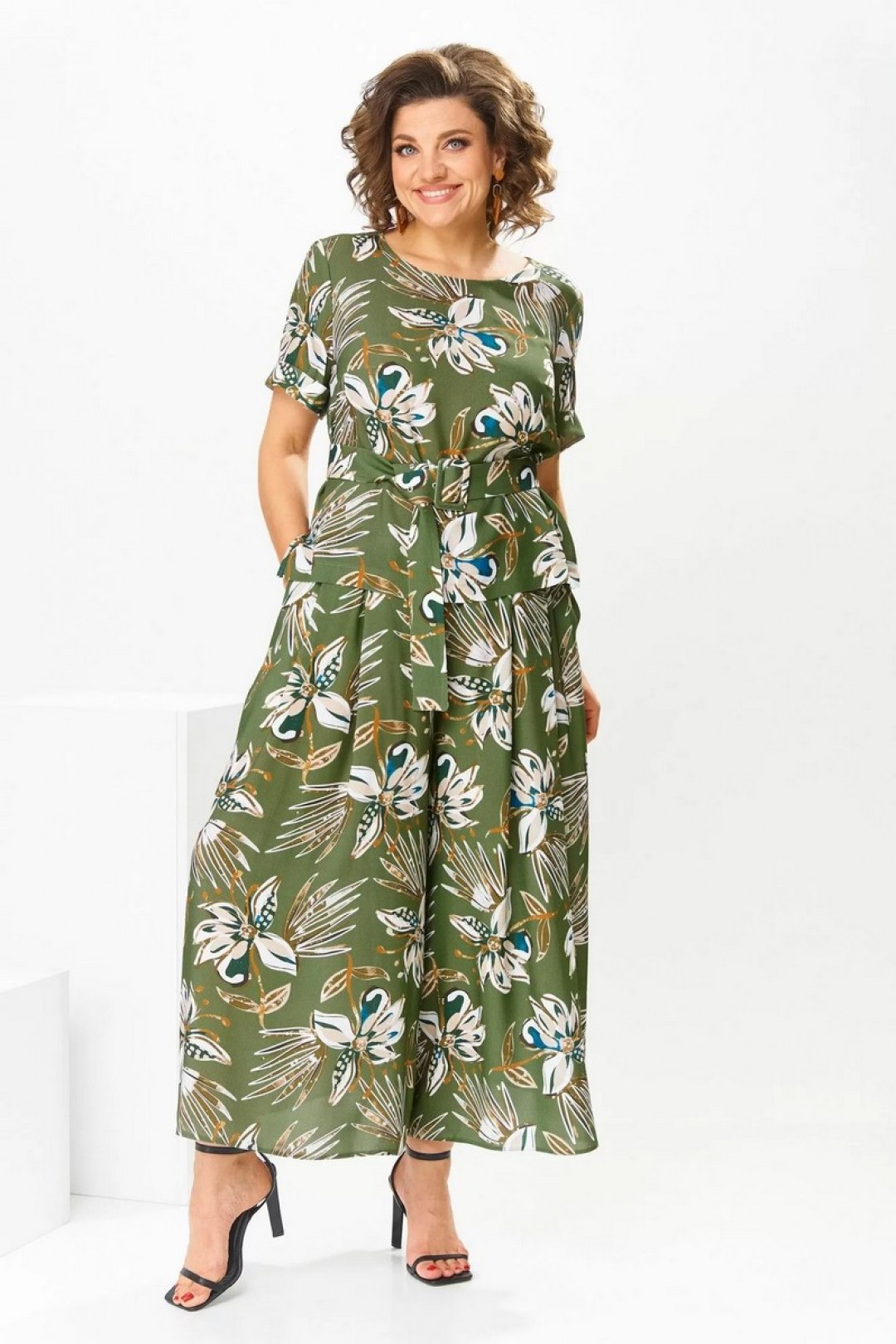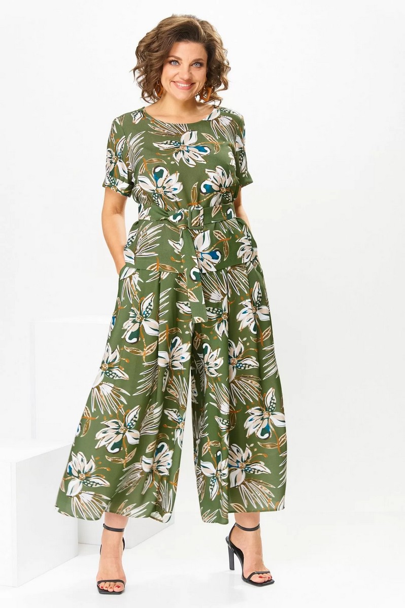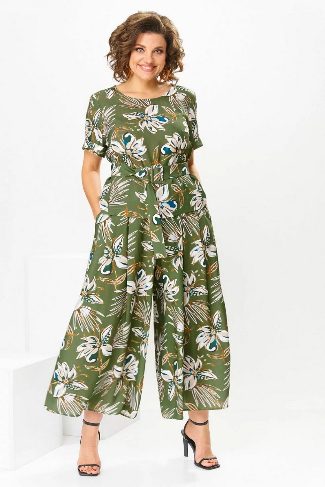 Костюм женский предназначен для повседневной носки. Костюм женский 2-х предметный блузка и юбка-брюки. Блузка женская прямого силуэта, длиной до линии бёдер. Перед с 2-мя нагрудными вытачками. Спинка с отрезной кокеткой, с 1-ной встречной складкой, кокетка декорирована пришивной металлической пластиной. Боковые швы с разрезами. Горловина круглая, обточная, без воротника. Рукав втачной одно шовный, короткий, с приточной отложной манжетой. Блузка без плечевых накладок. Юбка-брюки длинные широкие. Передние половинки с карманами в боковых швах с 2-мя односторонними зафиксированными складками на каждой половинке. Задние без конструктивных особенностей. Пояс притачной, собран на эластичную тесьму, закреплённую 2-мя отделочными строчками.