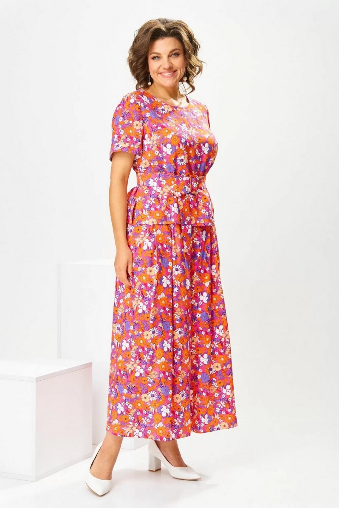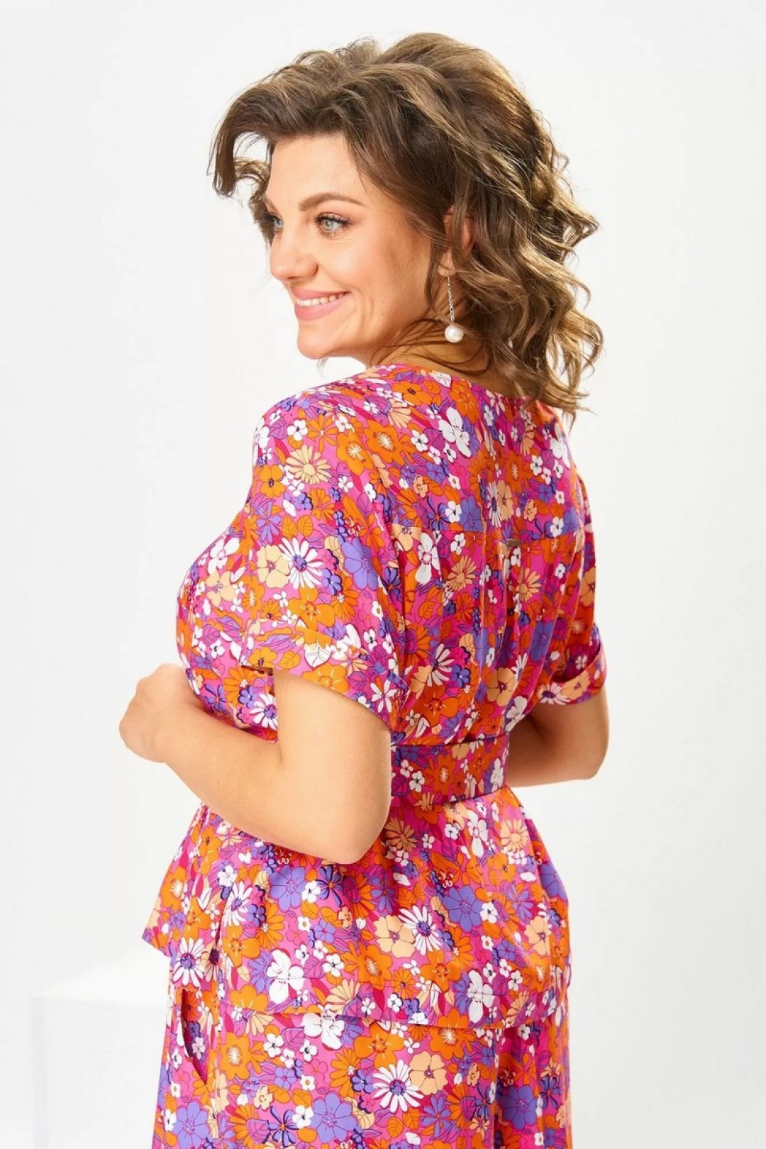 Костюм женский предназначен для повседневной носки. Костюм женский 2-х предметный блузка и юбка-брюки. Блузка женская прямого силуэта, длиной до линии бёдер. Перед с 2-мя нагрудными вытачками. Спинка с отрезной кокеткой, с 1-ной встречной складкой, кокетка декорирована пришивной металлической пластиной. Боковые швы с разрезами. Горловина круглая, обточная, без воротника. Рукав втачной одно шовный, короткий, с приточной отложной манжетой. Блузка без плечевых накладок. Юбка-брюки длинные широкие. Передние половинки с карманами в боковых швах с 2-мя односторонними зафиксированными складками на каждой половинке. Задние без конструктивных особенностей. Пояс притачной, собран на эластичную тесьму, закреплённую 2-мя отделочными строчками.