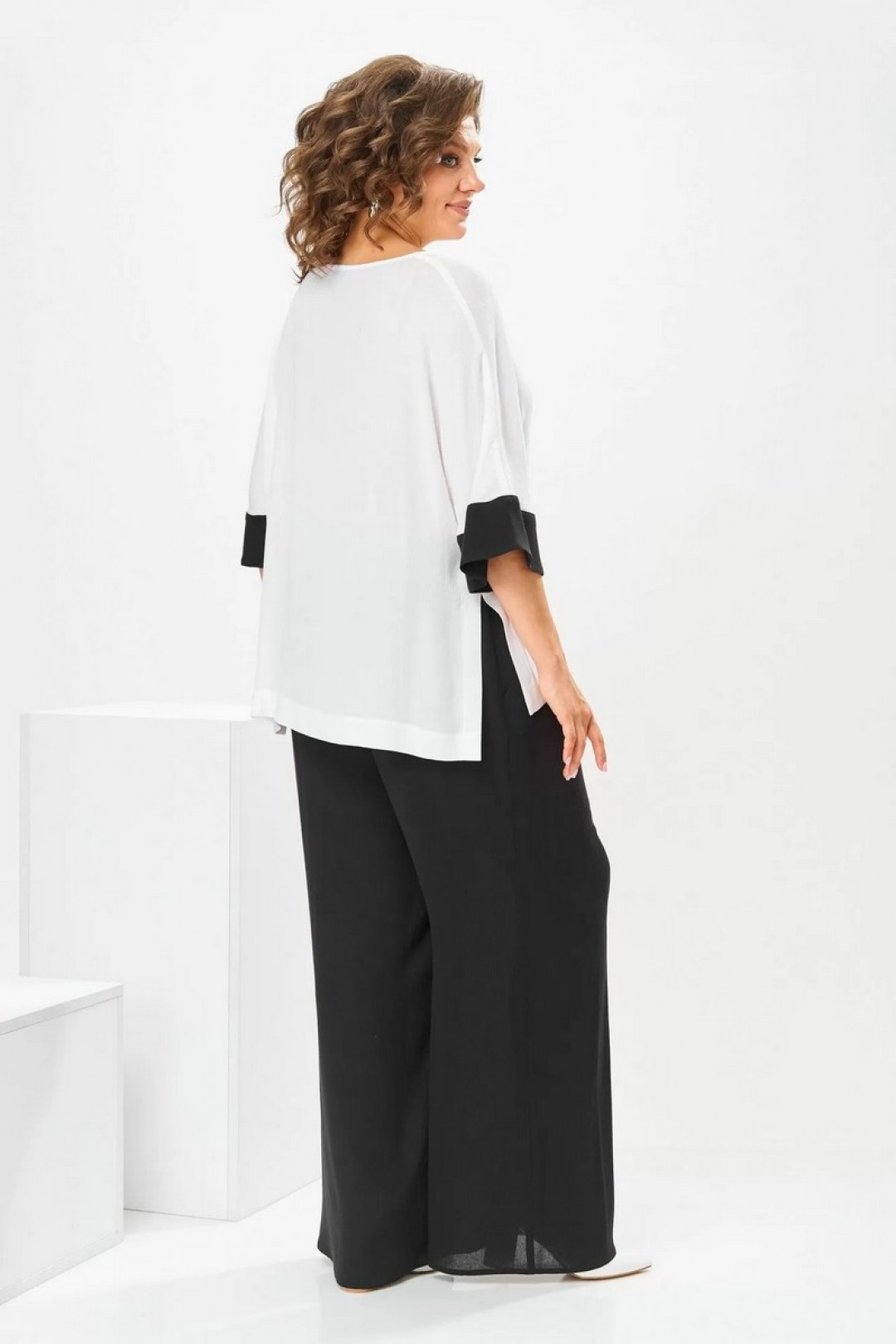 Блузка женская, прямого силуэта, длиной ниже линии бёдер, с фигурным низом "ступенька". Перед цельнокроенный, с настрочным декором слева, с настрочной отделочной тесьмой. Спинка цельнокроенная. Горловина круглая, обточная, без воротника, длиной до локтя с притачной манжетой из отделочной ткани. Боковые швы с разрезами. Блузка без плечевых накладок. Брюки женские, прямые, длинные. Передние половинки с карманами в боковых швах. Задние половинки без конструктивных особенностей. Брючки с притачным поясом, собранным на эластичную тесьму (частично) и закреплённую 2-мя отделочными строчками.