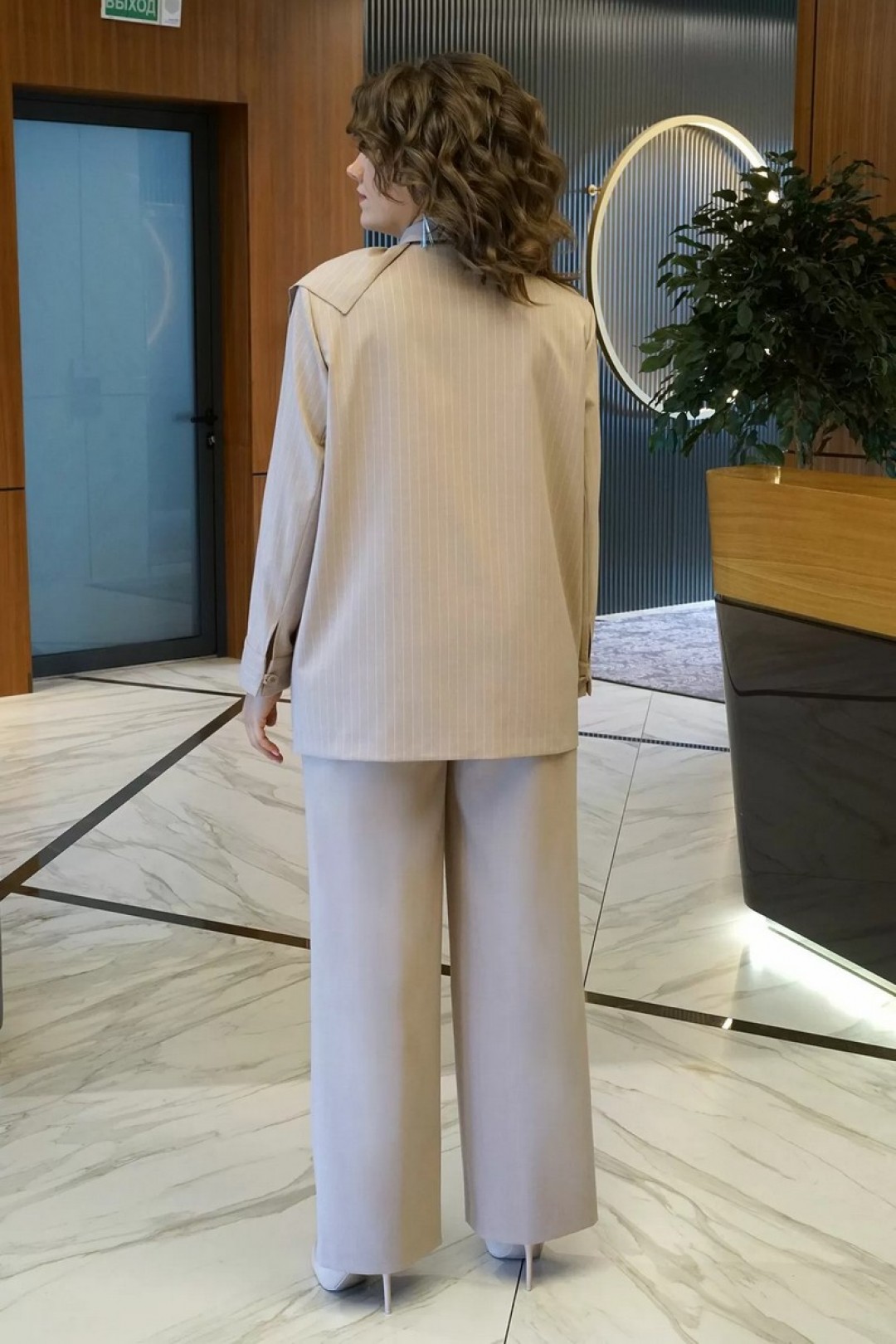Брюки широкие, свободного прямого силуэта, на притачном поясе. Застёжка на тесьму-молнию в среднем шве переда и петлю и пуговицу по поясу.
